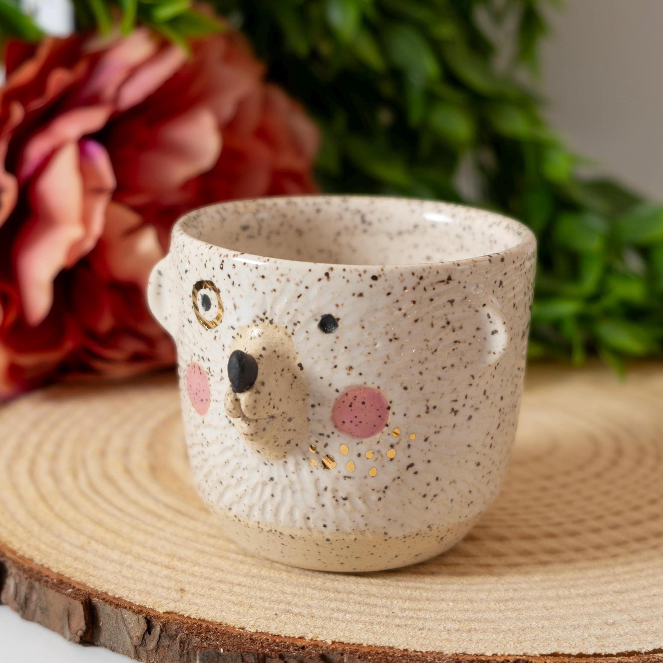 This simple & elegant bear mug features a carved faux-fur textured surface, rosy pink cheeks, & a REAL gold accents. The playful features of this bear cup create a whimsical mood to start your morning on a high note.