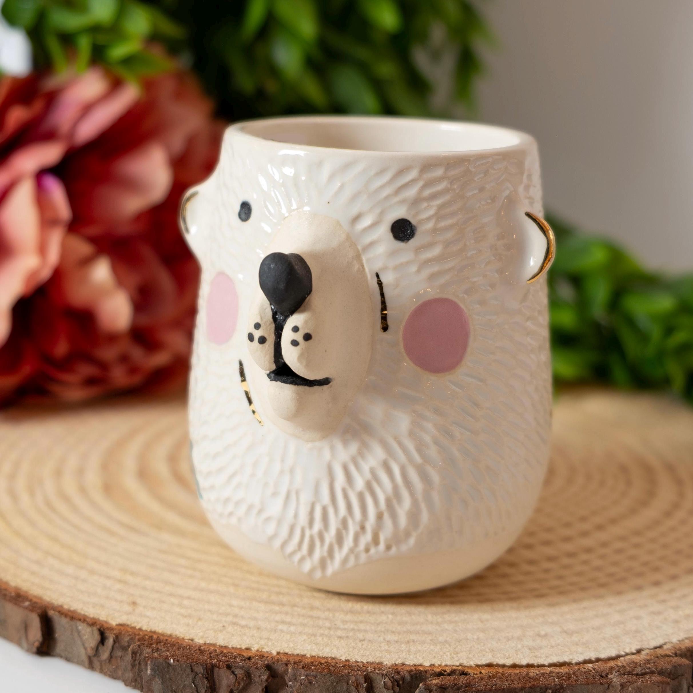 This vibrant & cheery bear mug features a carved faux-fur textured surface, rosy pink cheeks, & a REAL gold accents. The colorful features of this bear cup create a super cute vibe to start your morning with.