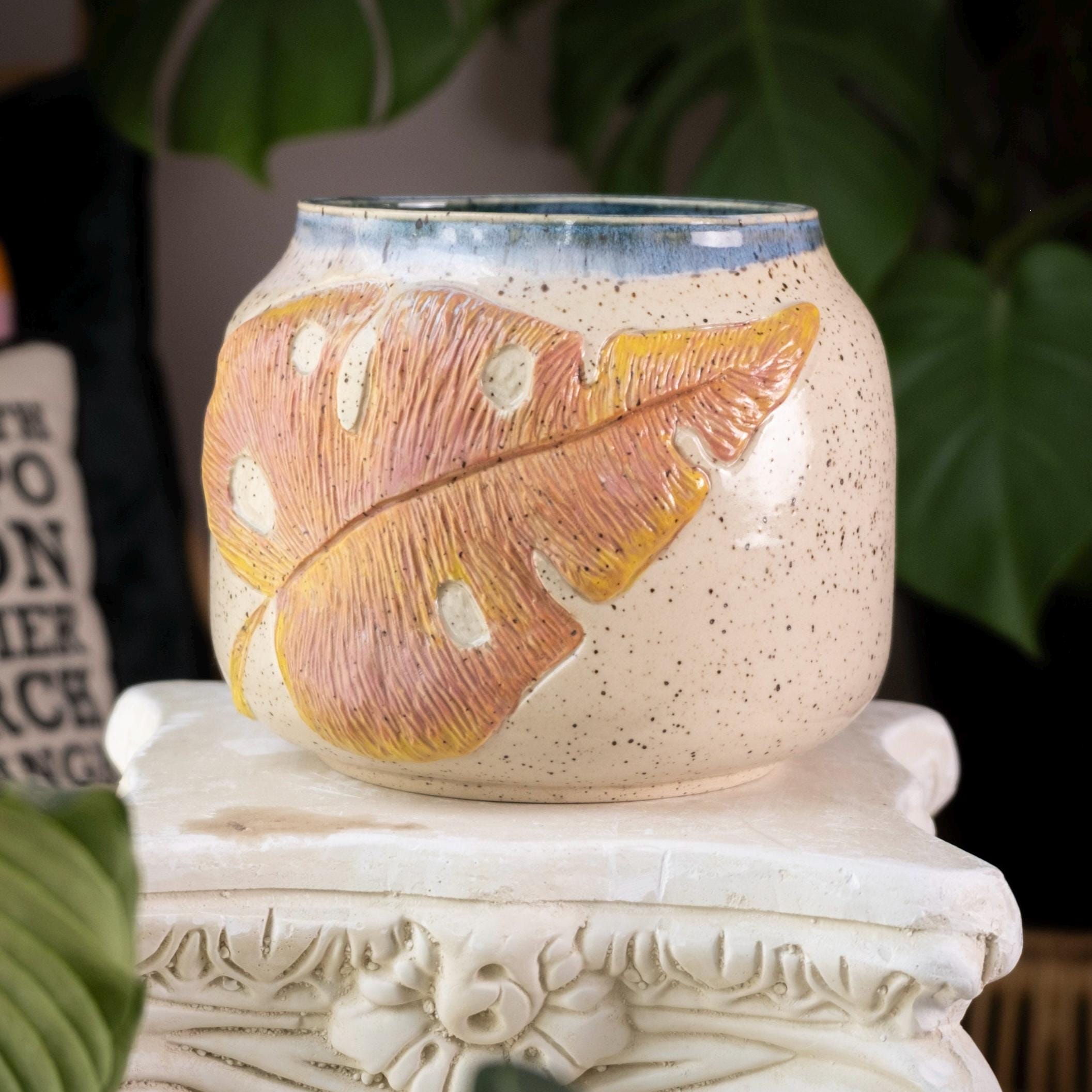 Large vase / jug with 1 carved Monstera leaf in a tropical pink colorway. The leaf has high and low points, undulating above and below the surface level of the pot. Pink, orange, and yellow subtle shading is dreamy, making this a truly beautiful piece for any plant lover to enjoy. Fill it with lush greenery for a simple & modern palette, or add colorful blooms for a more wild & eclectic look.