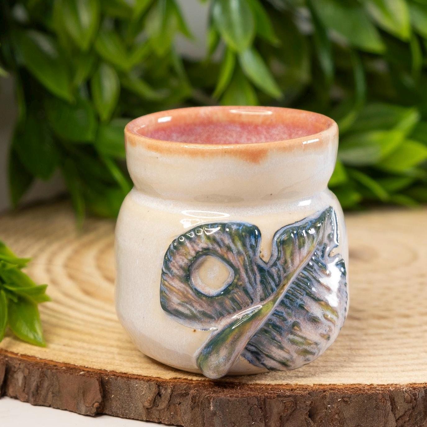 🌿 Cute relief carved ceramic shot glass with watercolor shaded green Monstera leaf. LISTING OPTION 4 (See Image Guide)