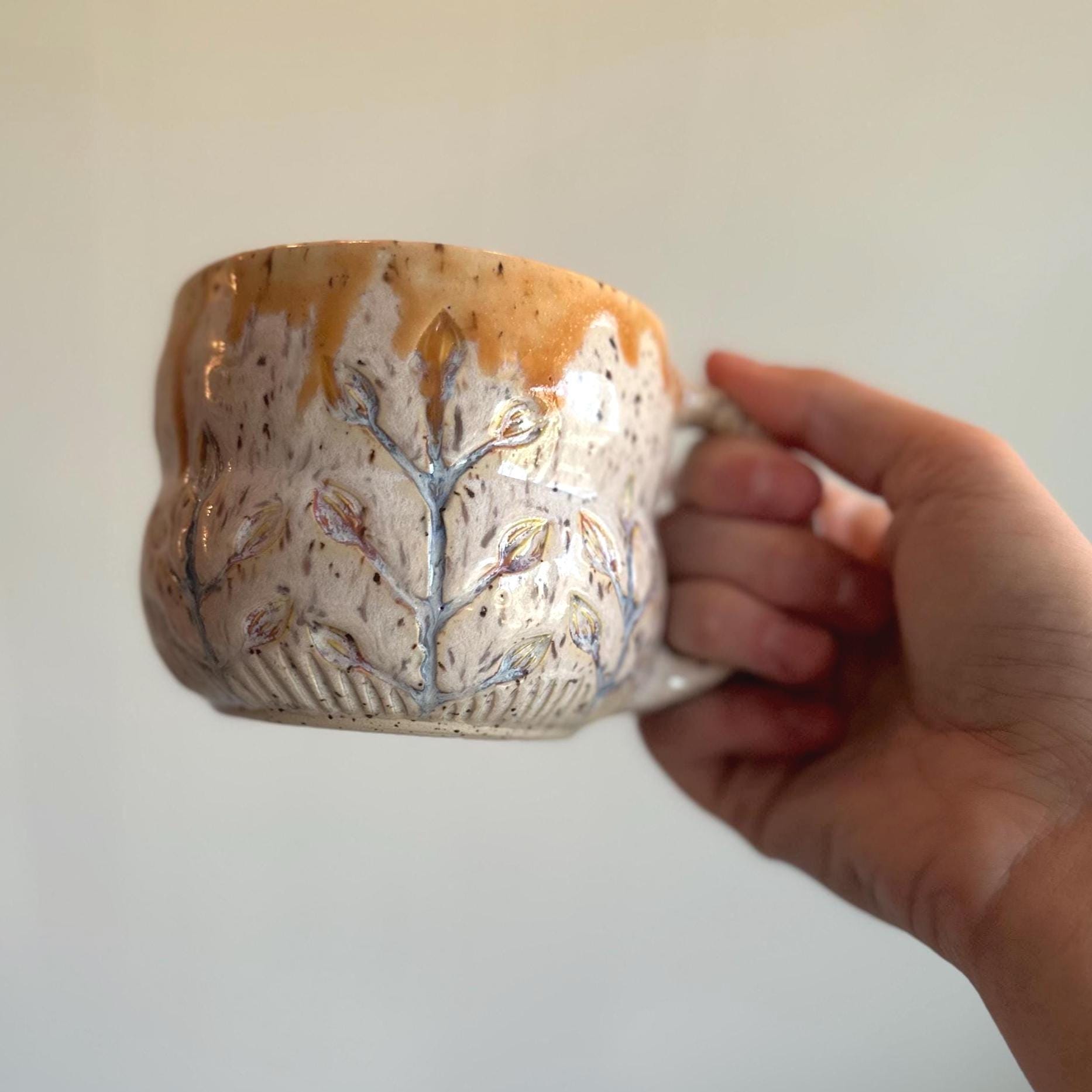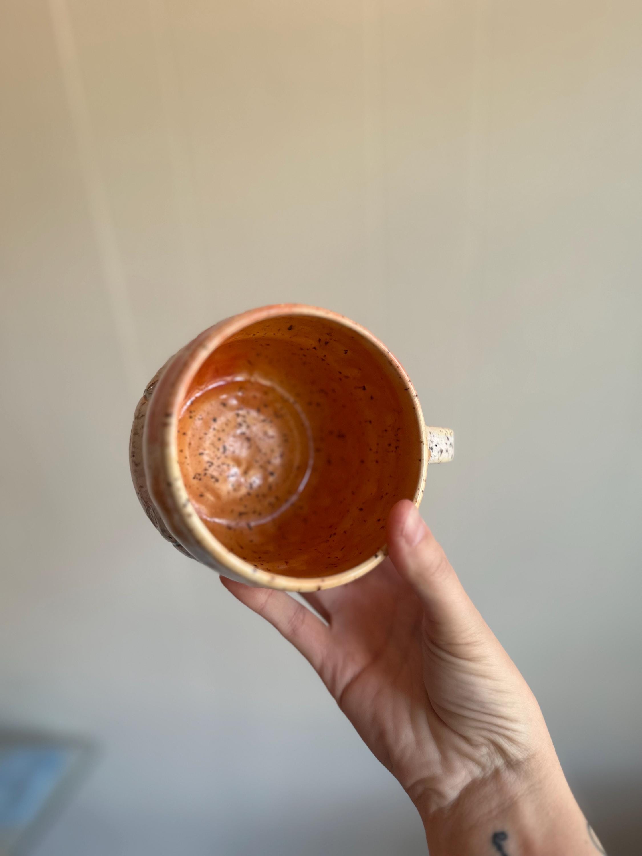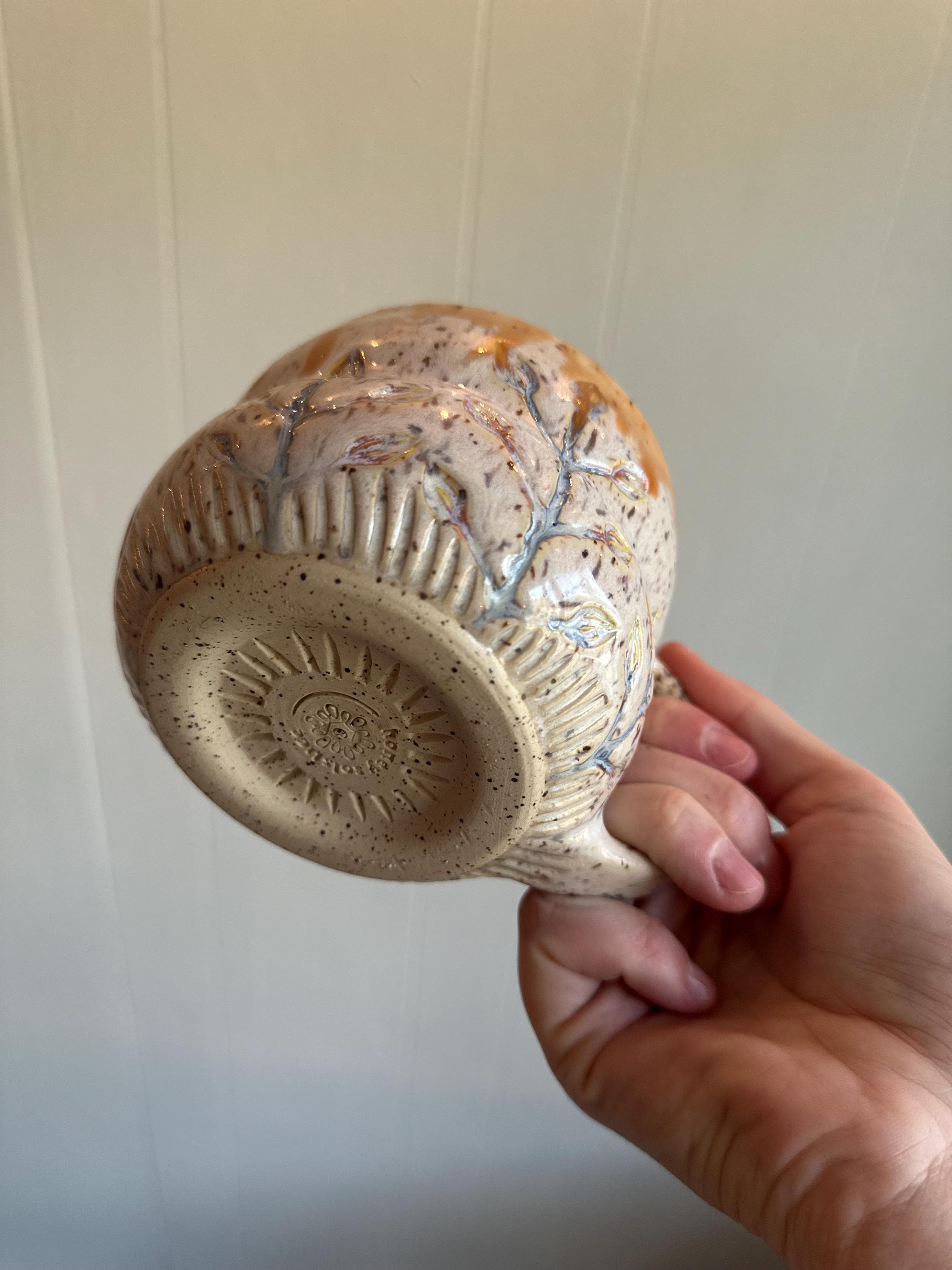 This whimsical mug planter features a geometric carved botanical pattern around the circumference, a textured bottom, and melty pink/orange glaze. This mug is NOT food safe due to the inner glaze texture, but makes for an interesting planter for a succulent or cactus that doesn't require drainage.