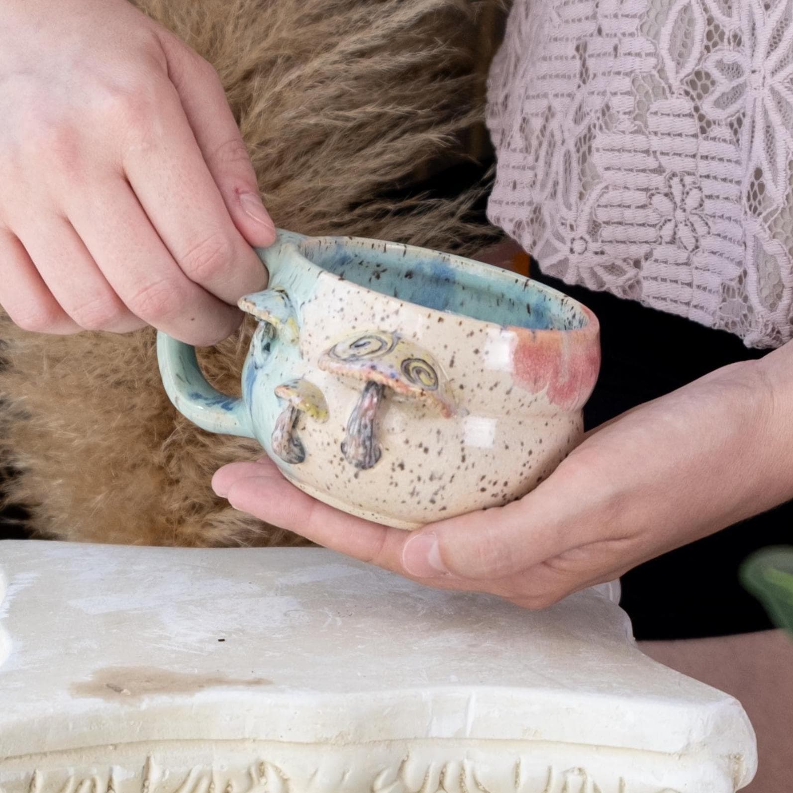 🍄 Whimsical Mushroom Mug with 3D carved stems and caps in a psychadelic style.