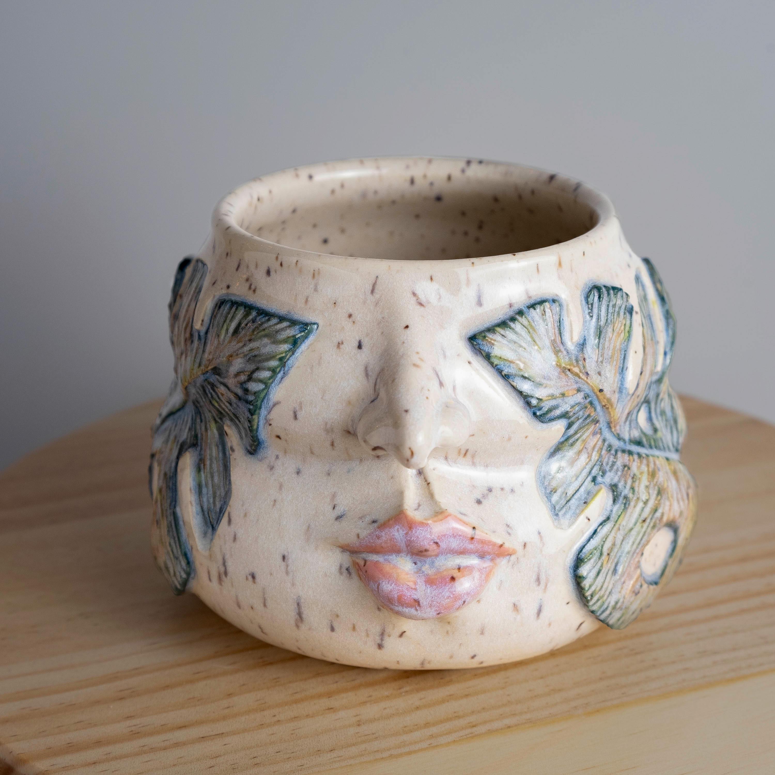 This cheeky goddess is hand thrown from scratch on the wheel, then sculpted and carved to create a beautiful, whimsical planter! It features 2 large sculpted Monstera leaves, a petite nose, and pouty mouth - perfect for the eclectic plant person in your life! The leaf is textured and colored in a watercolor aesthetic, balanced by the glossy smooth surface surrounding it.