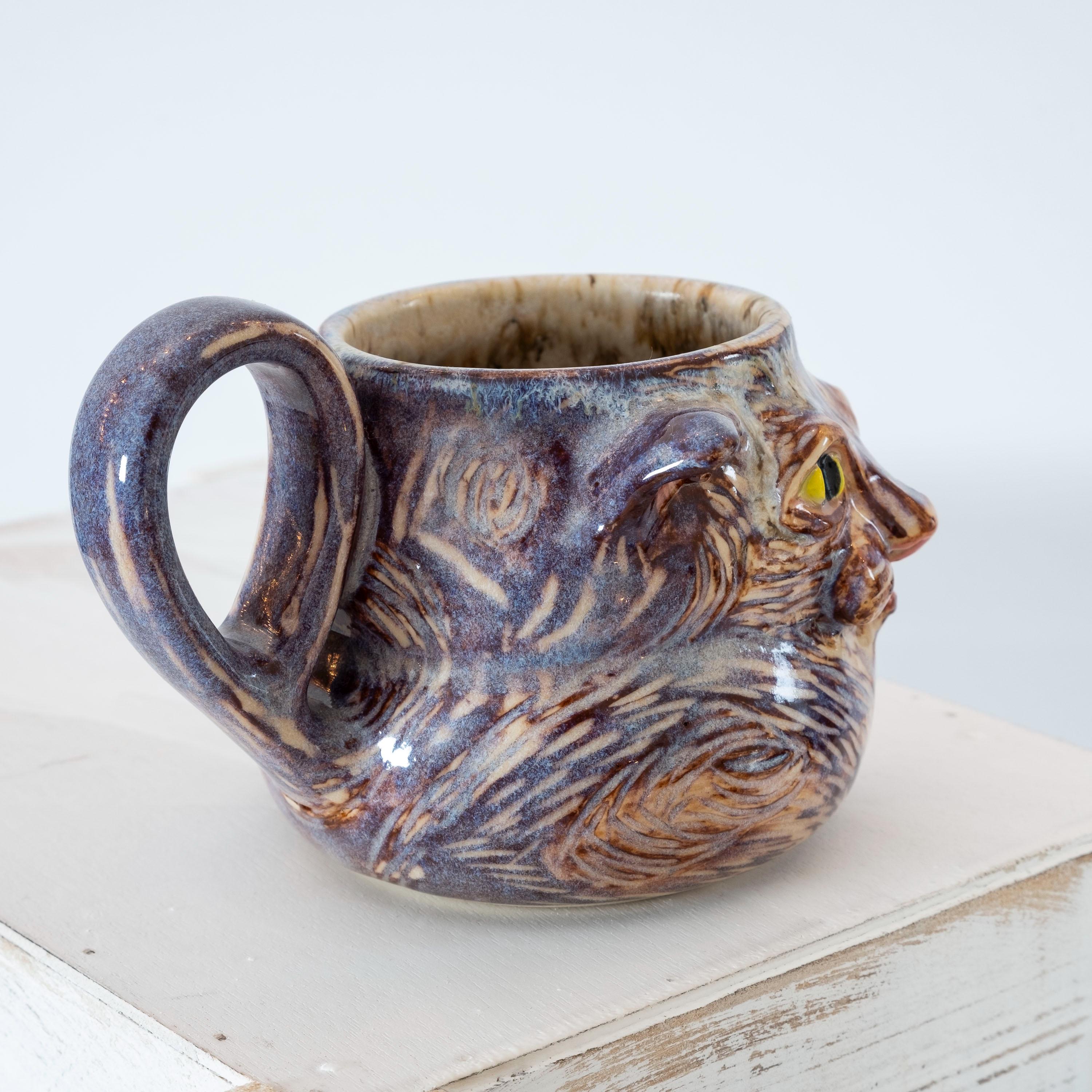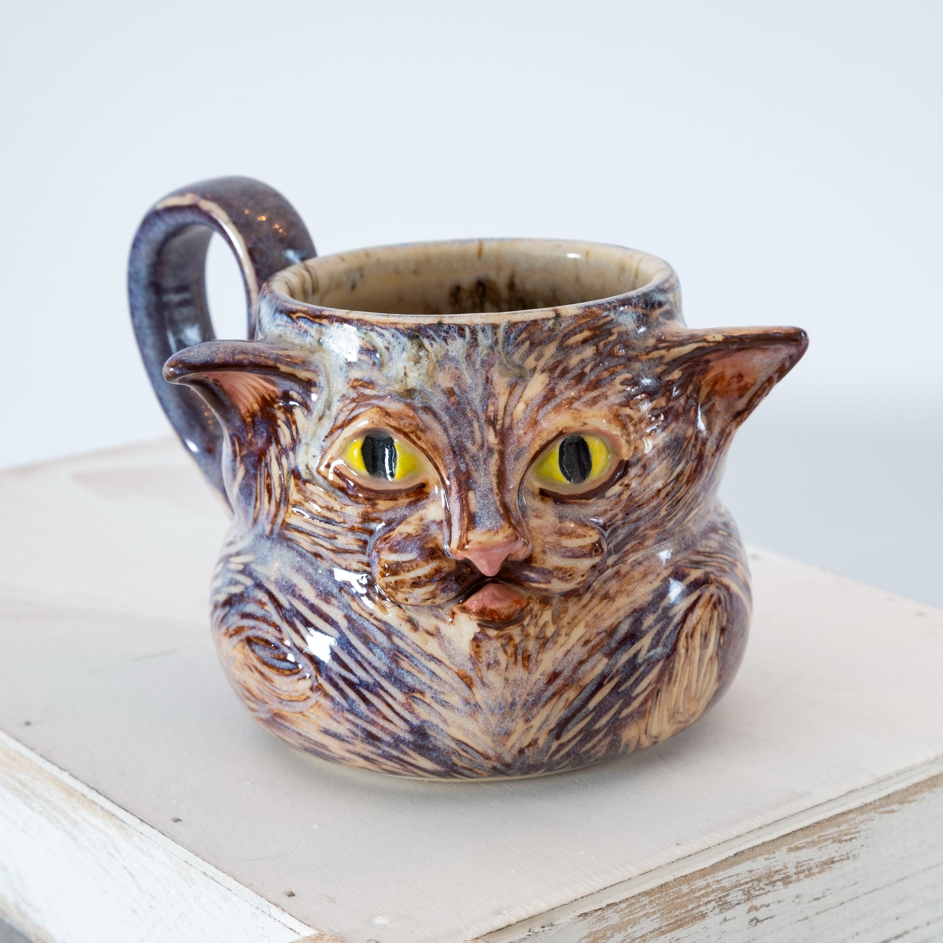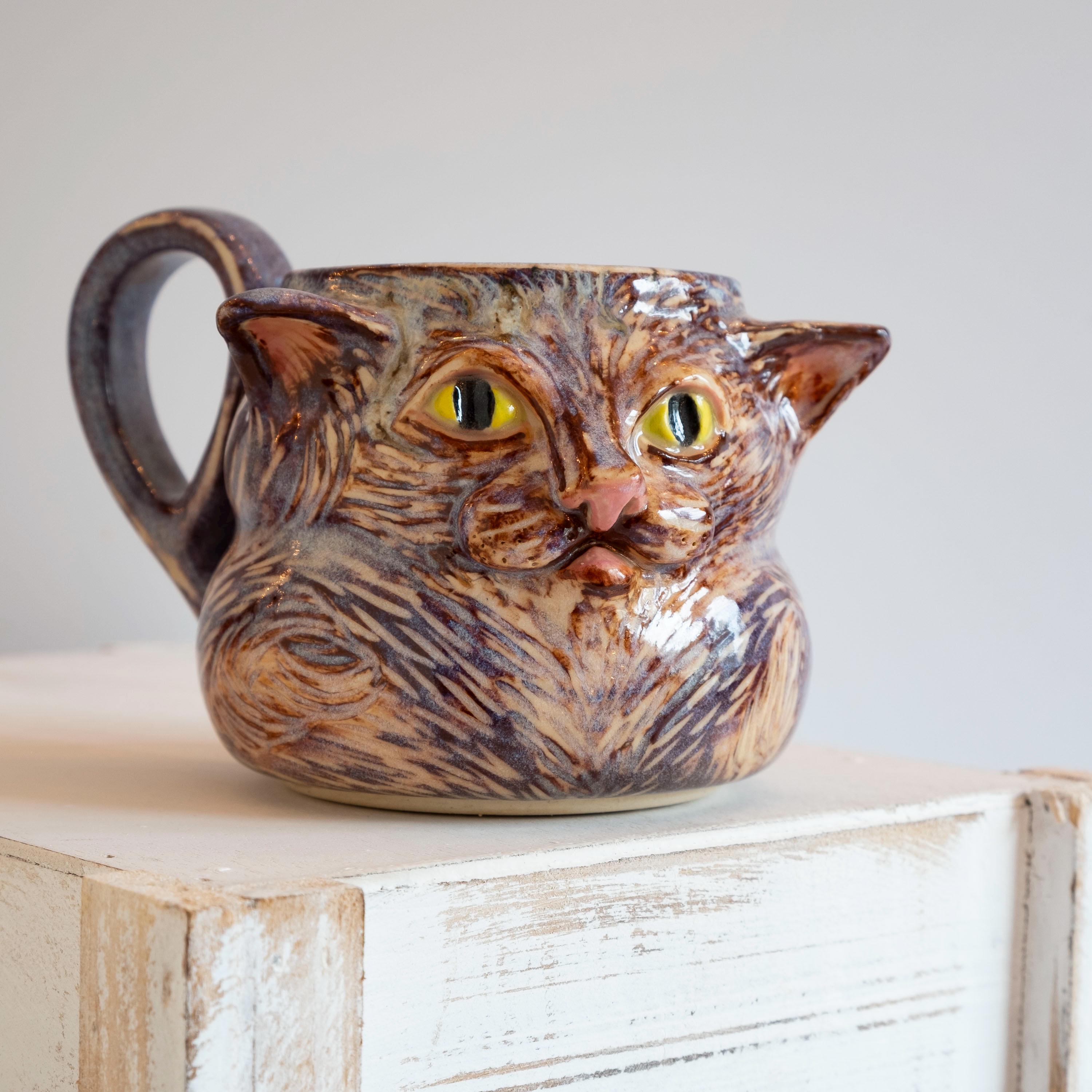 MEOW! 🐈 This super sweet kitty cat mug is thrown on the wheel and then sculpted by hand to create an adorable and whimsical little friend. The calico glaze has a ton of variation in it and is beautiful. This is the perfect gift for your bestie who loves feline friends (or yourself). Look at those eyes!!! With the earth tones and fun liner glaze, it's giving 'delicious cookie jungle cat' and you can't tell me otherwise.
