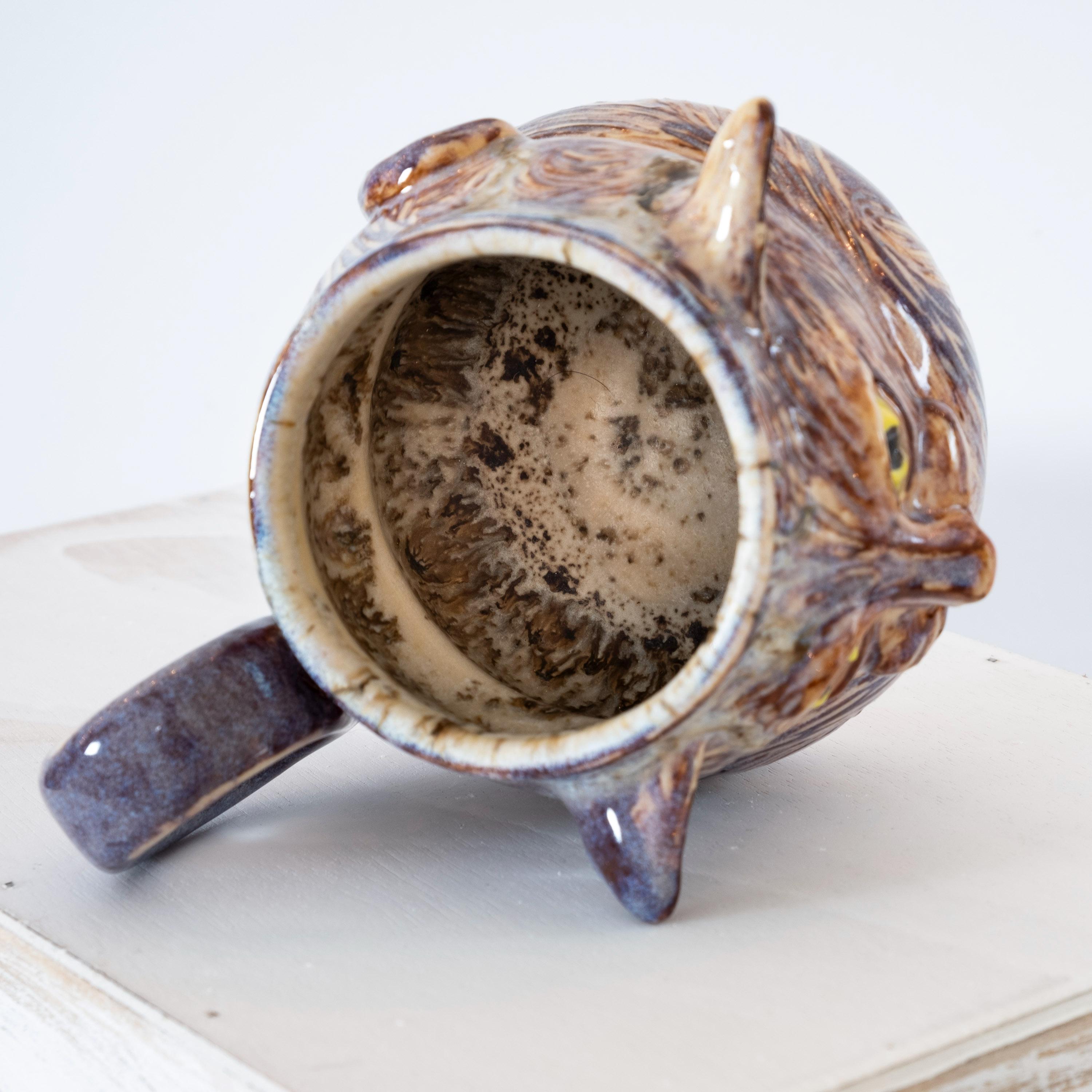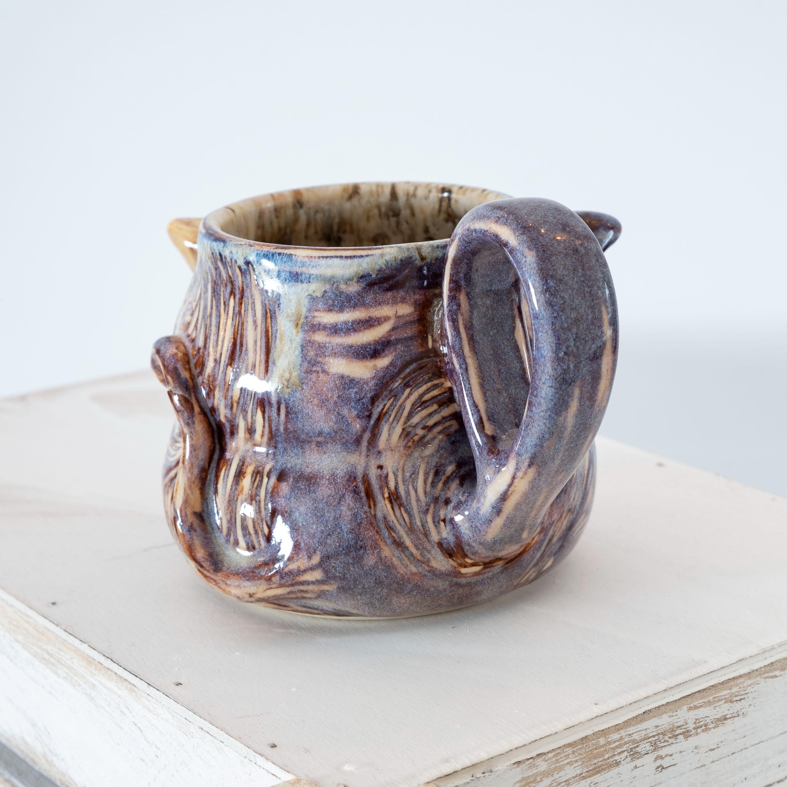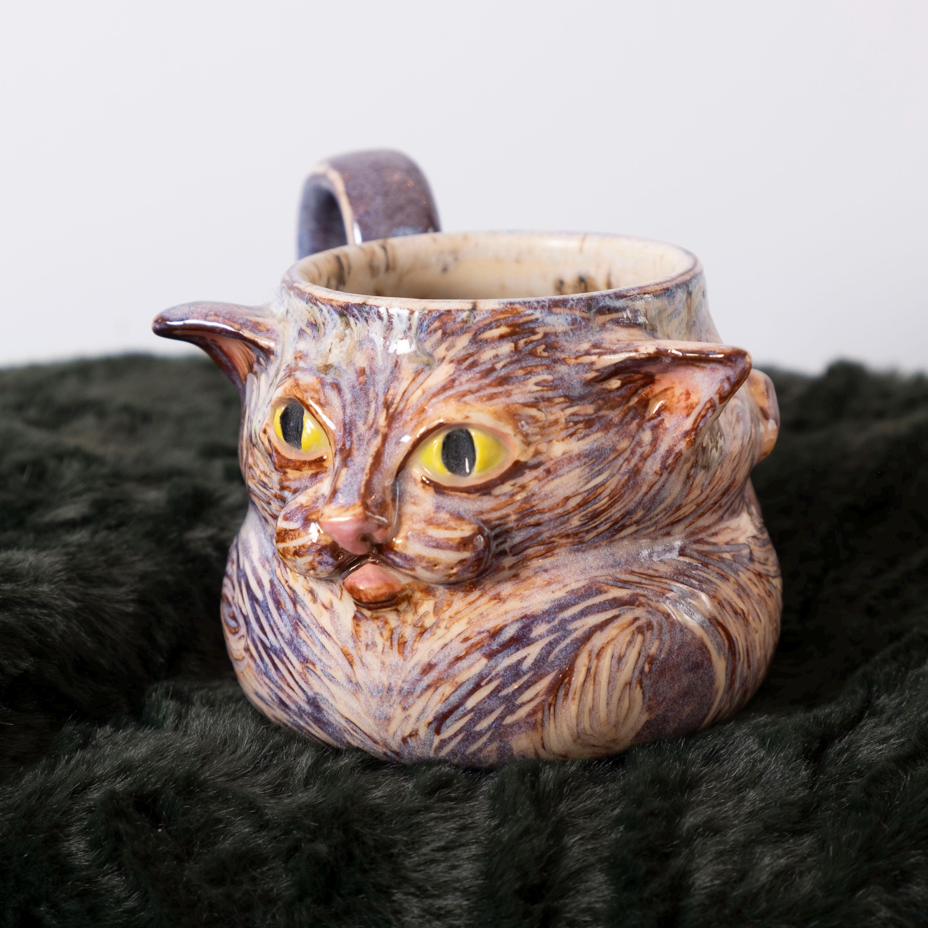 MEOW! 🐈 This super sweet kitty cat mug is thrown on the wheel and then sculpted by hand to create an adorable and whimsical little friend. The calico glaze has a ton of variation in it and is beautiful. This is the perfect gift for your bestie who loves feline friends (or yourself). Look at those eyes!!! With the earth tones and fun liner glaze, it's giving 'delicious cookie jungle cat' and you can't tell me otherwise.