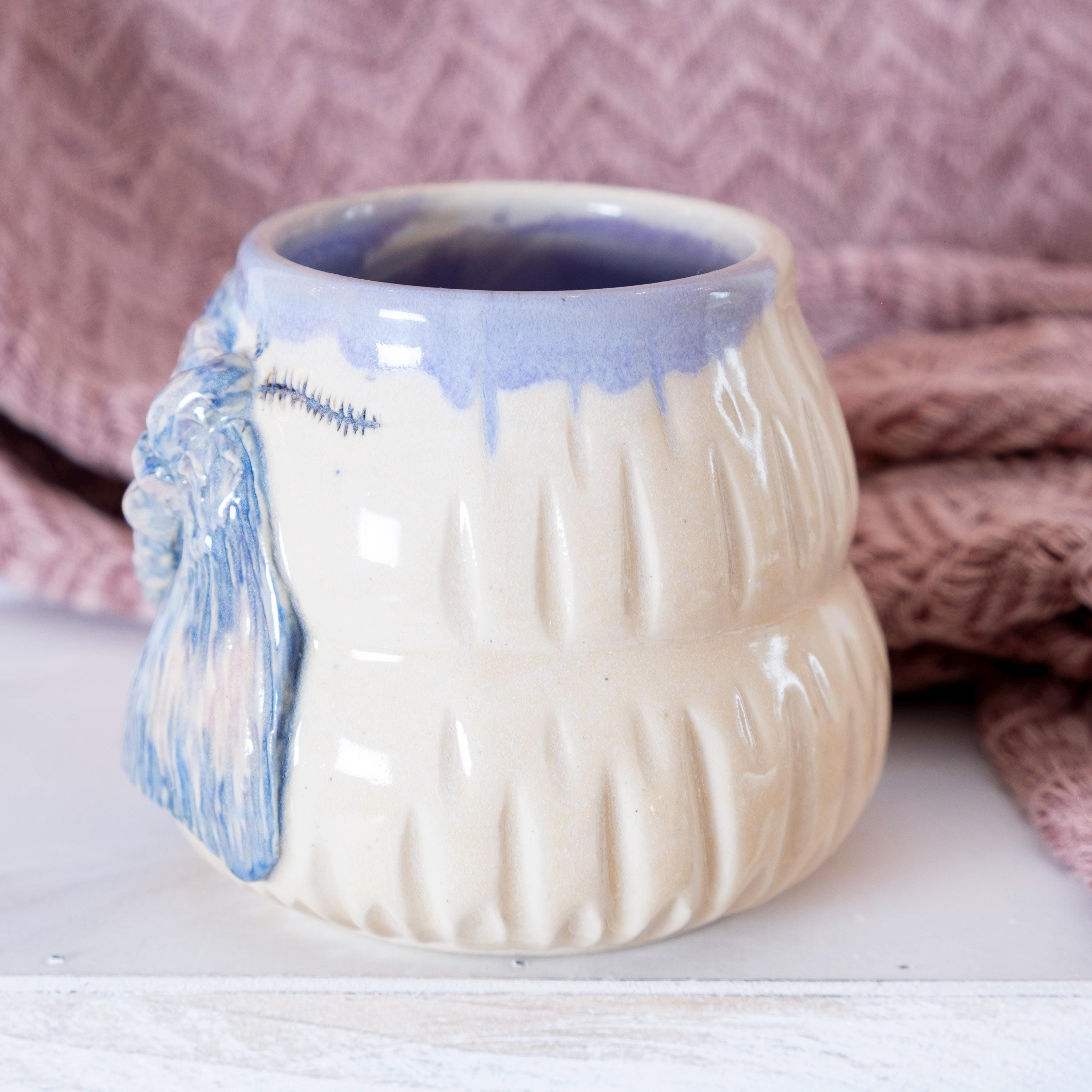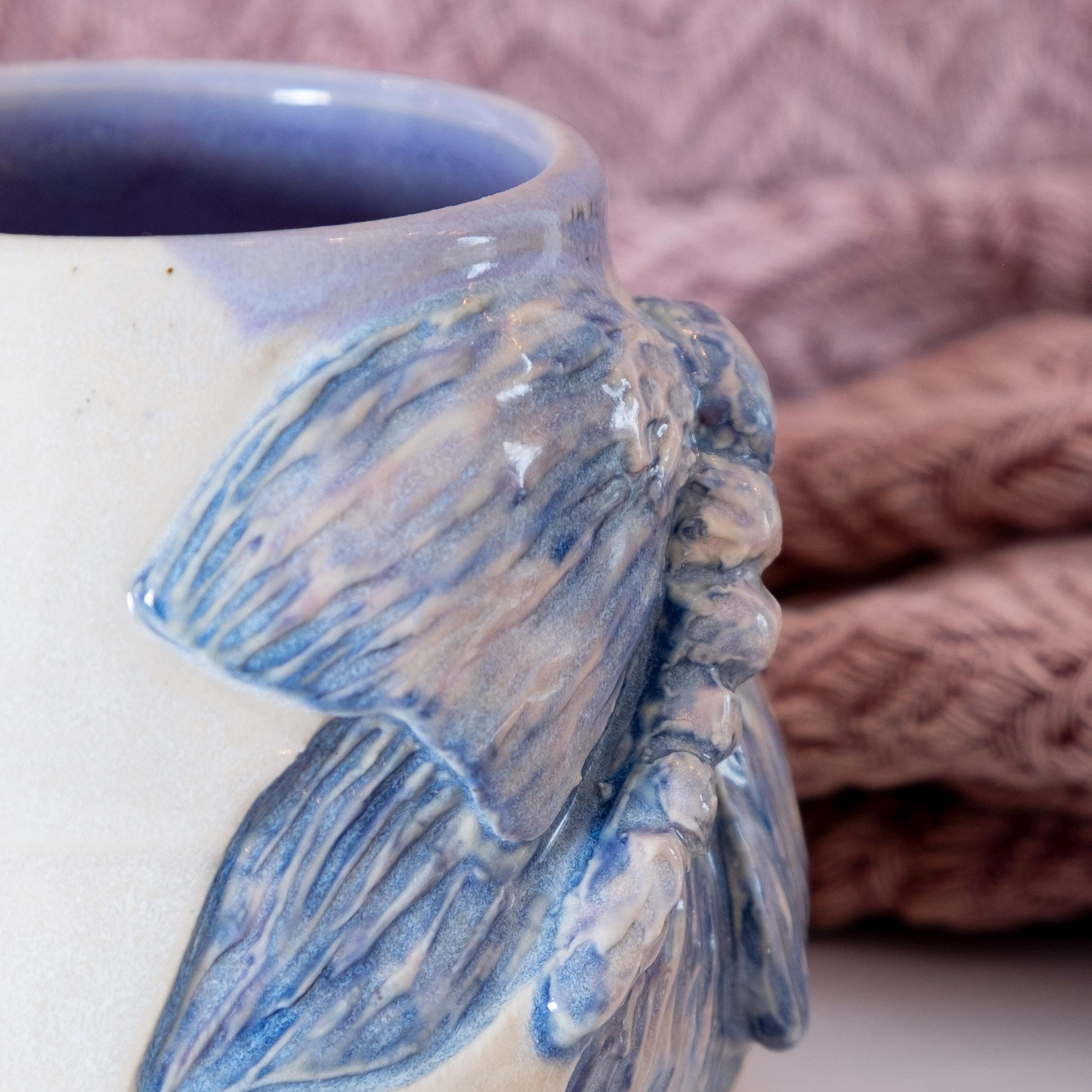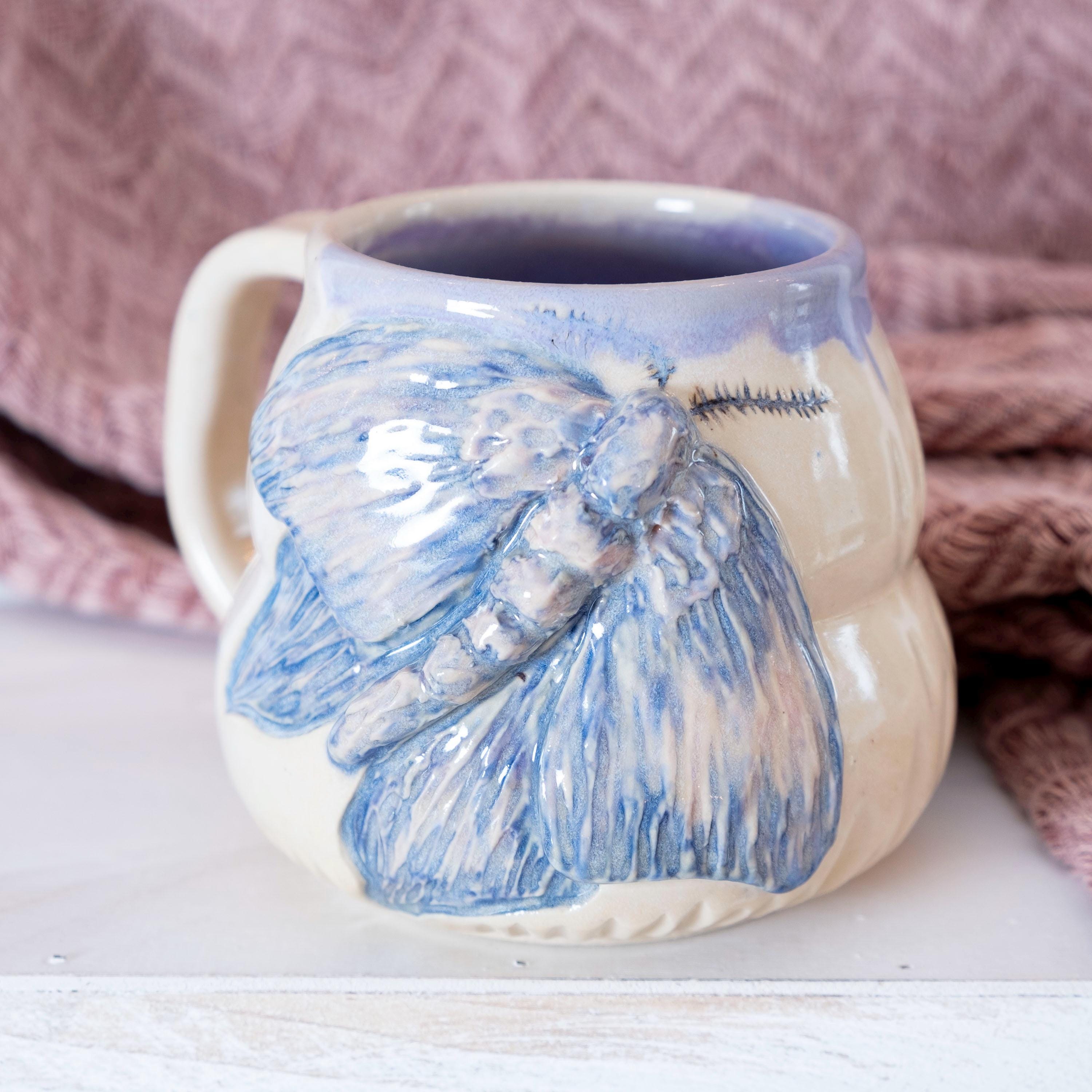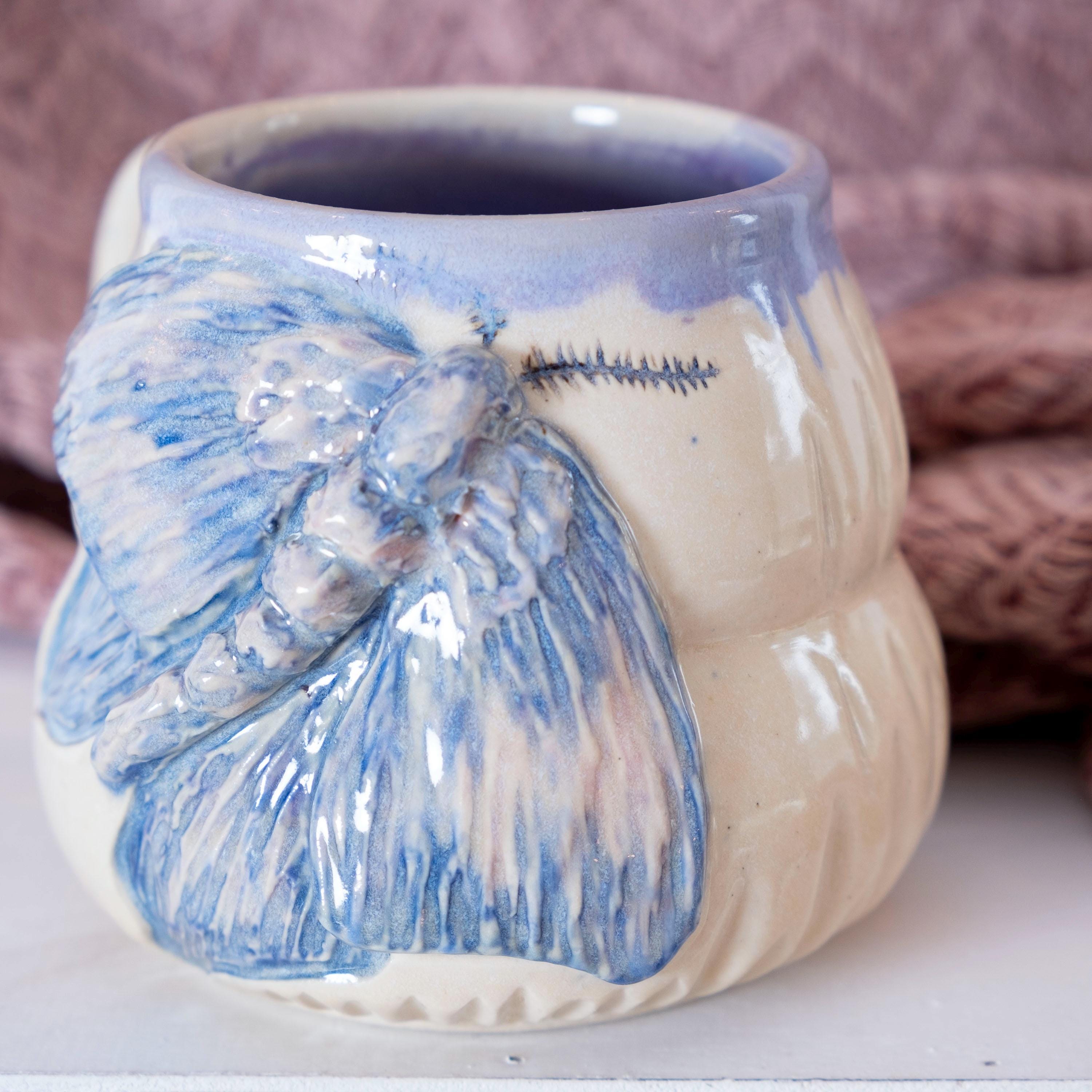 🦋 This oversized etherial moth mug is thrown on the wheel and then sculpted by hand to create a beautiful piece of art that is sure to brighten your day. The purple glaze has a ton of variation in it, which adds to the relief carving of the moth. This is the perfect gift for your bestie who loves bugs and nature (or for yourself). She's beautiful and witchy.
