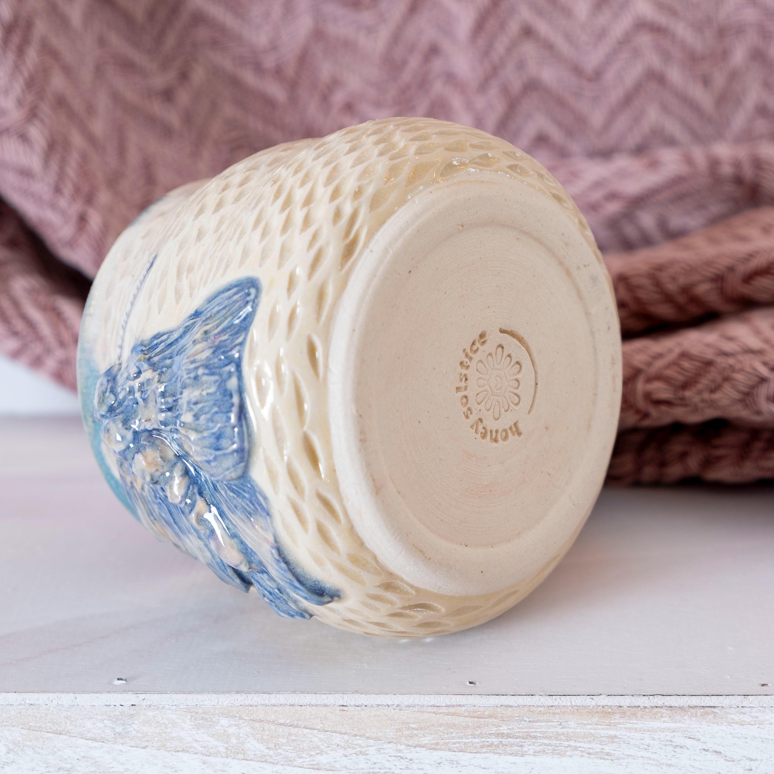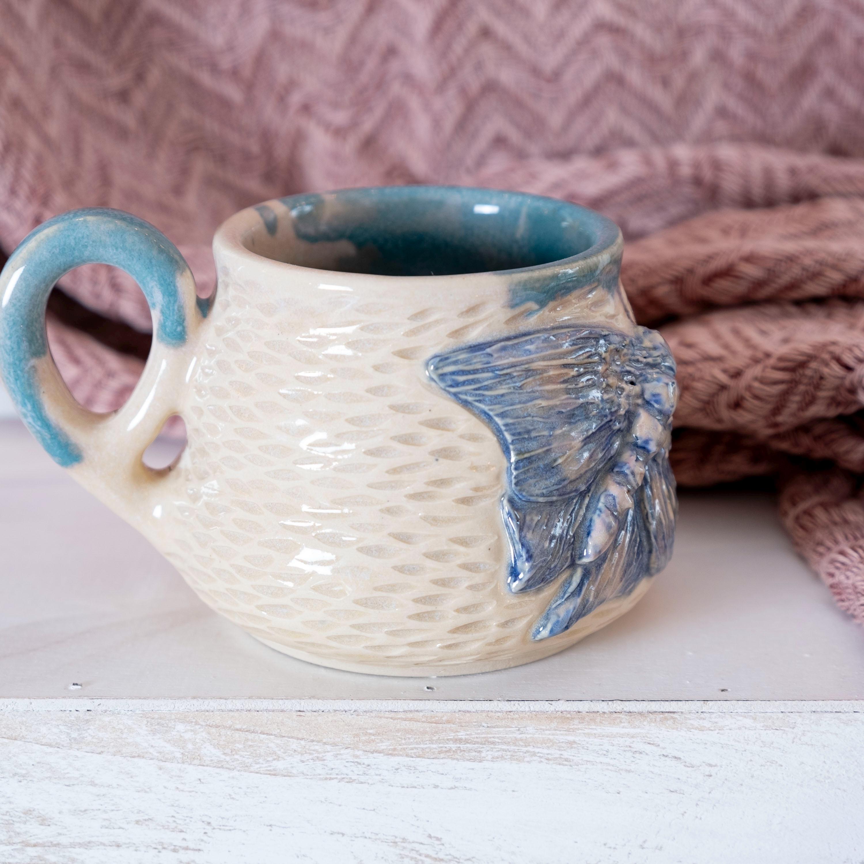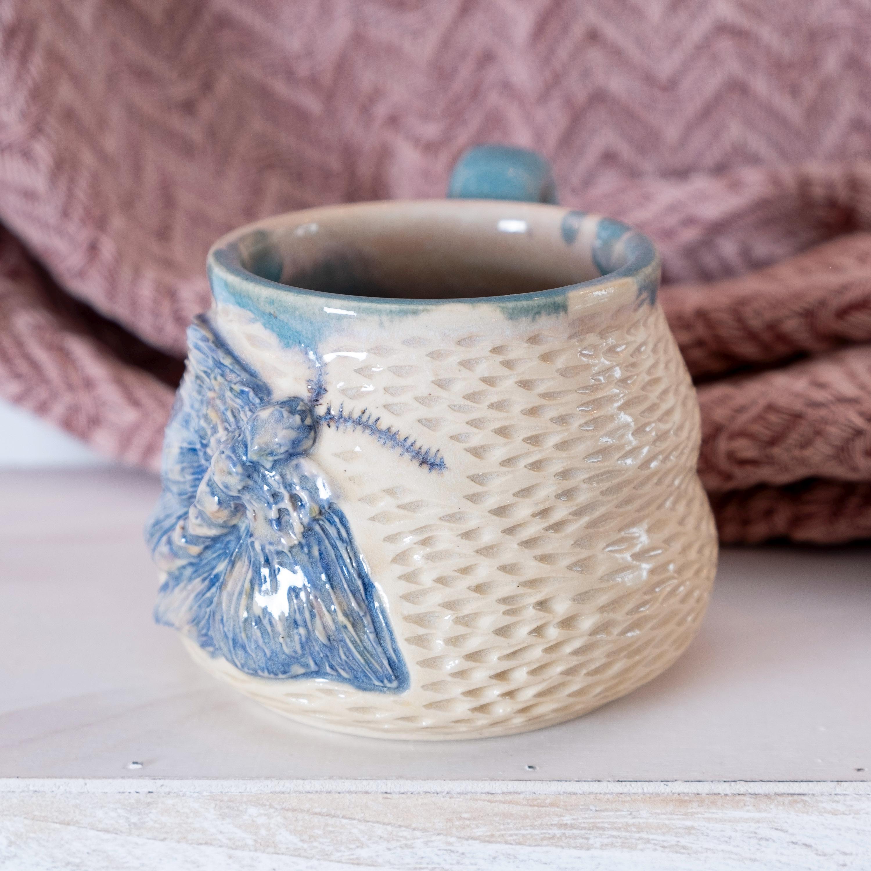 🦋 This perfectly sized etherial moth mug is thrown on the wheel and then sculpted by hand to create a beautiful piece of art that is sure to brighten your day. The blue glaze has a ton of variation in it, which adds to the relief carving of the moth. This is the perfect gift for your bestie who loves bugs and nature (or for yourself). She's beautiful and so satisfying to hold in your hands - look at that texture!