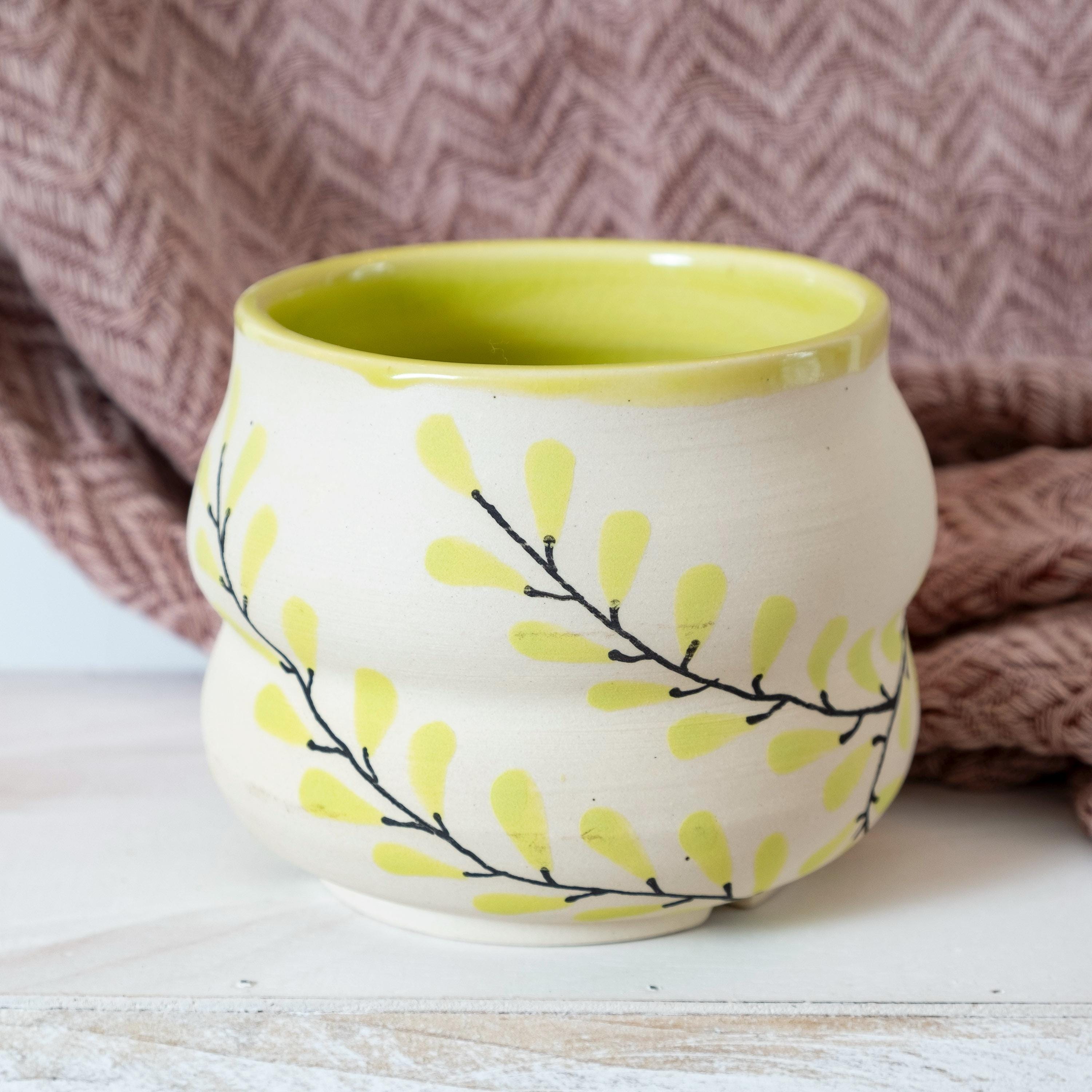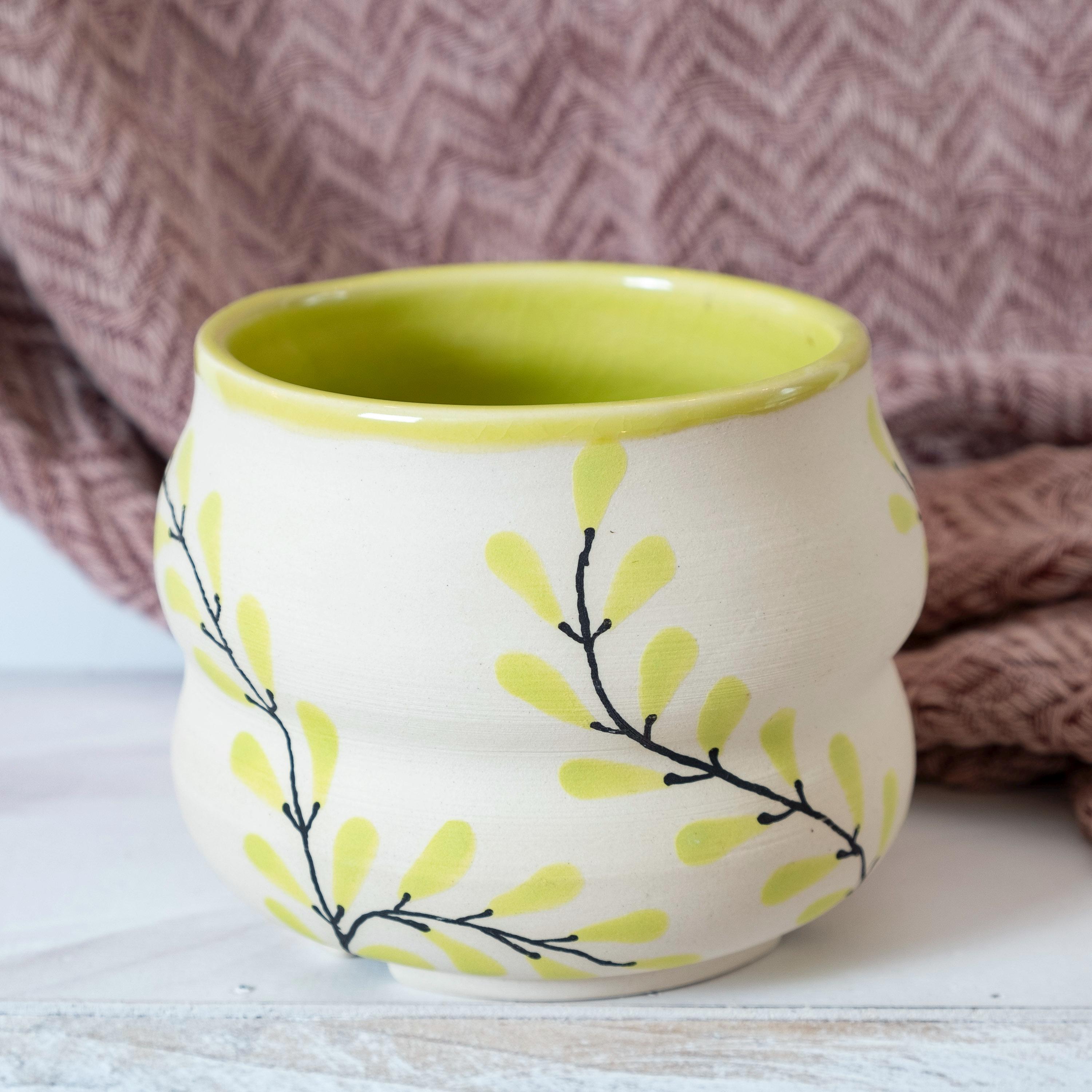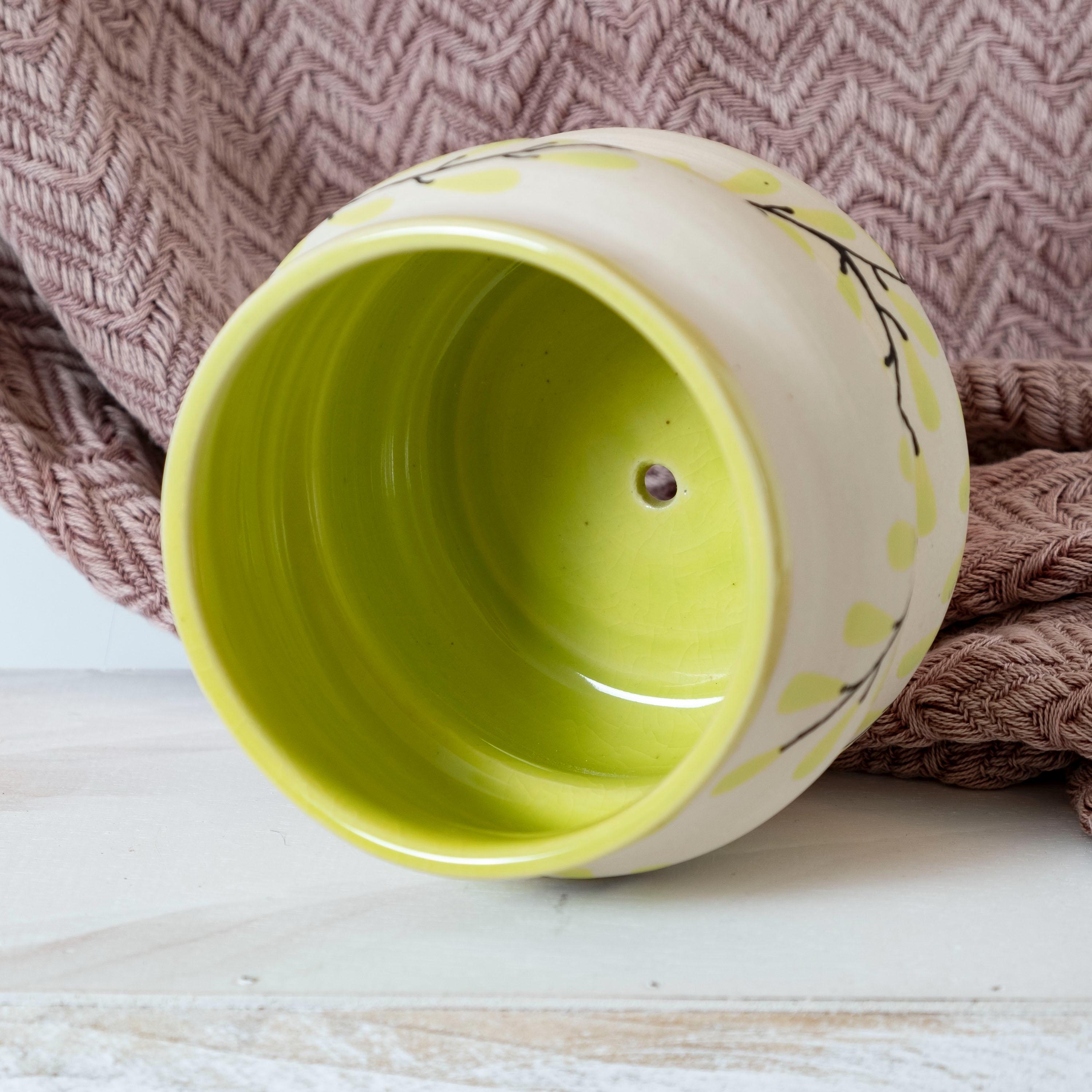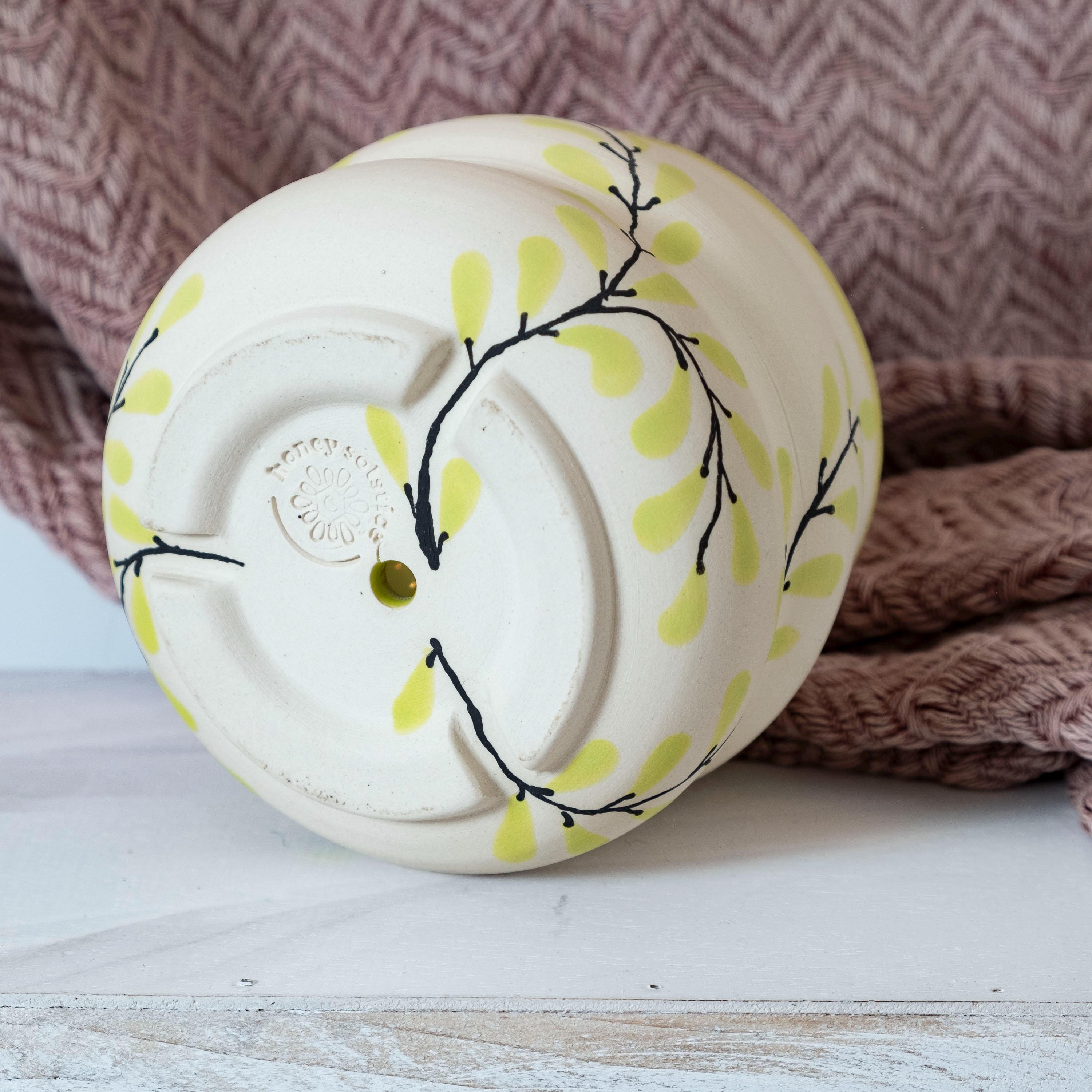 ๐ธ Whimsical, cute ceramic planter with drainage hole & floral leafy design. The exterior clay is left raw, which will look gorgeous on a bookshelf.