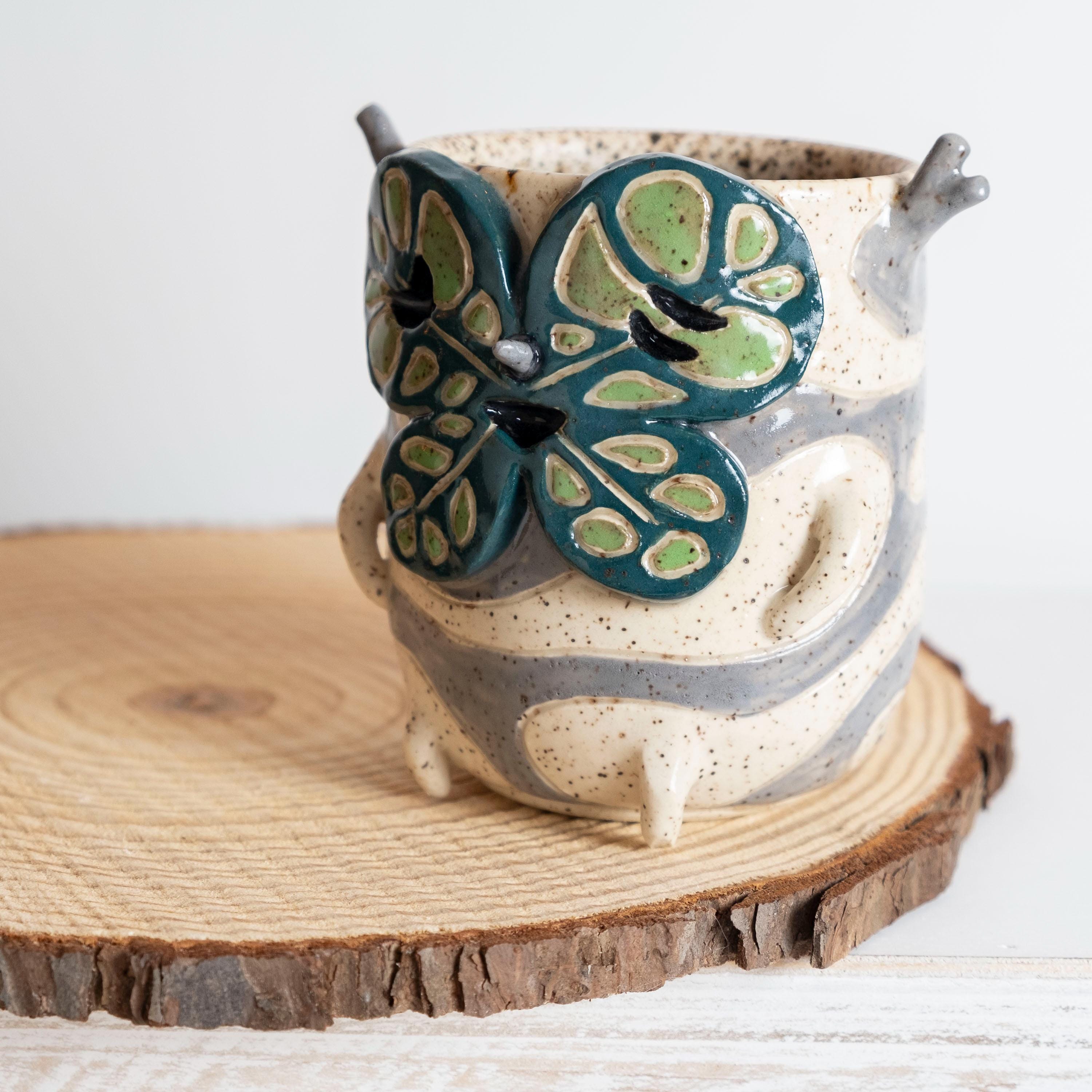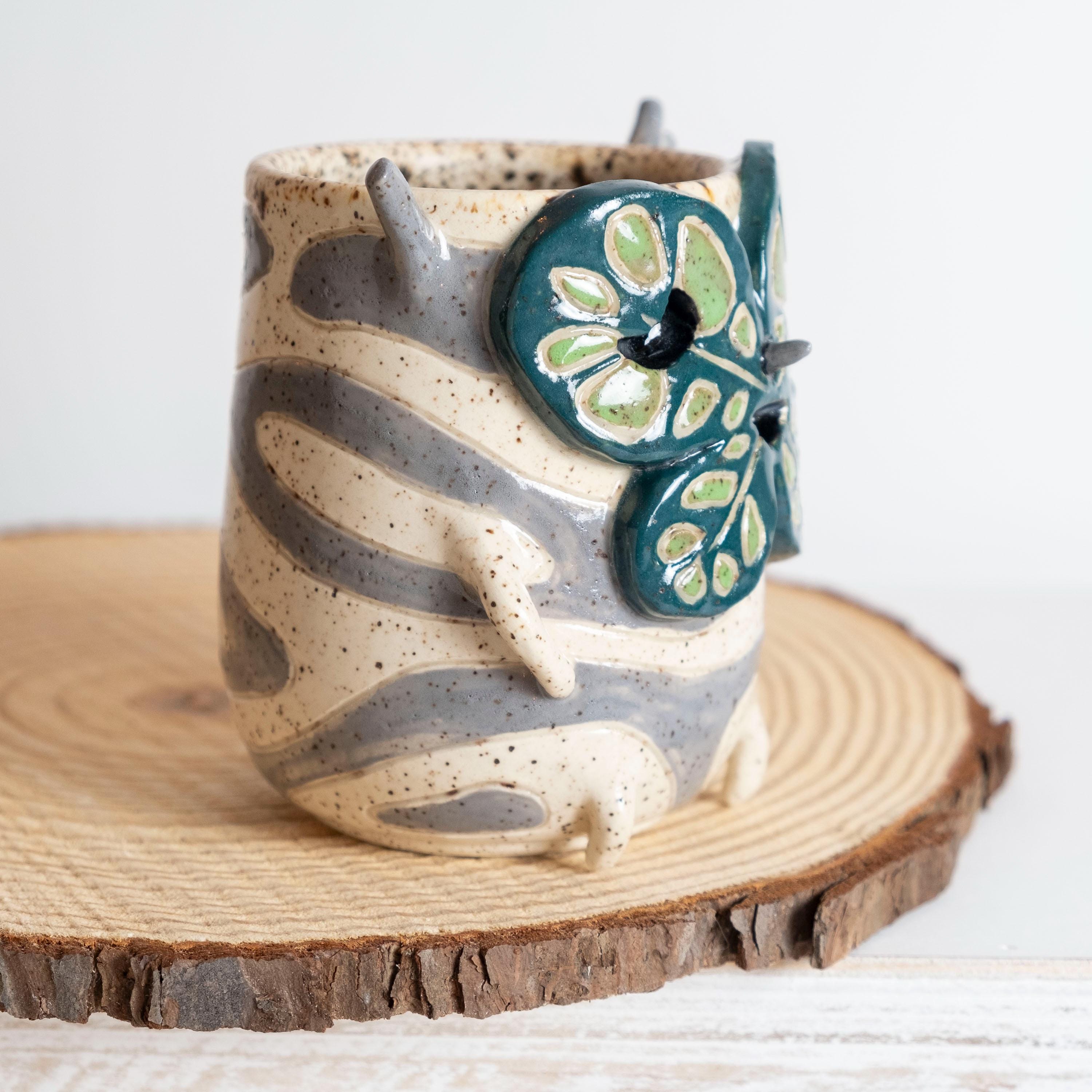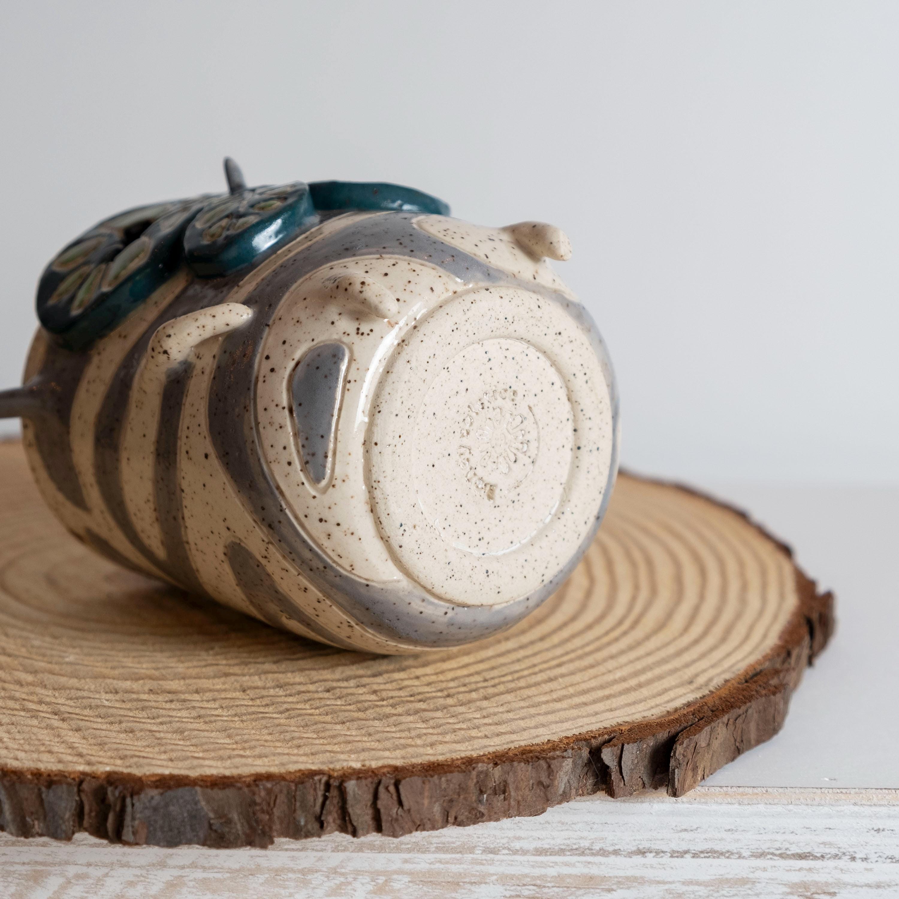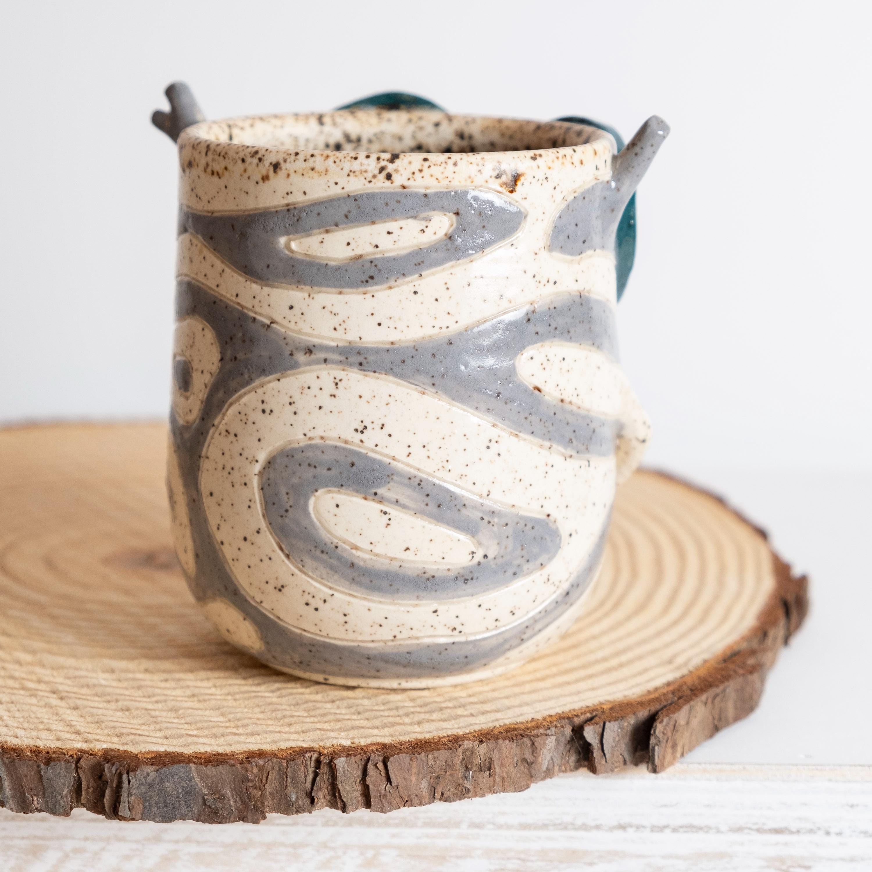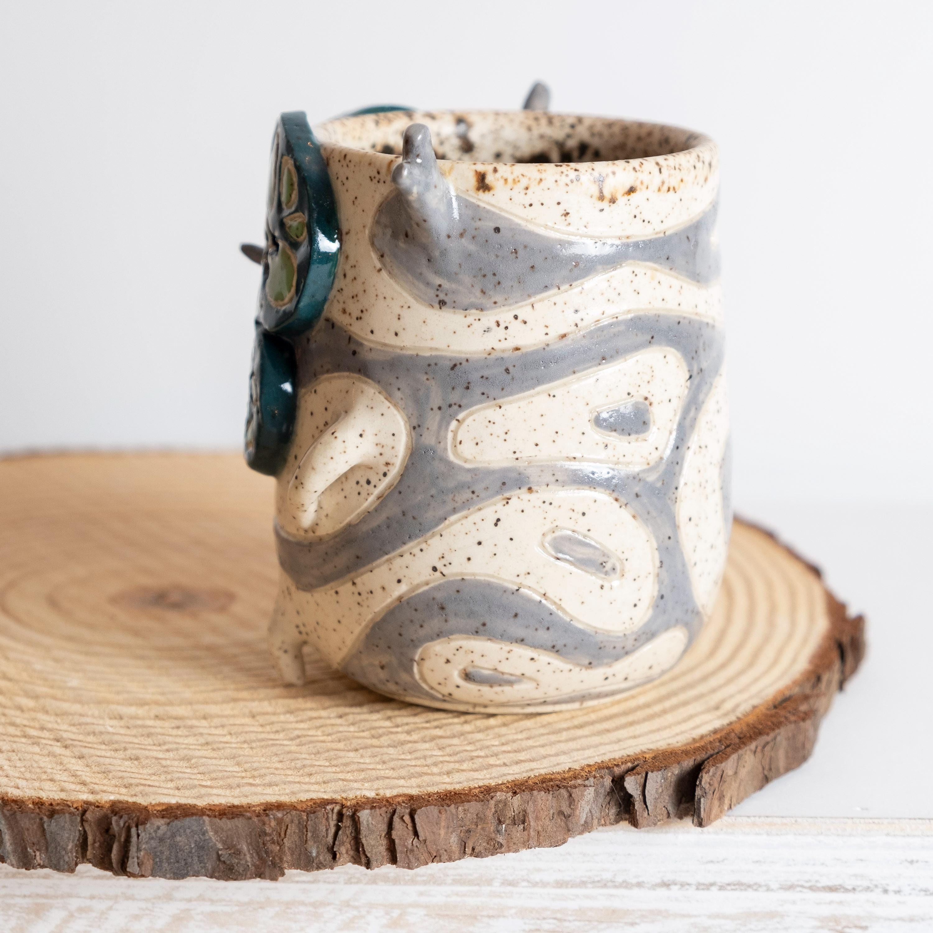 This curious fellow is hand thrown from scratch on the wheel, then sculpted and carved to create the cutest Korok tumbler! He has 2 nubby arms and legs, some nobby appendages, and a little leafy mask held on by a pointed nose. His carved texture is two-toned grey and white, lined with a speckled glaze that looks like chunky potting mix. 🍄🟫