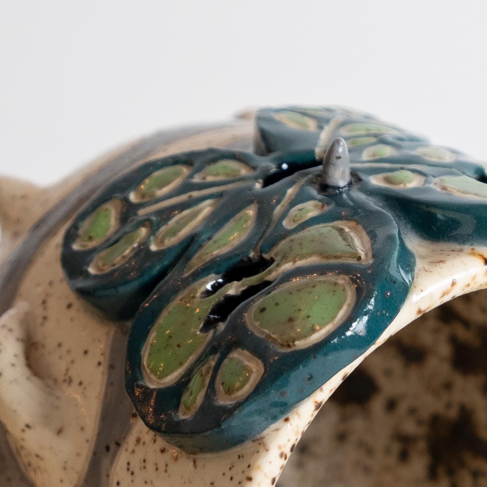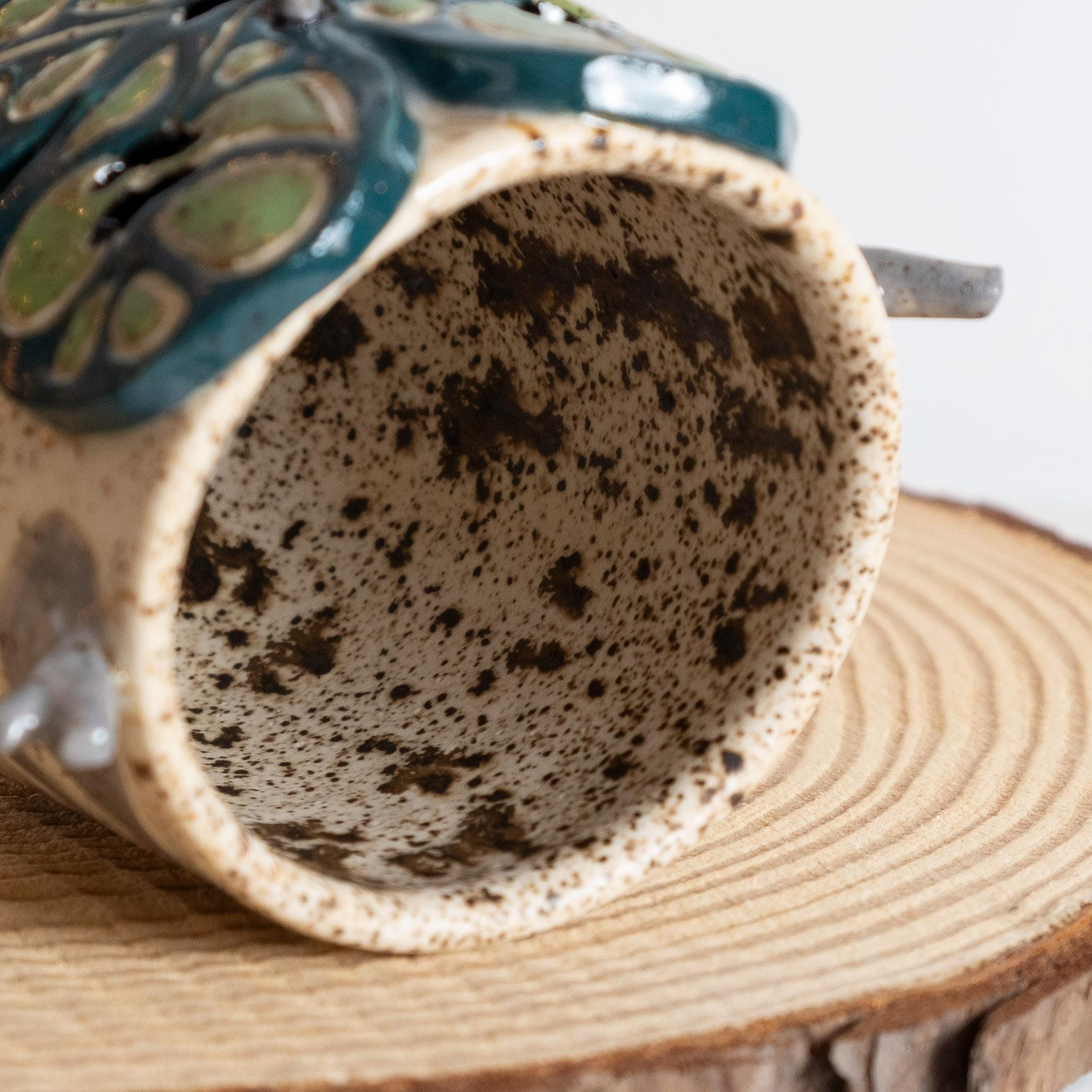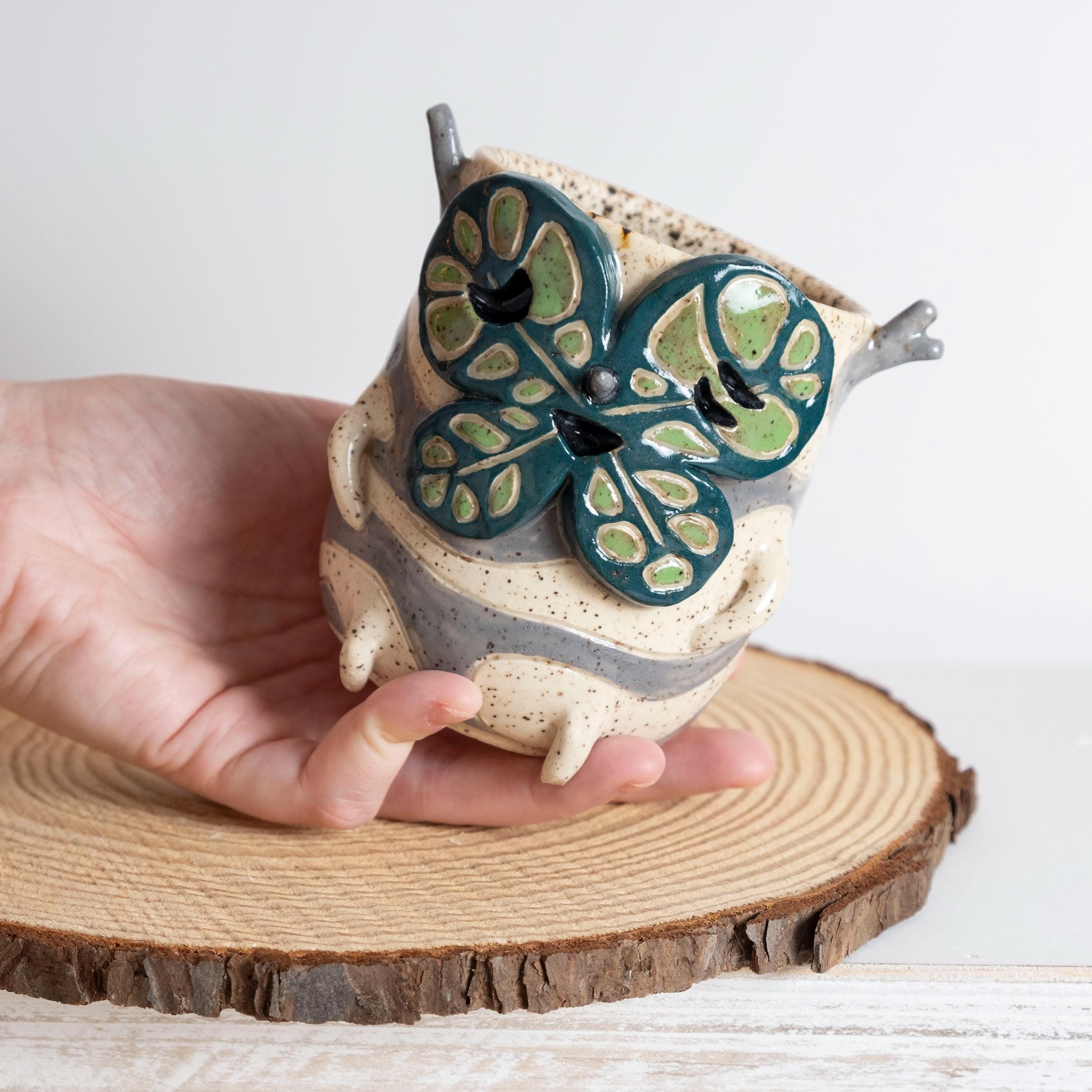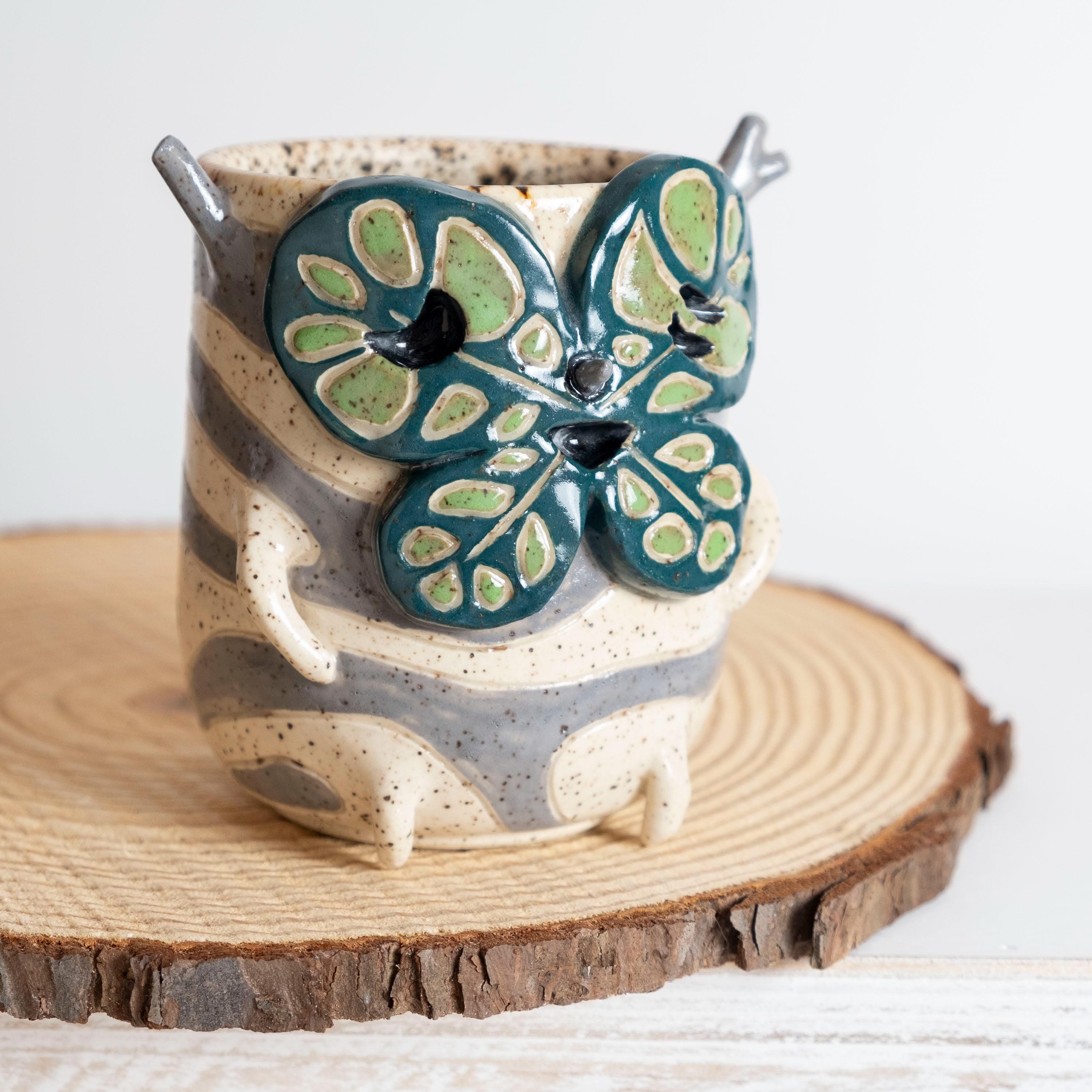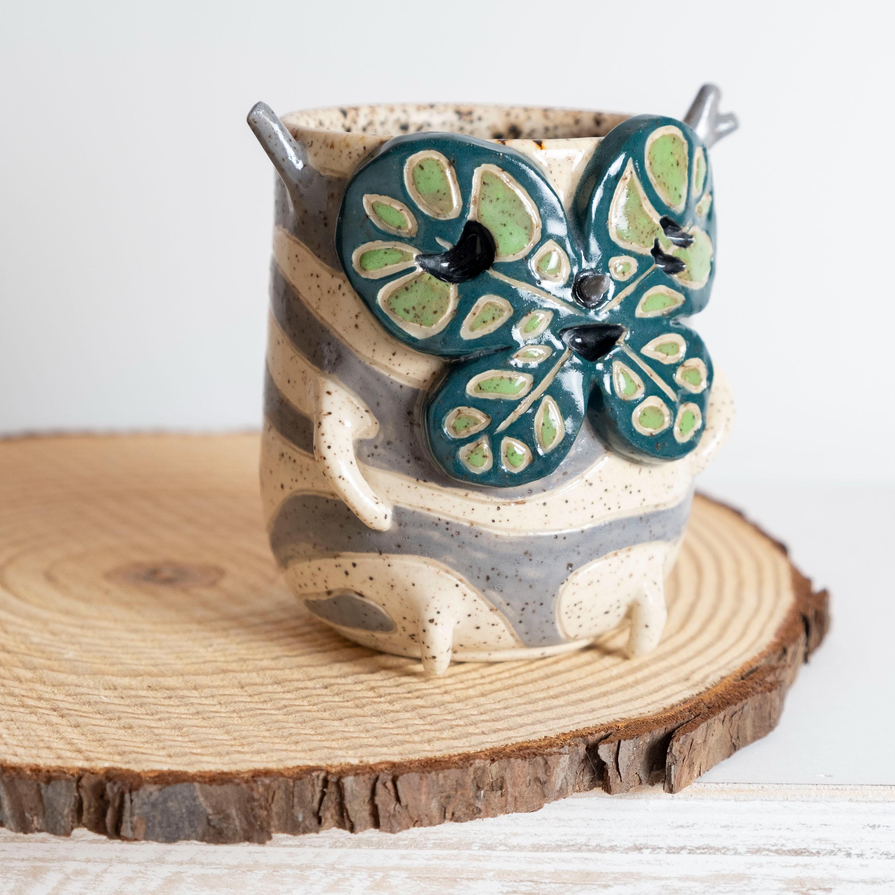 This curious fellow is hand thrown from scratch on the wheel, then sculpted and carved to create the cutest Korok tumbler! He has 2 nubby arms and legs, some nobby appendages, and a little leafy mask held on by a pointed nose. His carved texture is two-toned grey and white, lined with a speckled glaze that looks like chunky potting mix. 🍄🟫