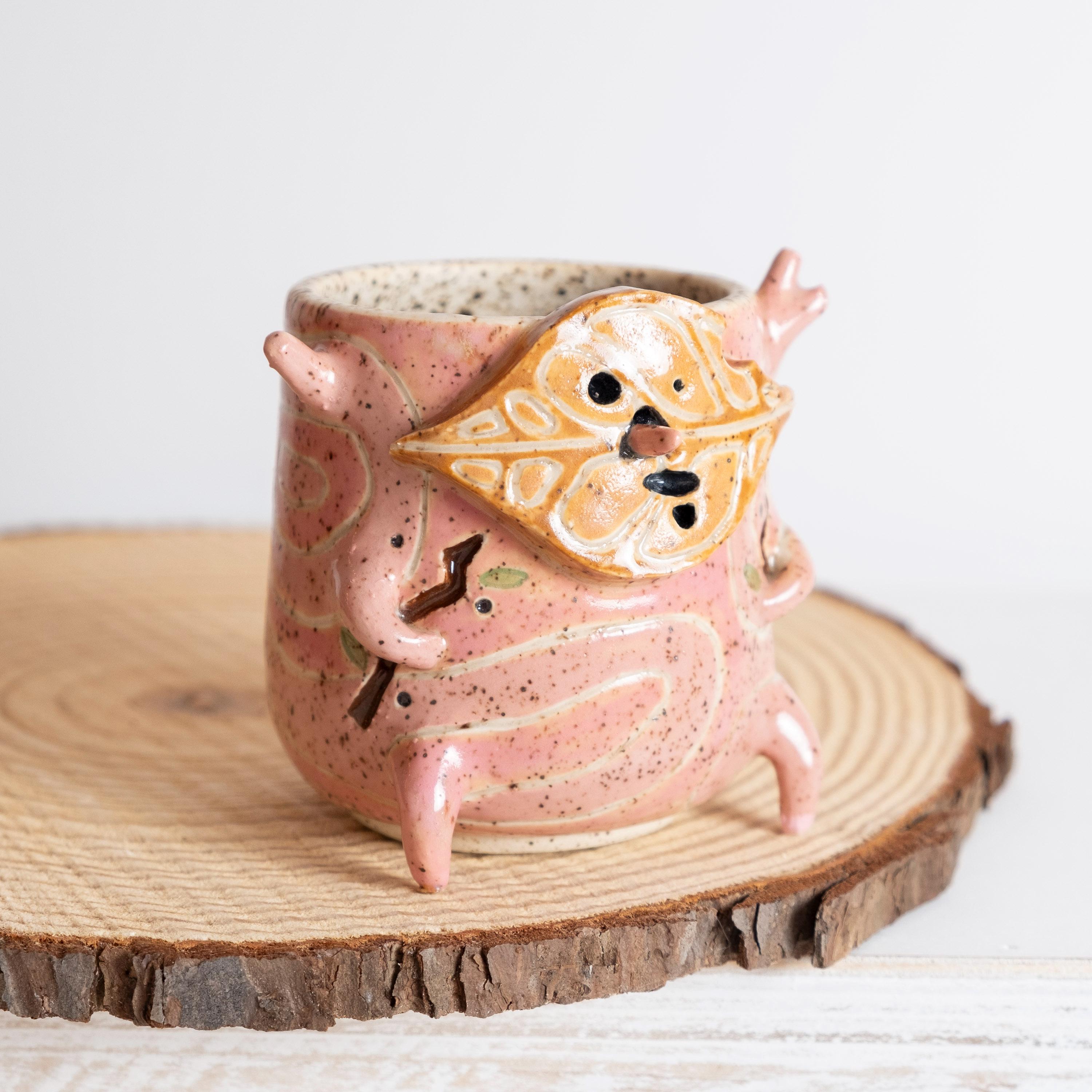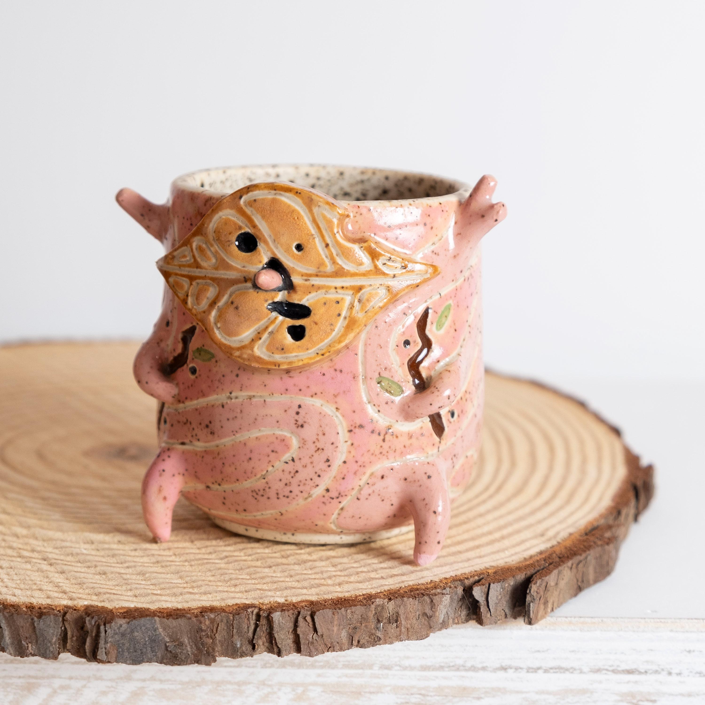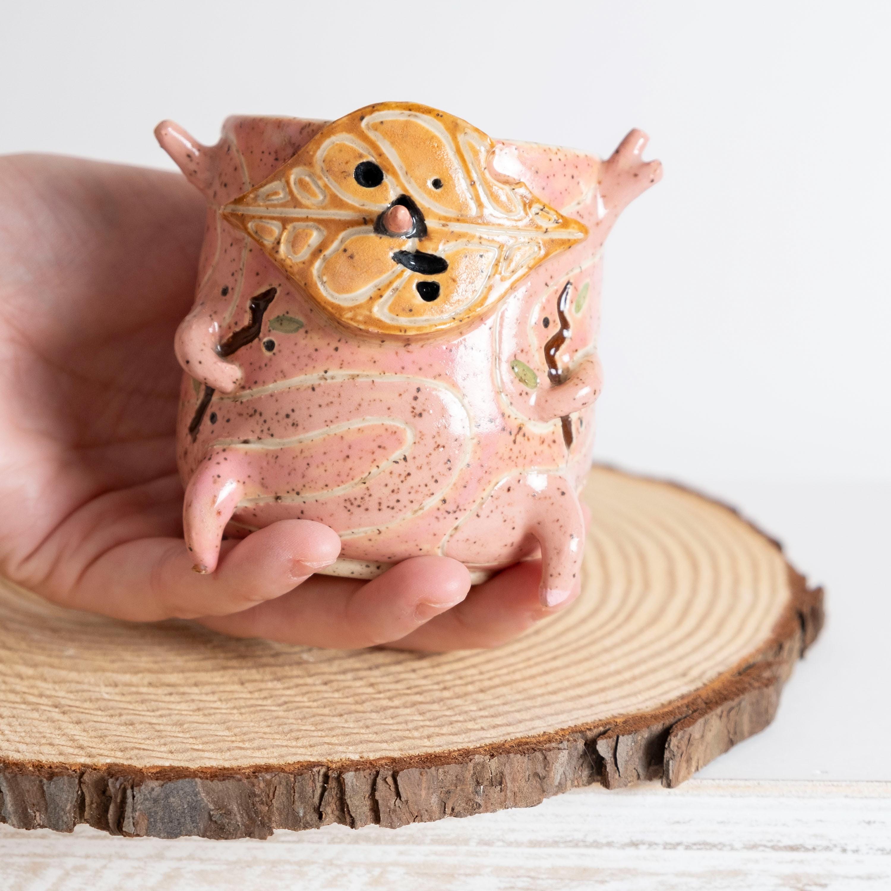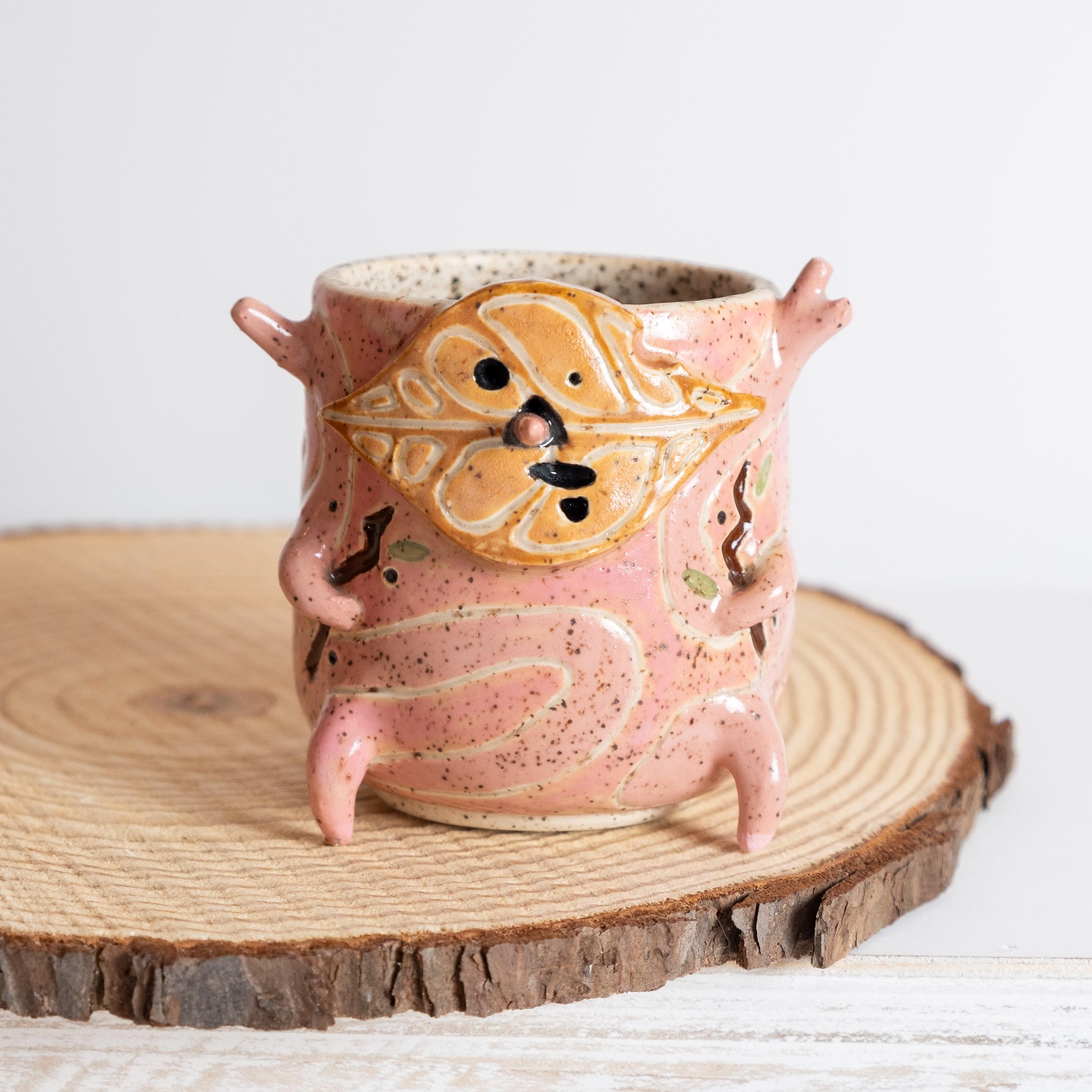 This curious fellow is hand thrown from scratch on the wheel, then sculpted and carved to create the cutest Korok tumbler! He has 2 nubby arms and legs, some nobby appendages, is holding twig and berries, and has a little leafy mask held on by a pointed nose. His carved texture is two-toned grey and white, lined with a speckled glaze that looks like chunky potting mix. 🍄🟫