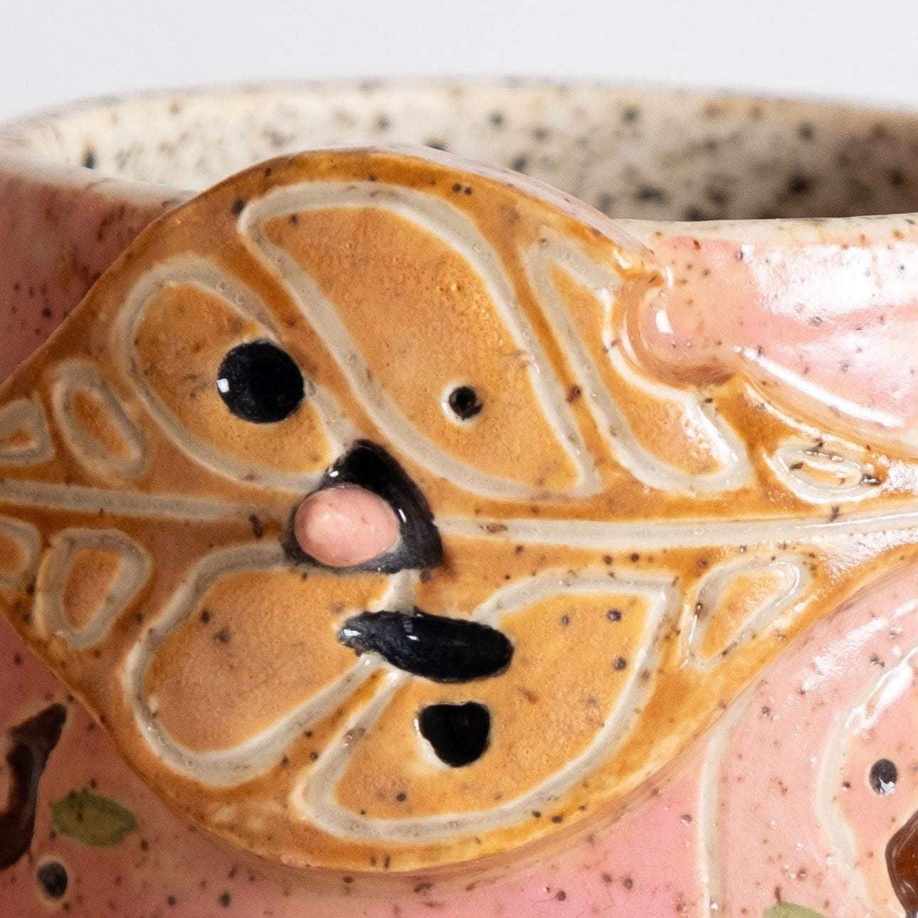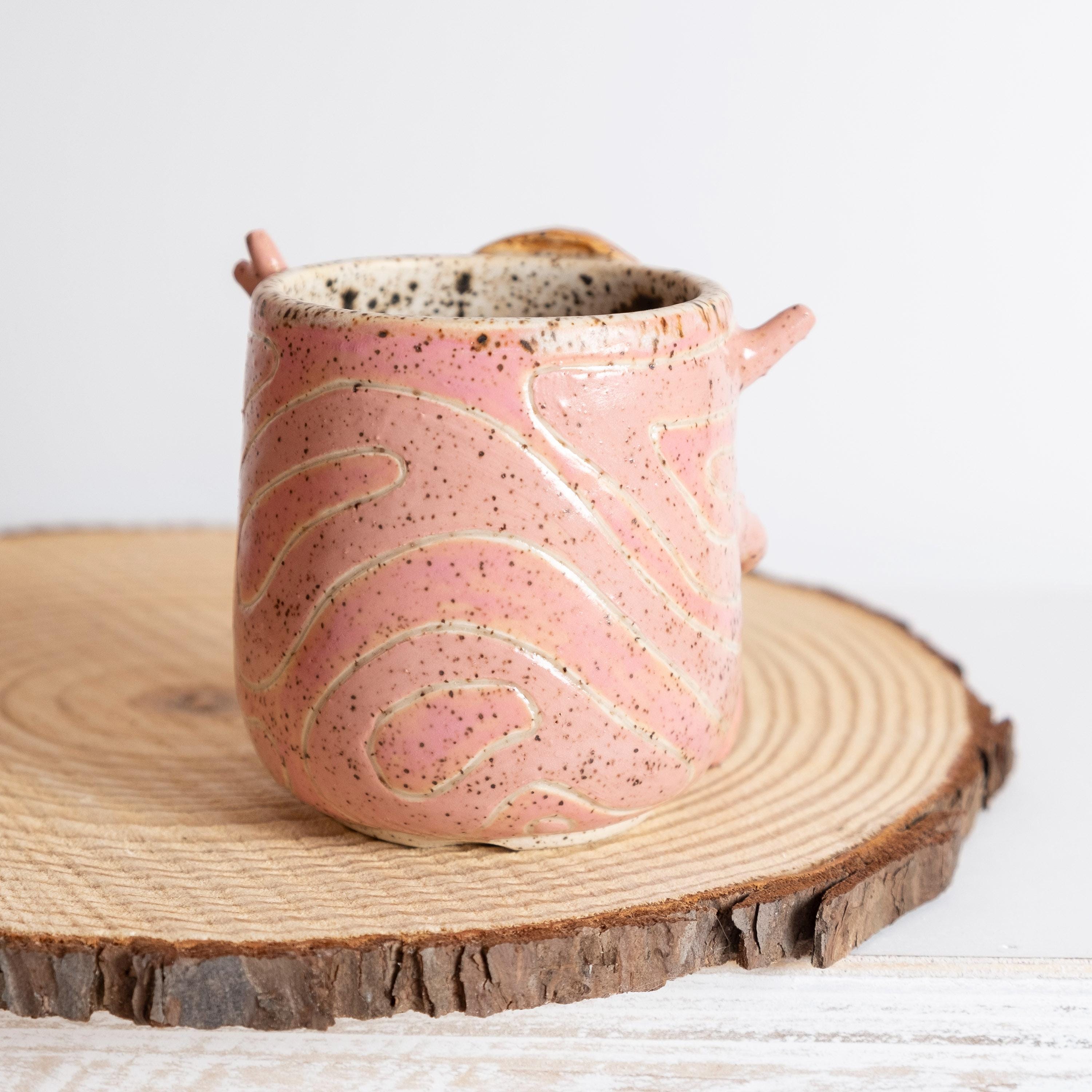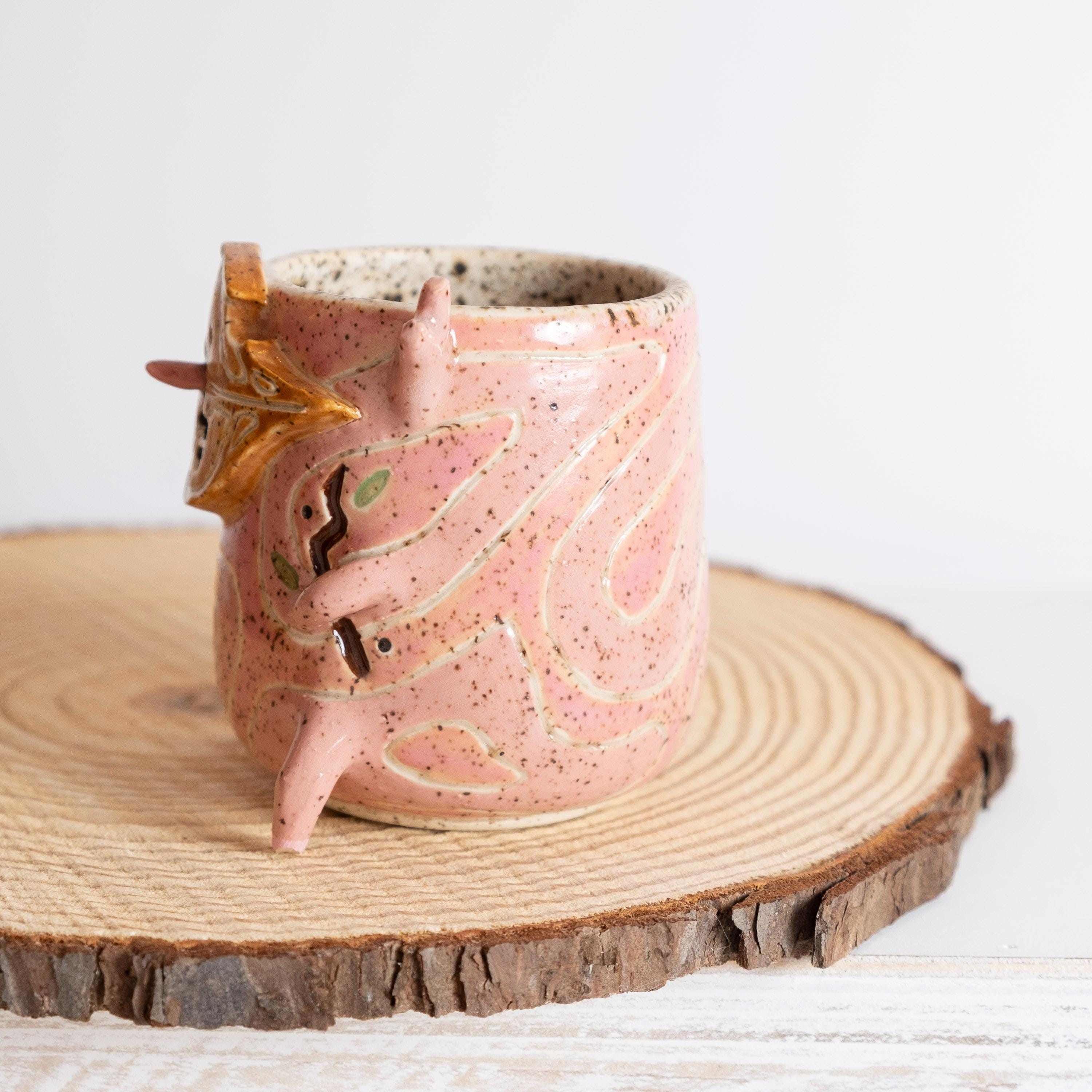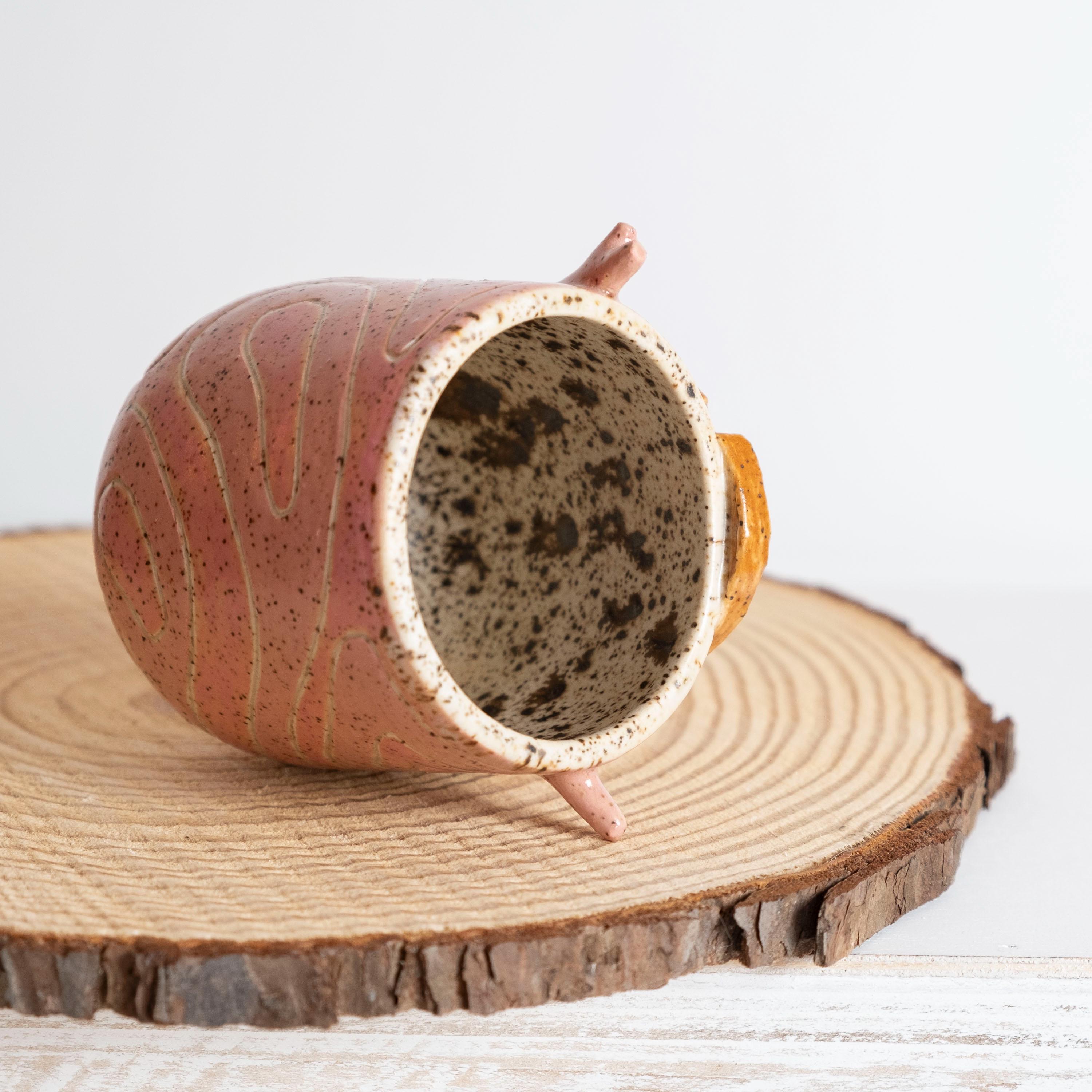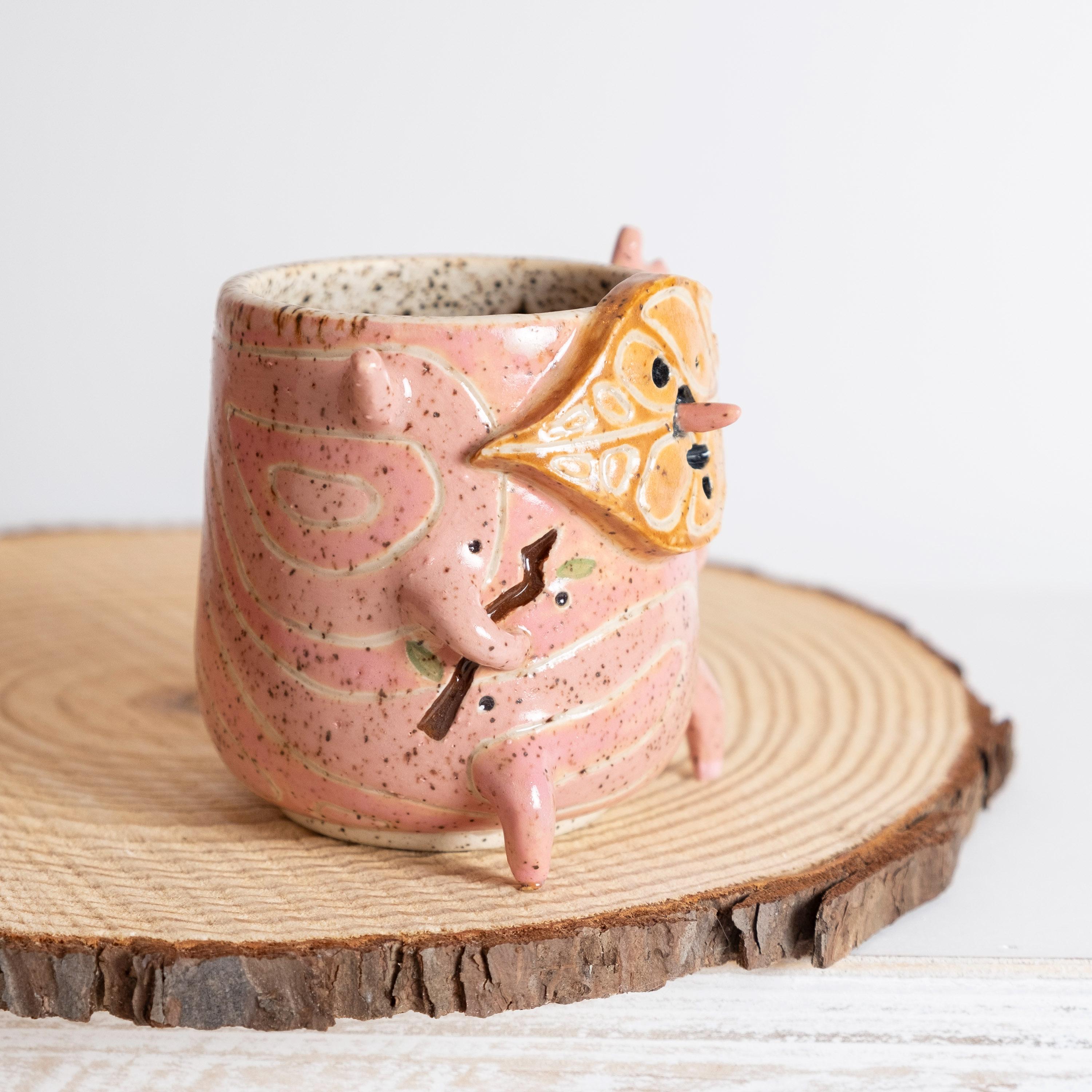 This curious fellow is hand thrown from scratch on the wheel, then sculpted and carved to create the cutest Korok tumbler! He has 2 nubby arms and legs, some nobby appendages, is holding twig and berries, and has a little leafy mask held on by a pointed nose. His carved texture is two-toned grey and white, lined with a speckled glaze that looks like chunky potting mix. 🍄🟫