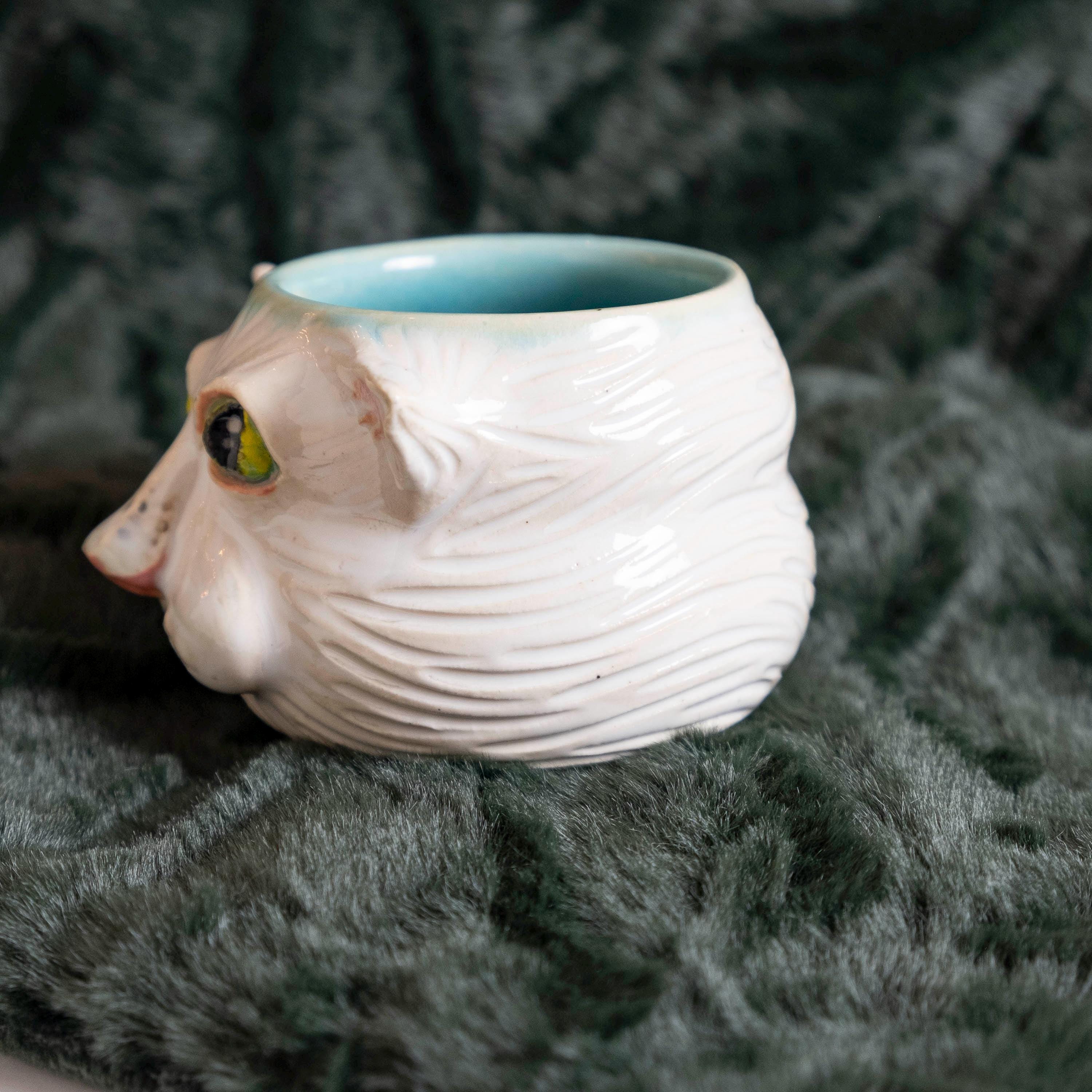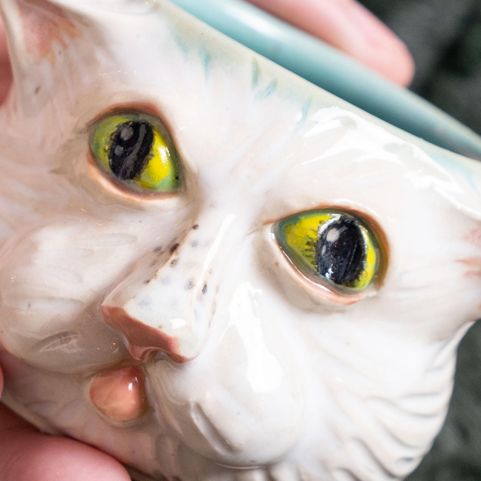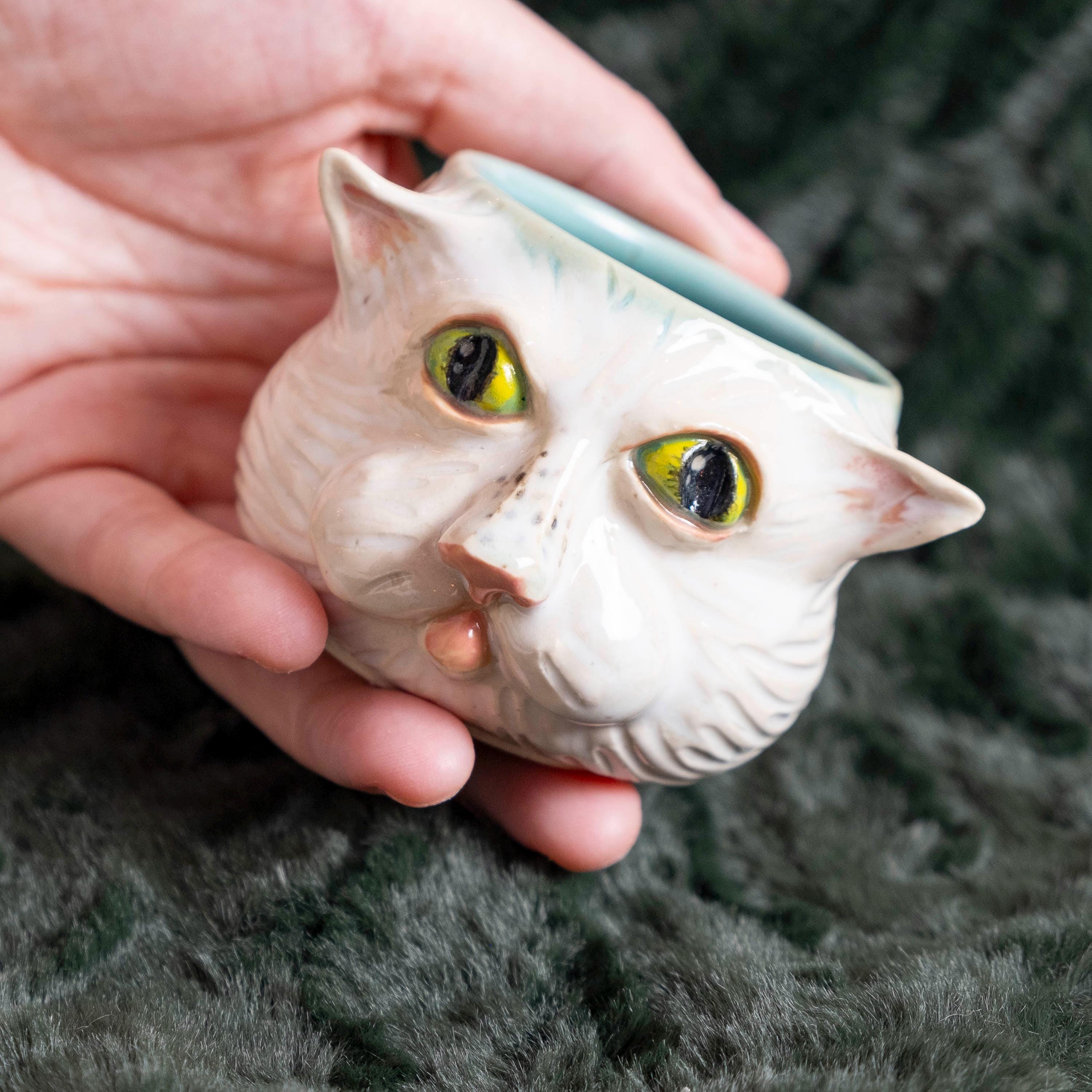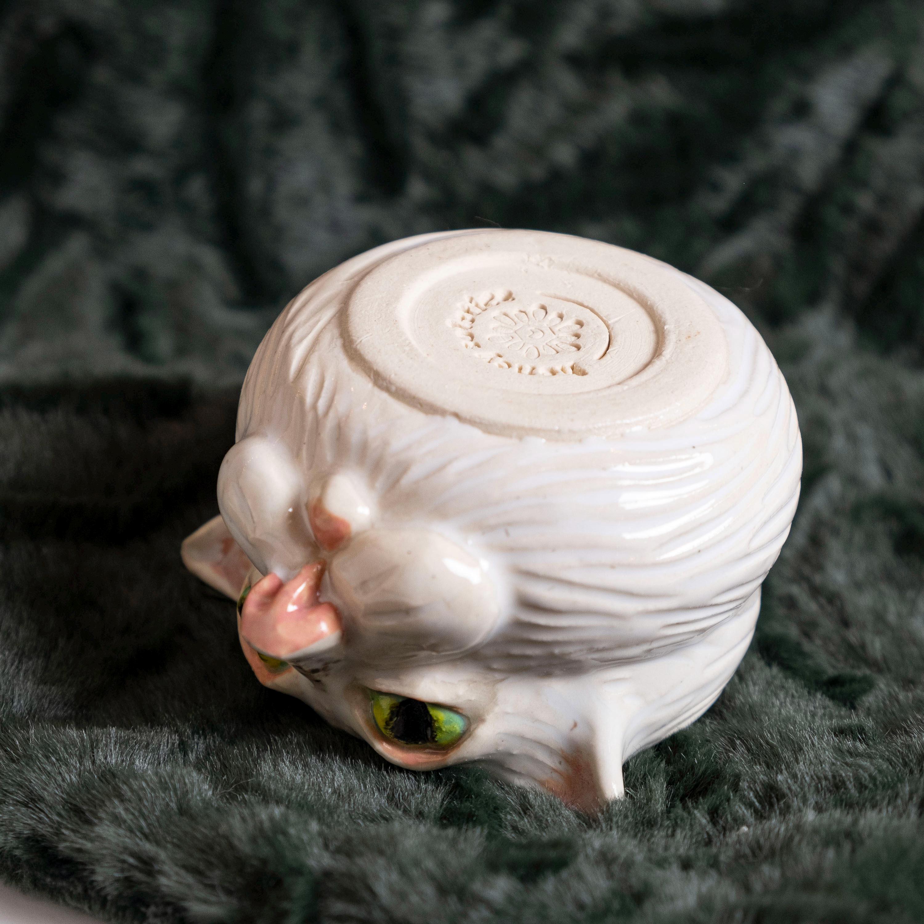 Meow-za! This fluffy little fellow is hand thrown from scratch on the wheel, then sculpted and carved to create an adorable, whimsical shot glass (or trinket dish) with a ton of personality! It features 2 perky & pink ears, green eyes, a button nose, little cheeks, freckles (bc why not???), a tiny mouth, and whispy flowing textured fur. Whether you love cats, kittens, or are just a feline fanatic - this one's for you!