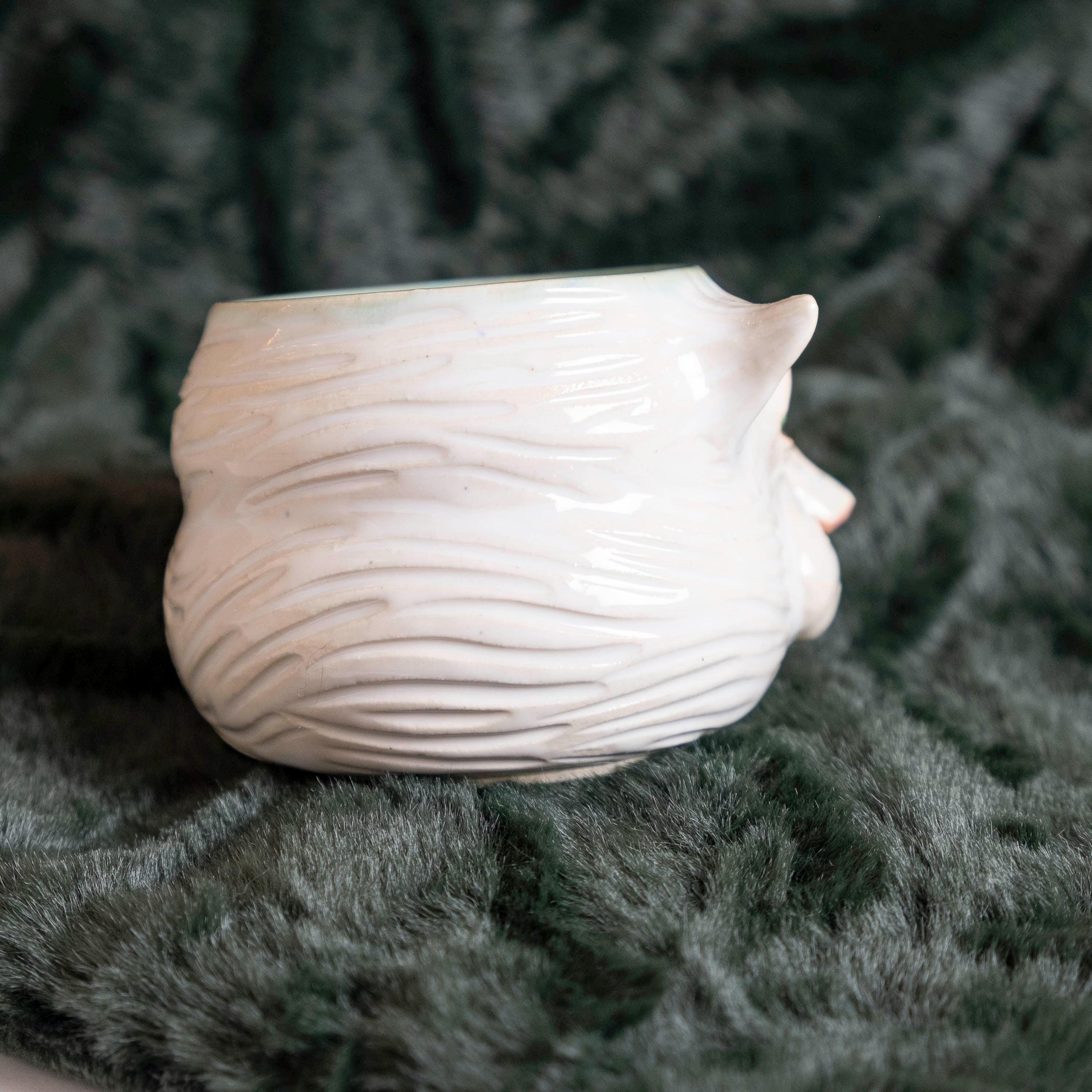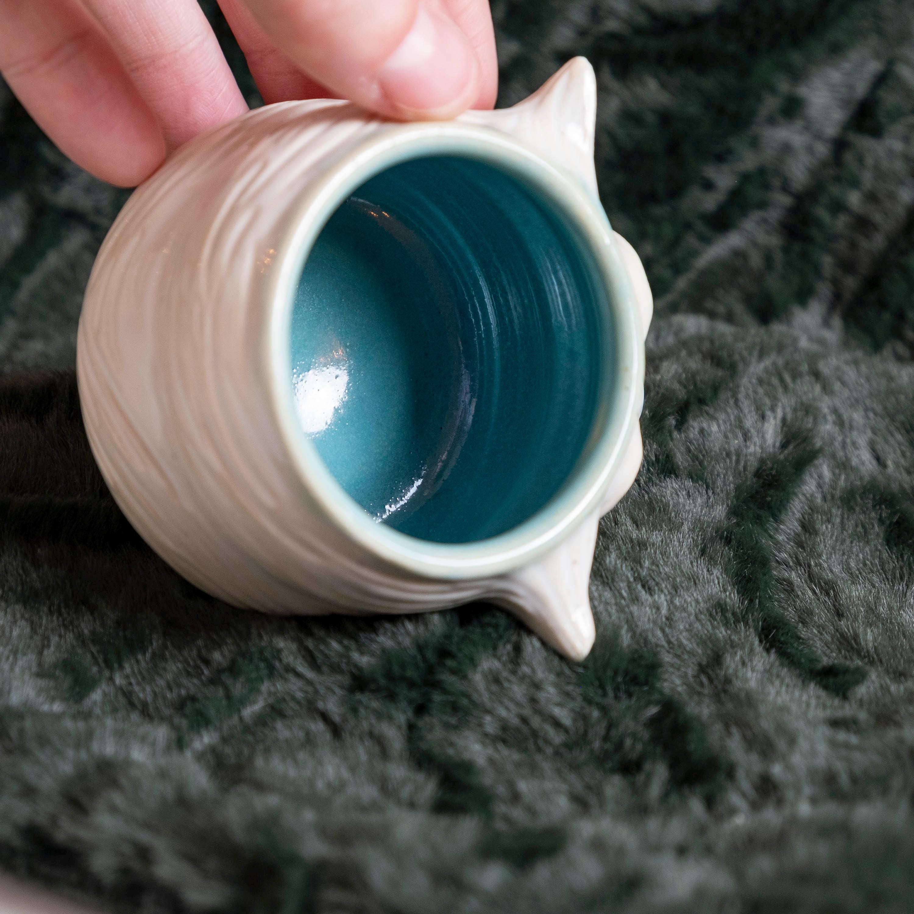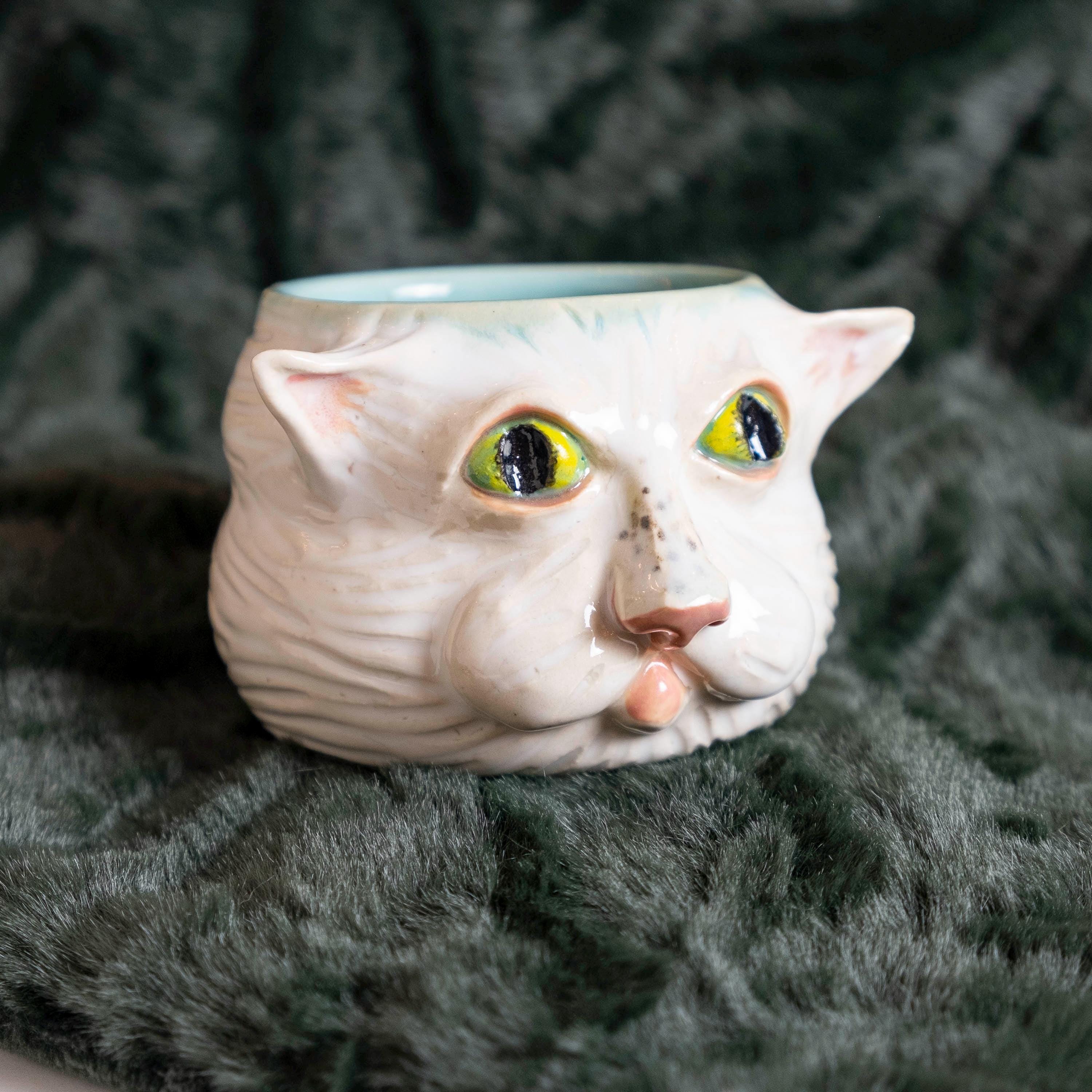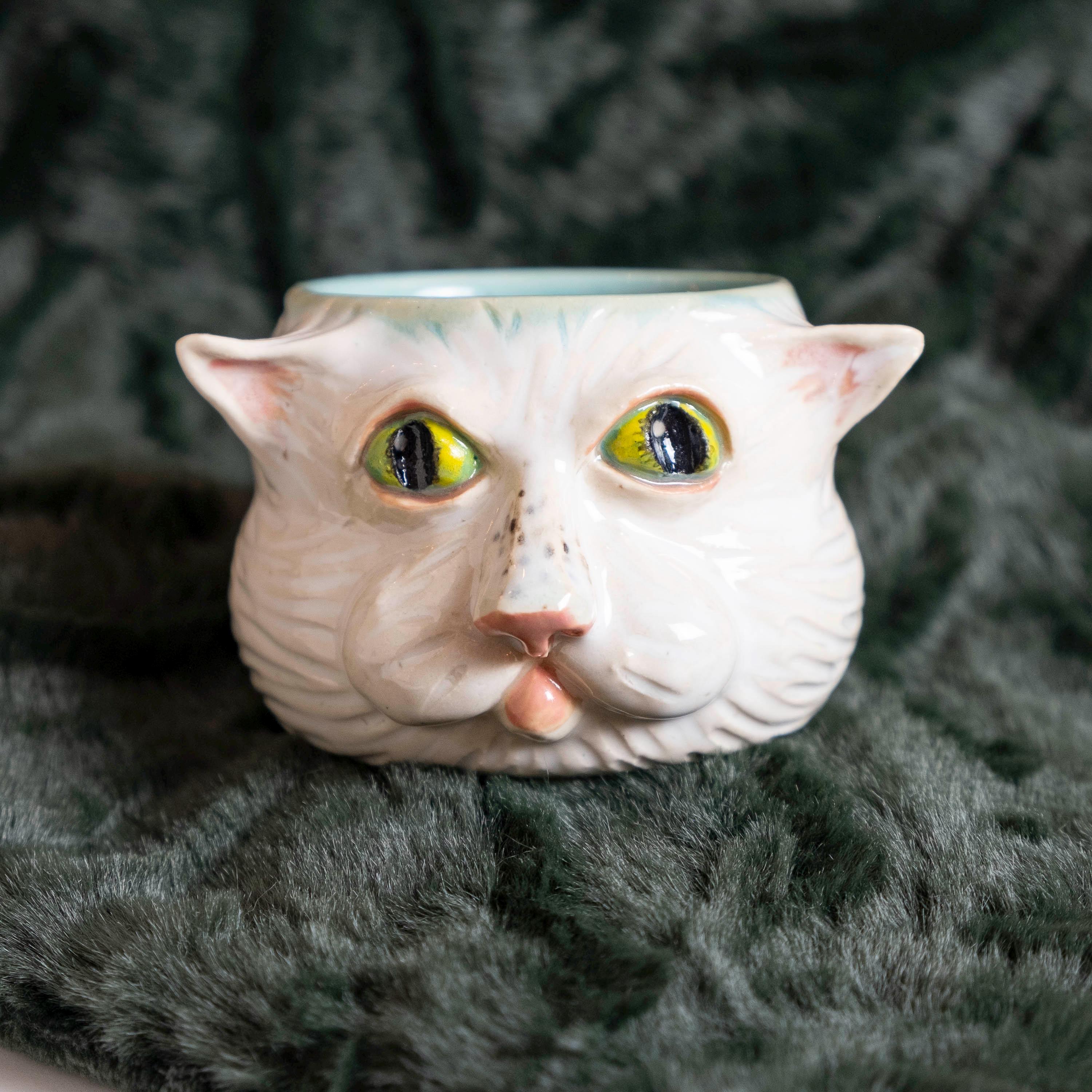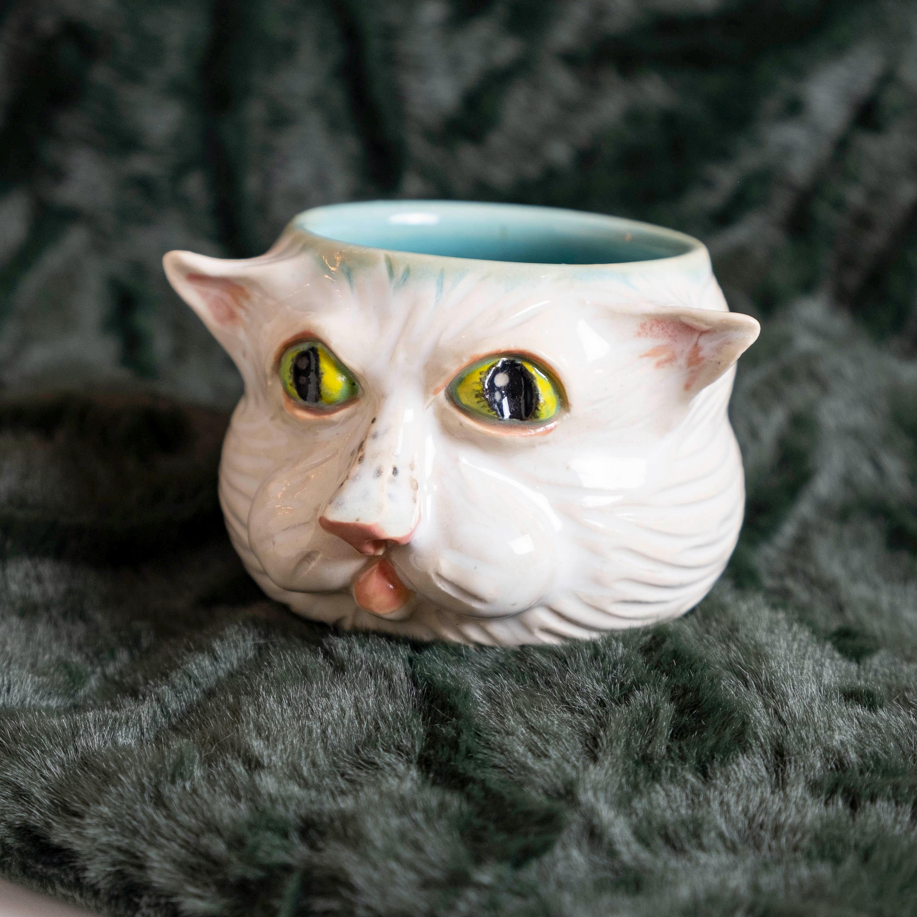 Meow-za! This fluffy little fellow is hand thrown from scratch on the wheel, then sculpted and carved to create an adorable, whimsical shot glass (or trinket dish) with a ton of personality! It features 2 perky & pink ears, green eyes, a button nose, little cheeks, freckles (bc why not???), a tiny mouth, and whispy flowing textured fur. Whether you love cats, kittens, or are just a feline fanatic - this one's for you!