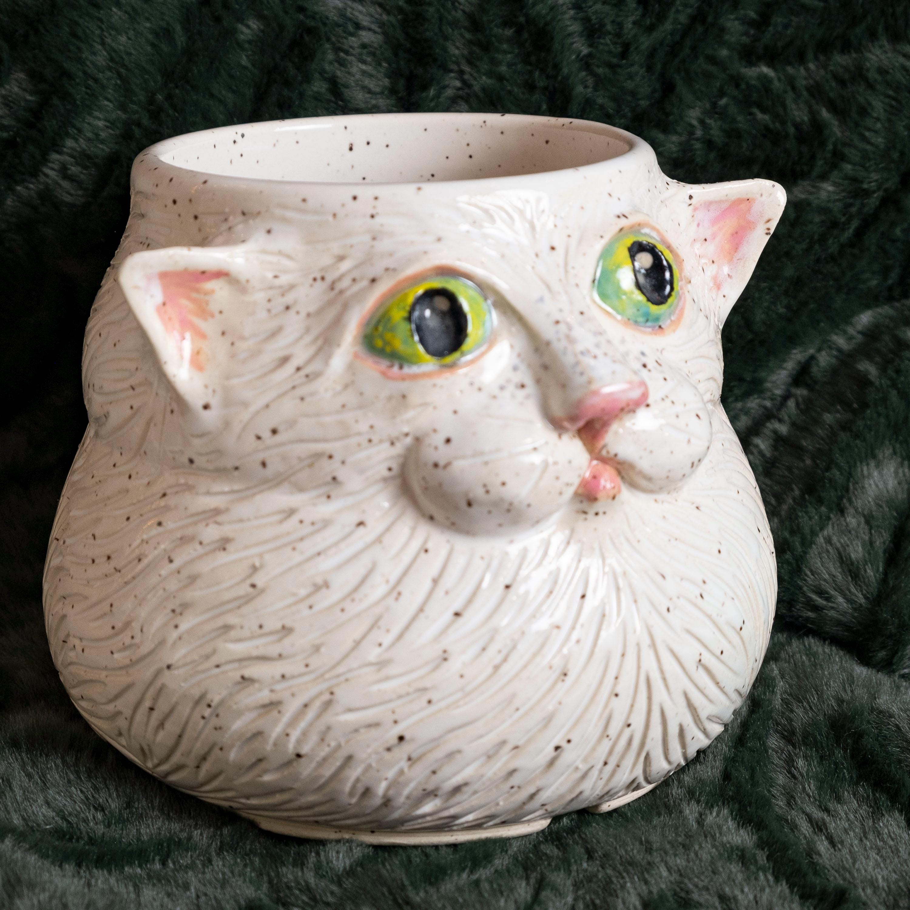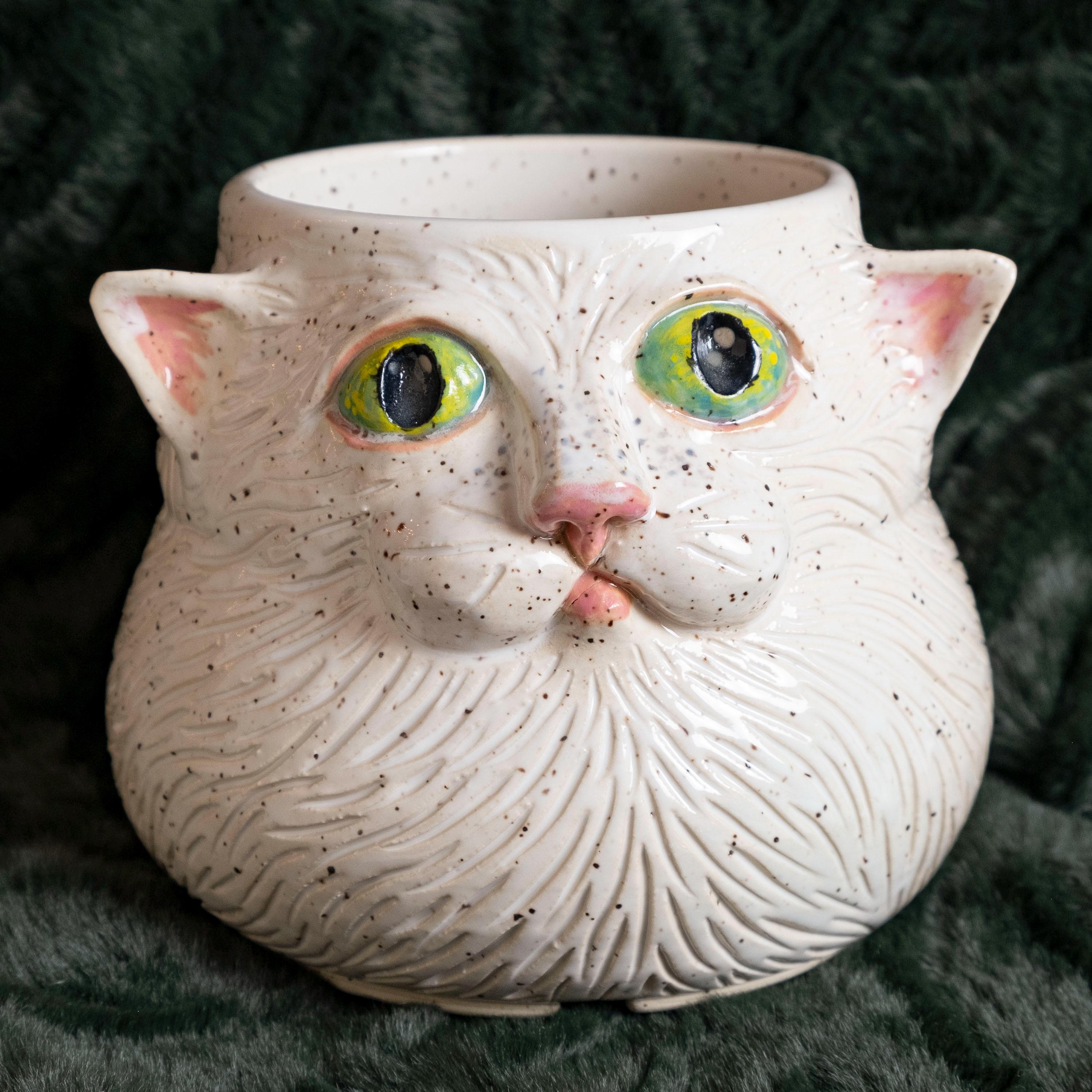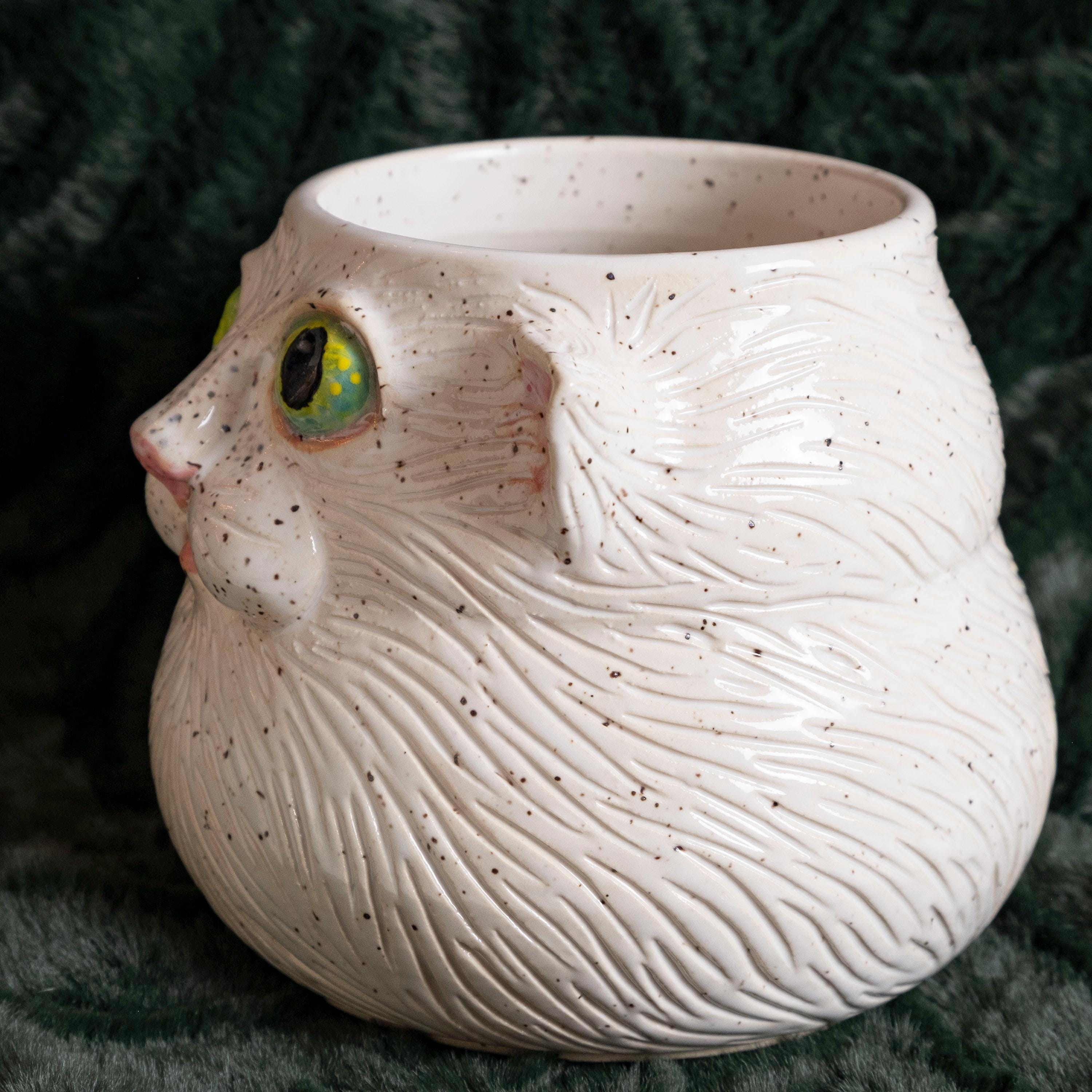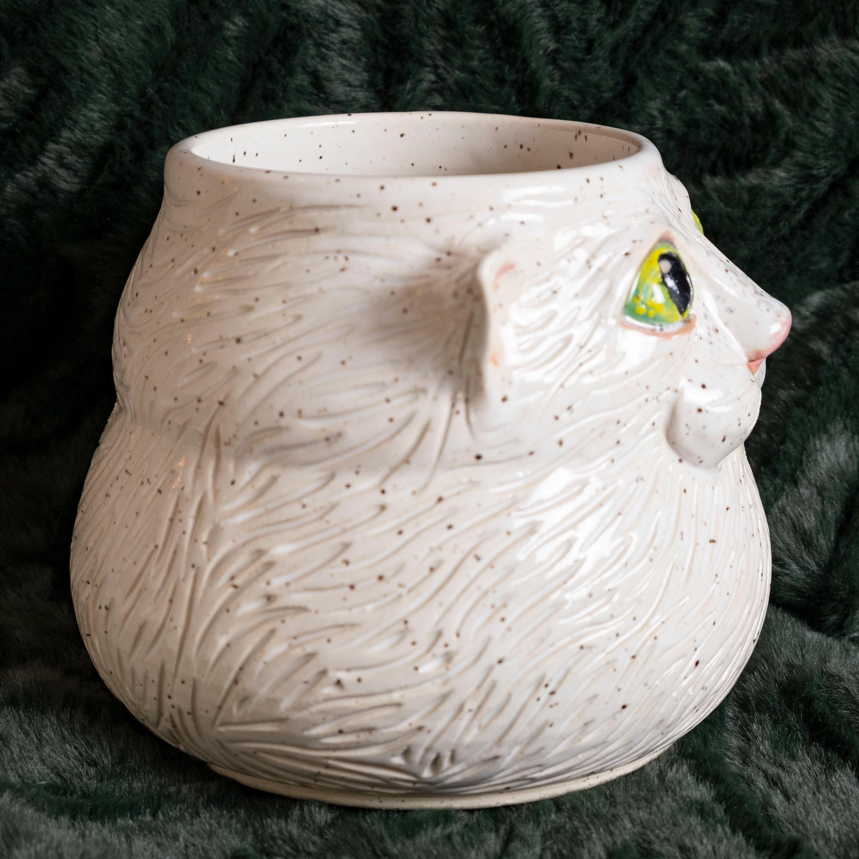 Meow-za! This fluffy little guy is hand thrown from scratch on the wheel, then sculpted and carved to create an adorable, whimsical planter with a ton of personality! It features 2 perky & pink ears, green eyes, a button nose, little cheeks, a tiny mouth, and whispy flowing textured fur - perfect for the eclectic cat lady / plant person in your life!