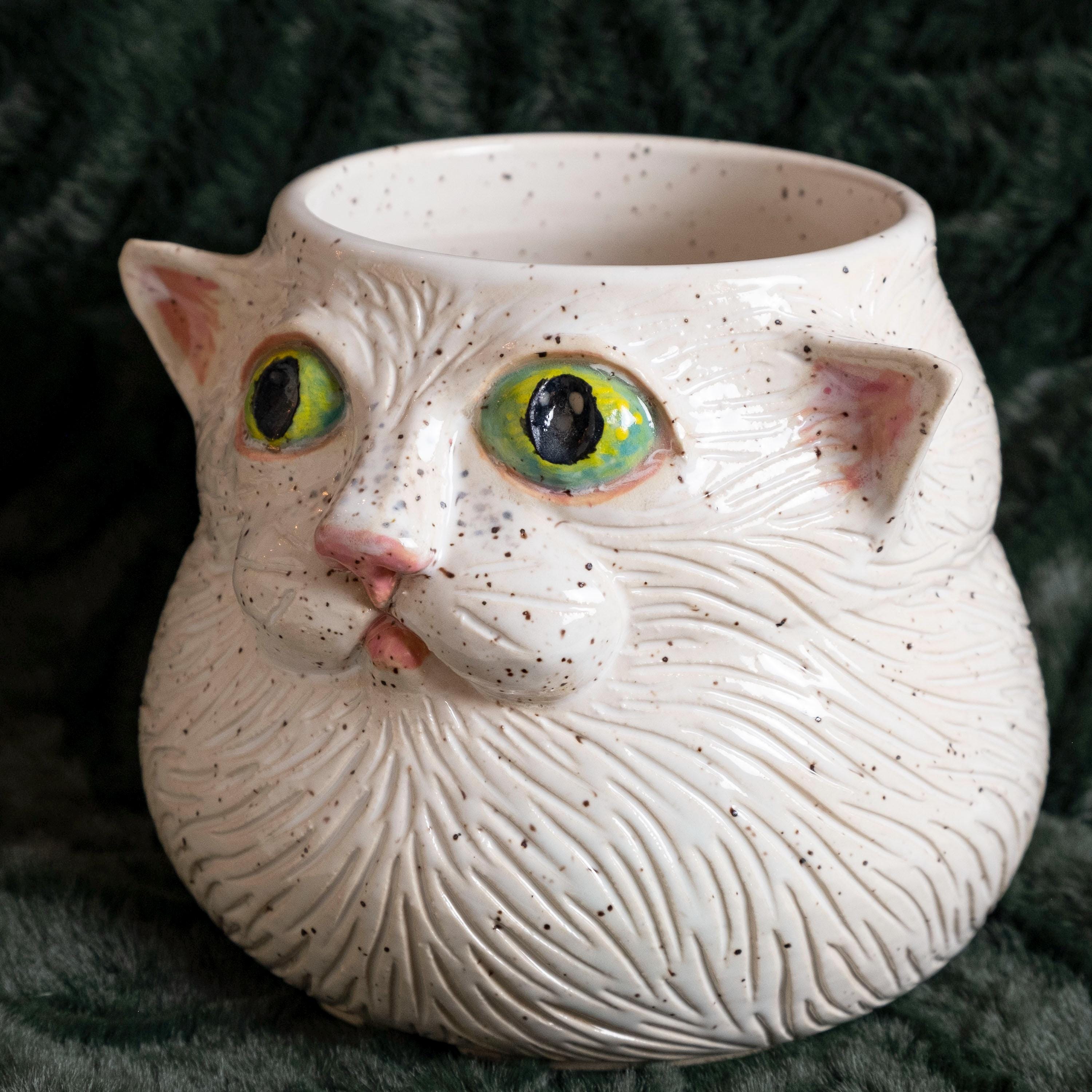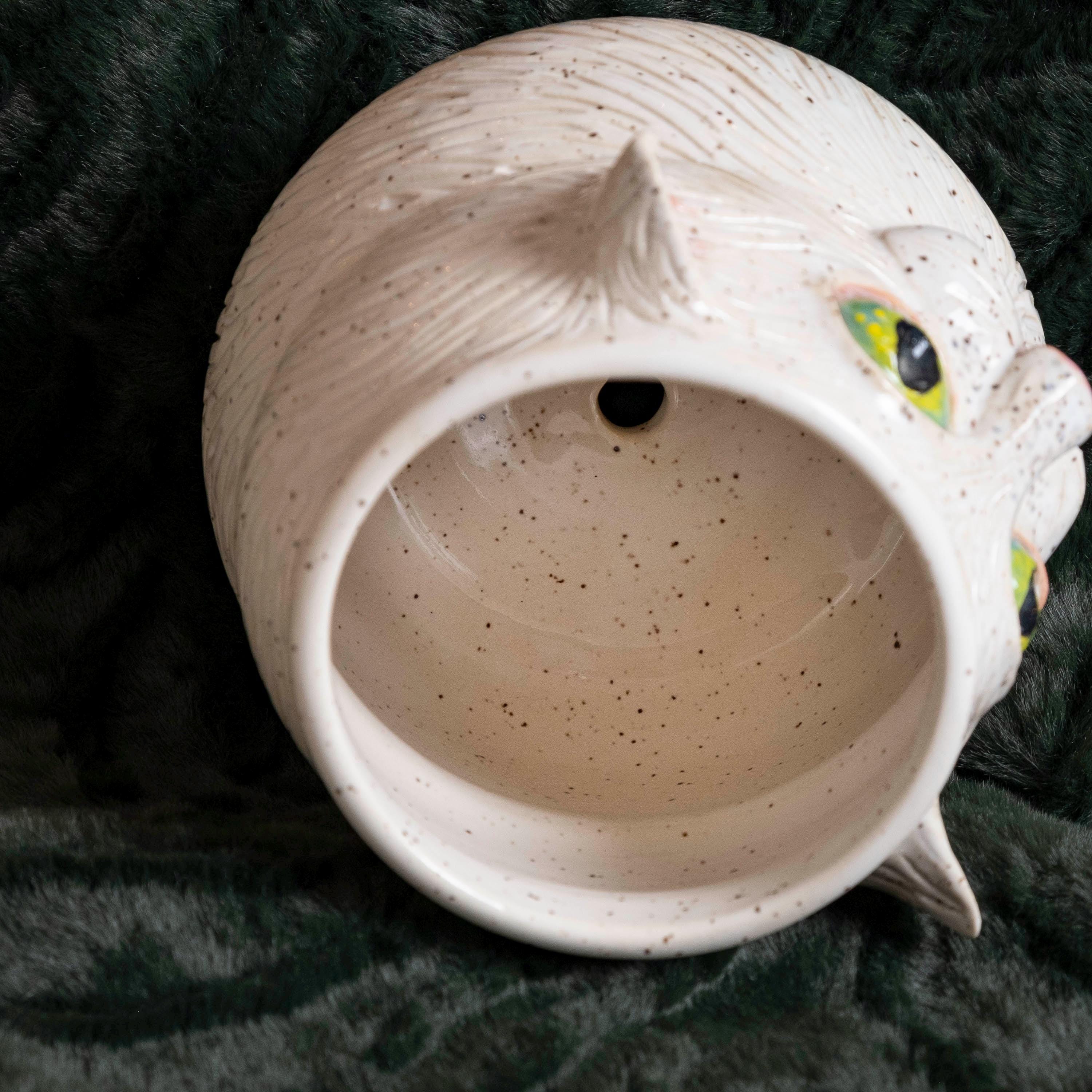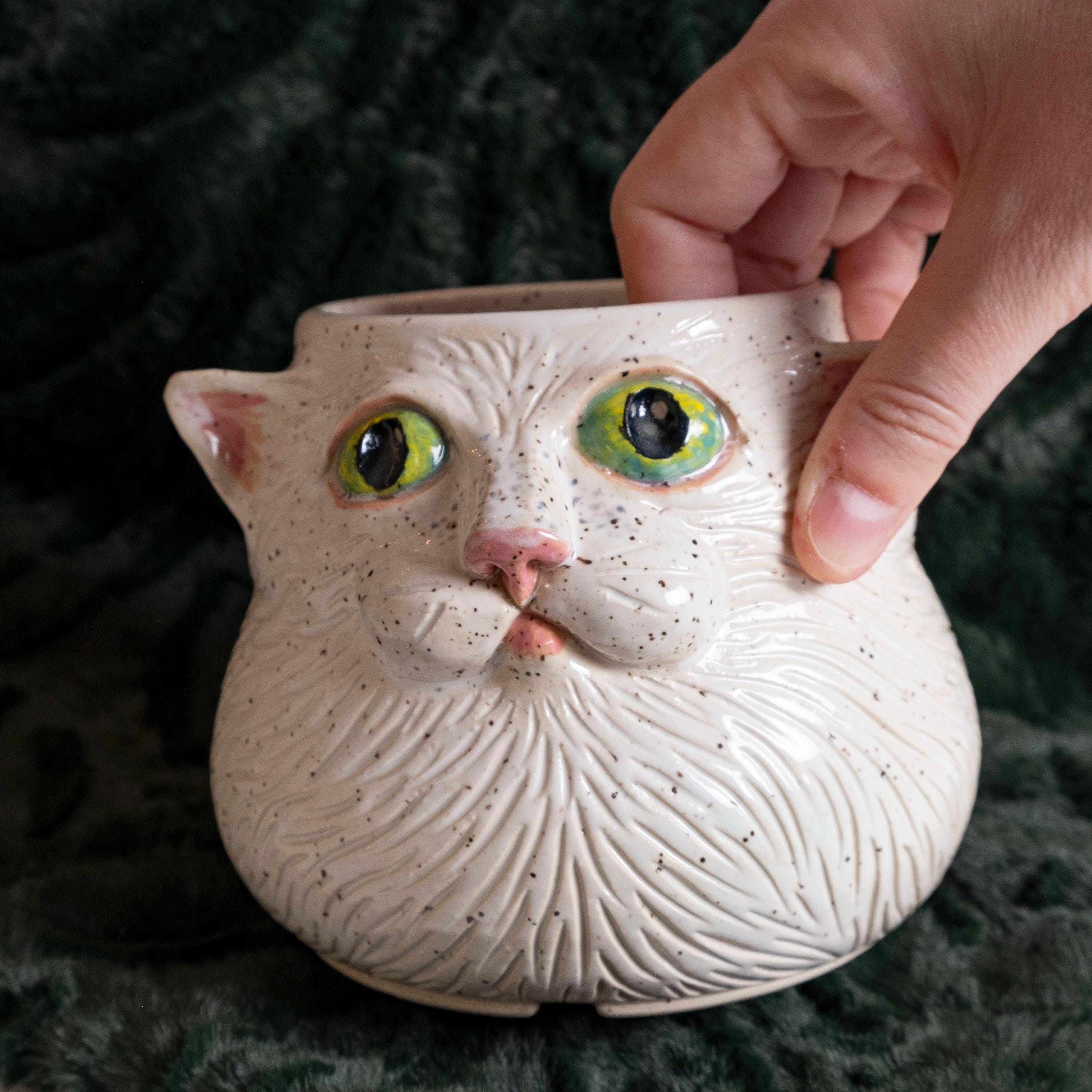 Meow-za! This fluffy little guy is hand thrown from scratch on the wheel, then sculpted and carved to create an adorable, whimsical planter with a ton of personality! It features 2 perky & pink ears, green eyes, a button nose, little cheeks, a tiny mouth, and whispy flowing textured fur - perfect for the eclectic cat lady / plant person in your life!