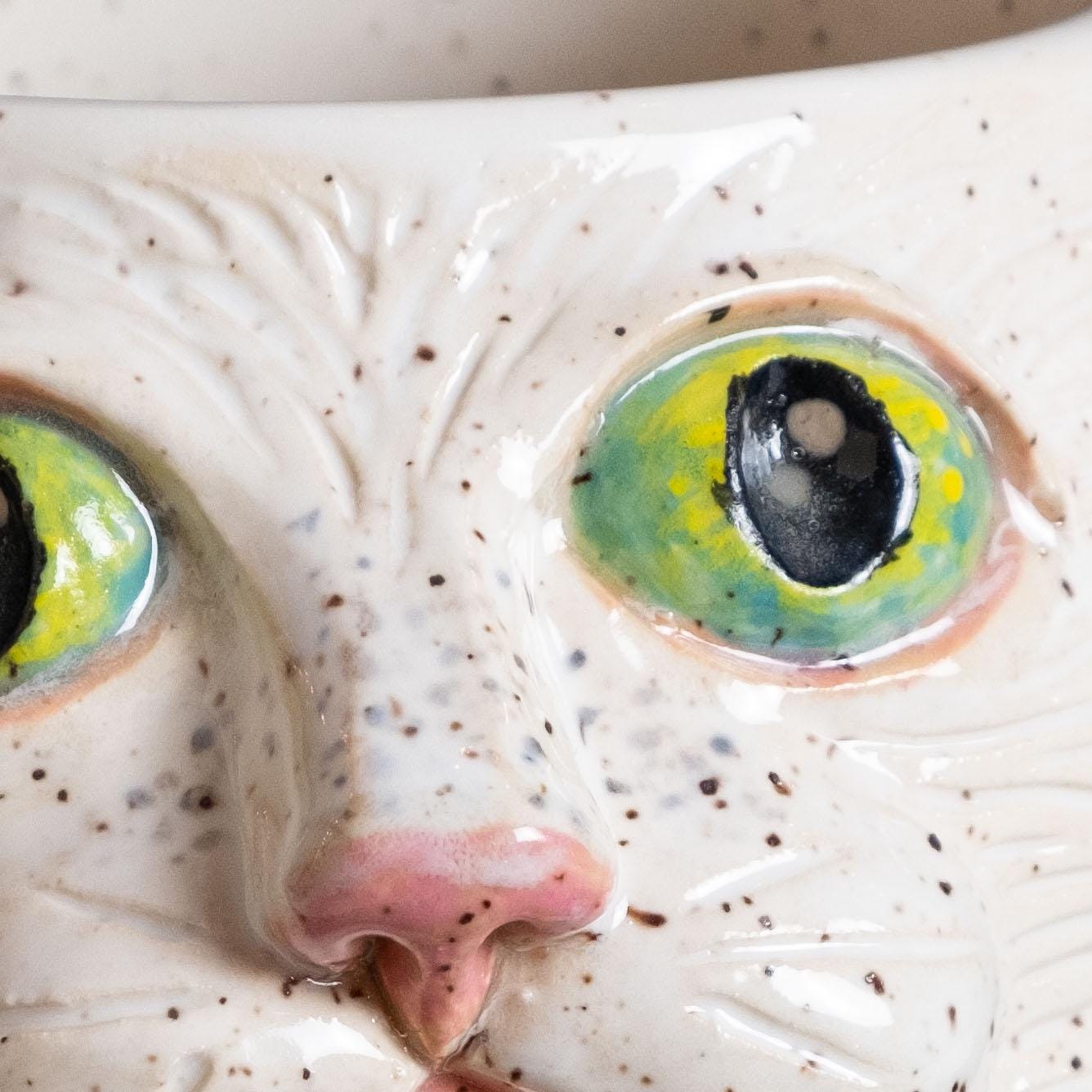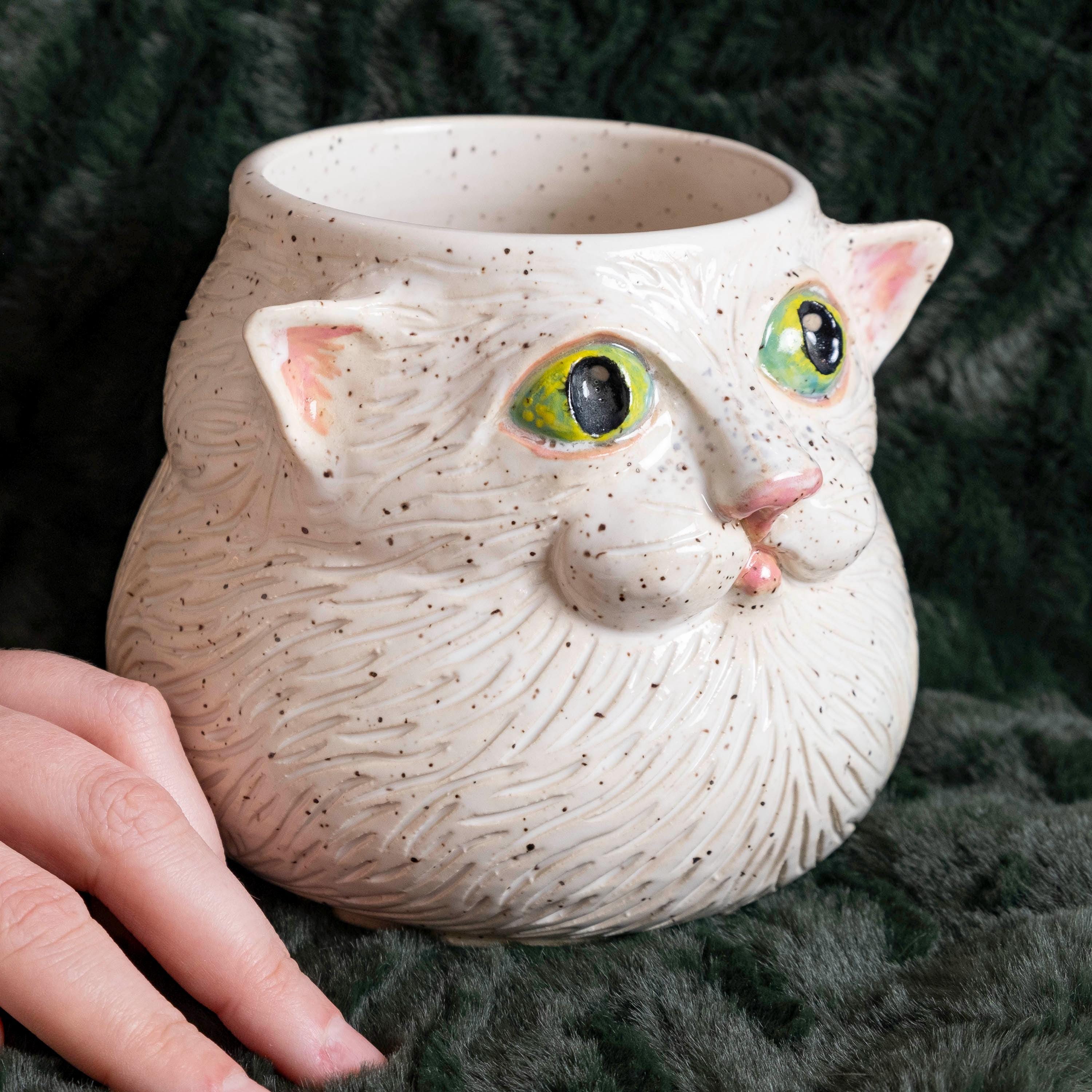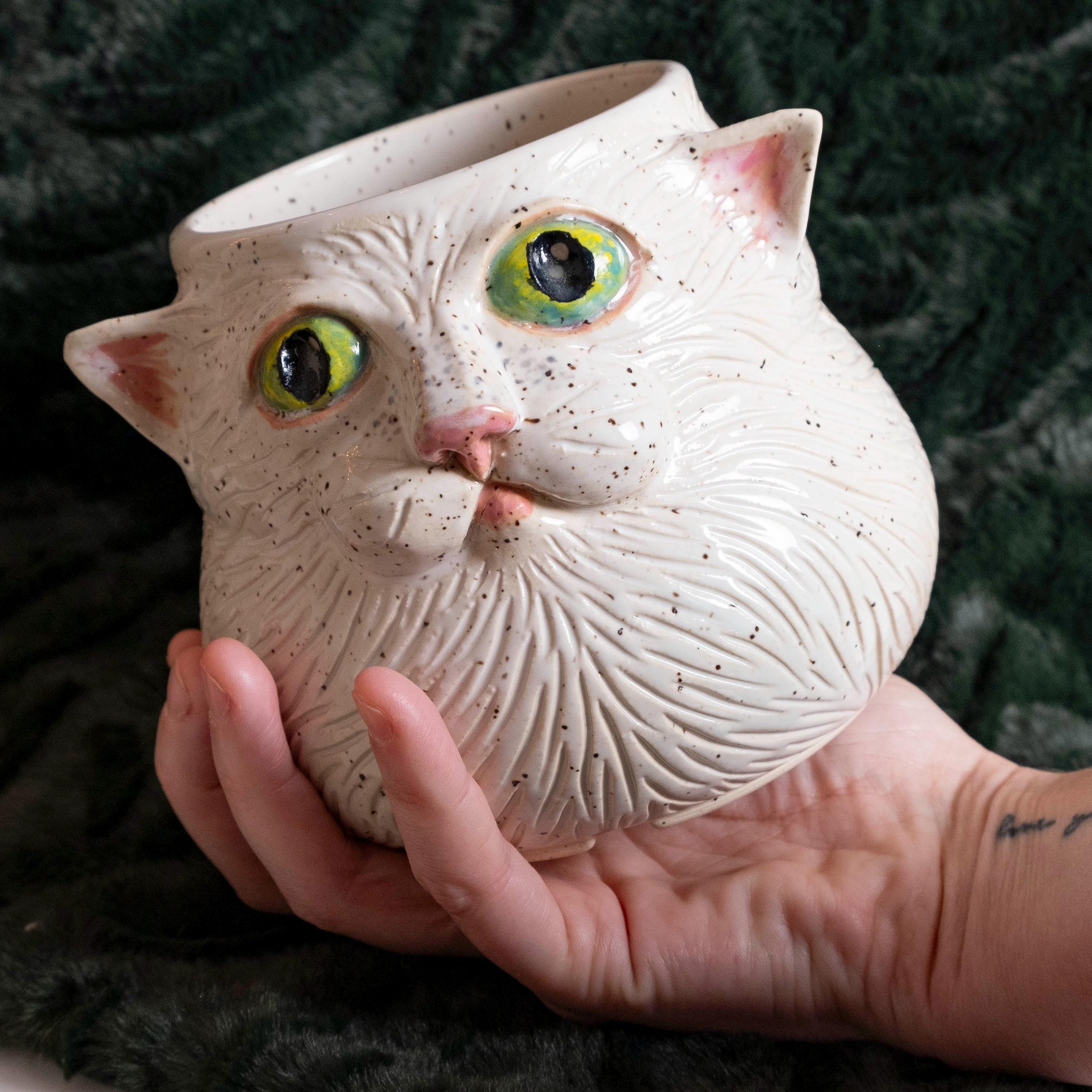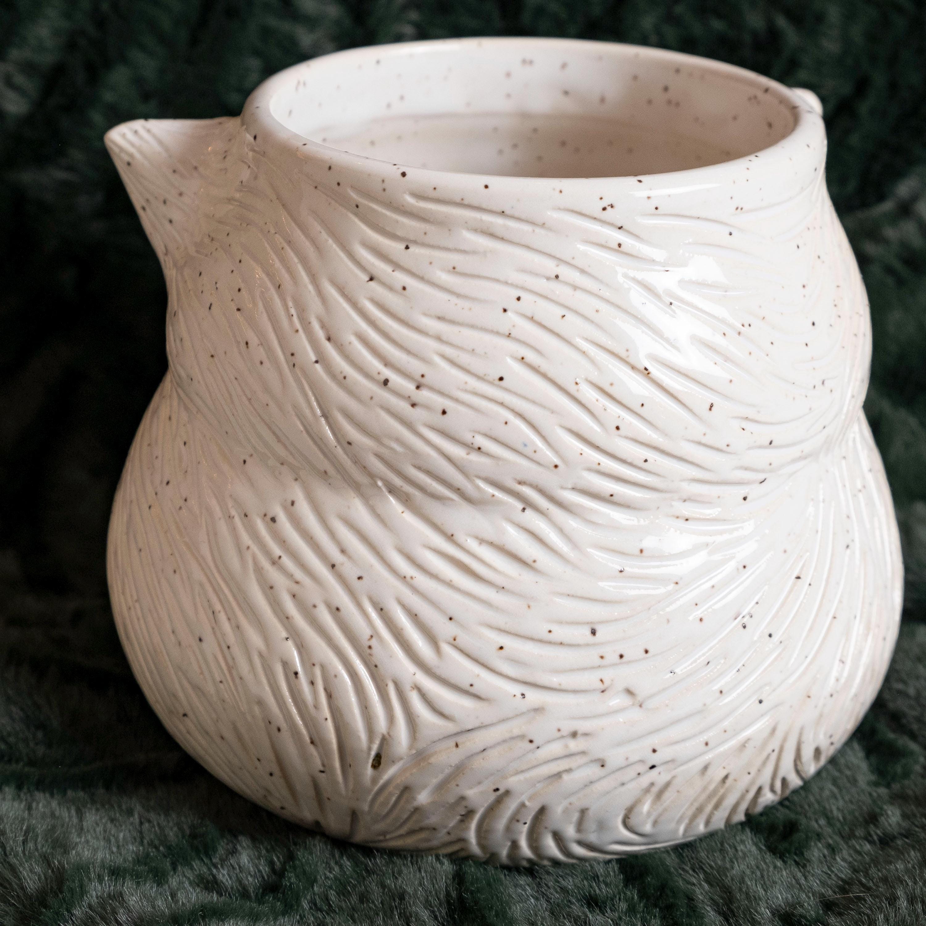 Meow-za! This fluffy little guy is hand thrown from scratch on the wheel, then sculpted and carved to create an adorable, whimsical planter with a ton of personality! It features 2 perky & pink ears, green eyes, a button nose, little cheeks, a tiny mouth, and whispy flowing textured fur - perfect for the eclectic cat lady / plant person in your life!