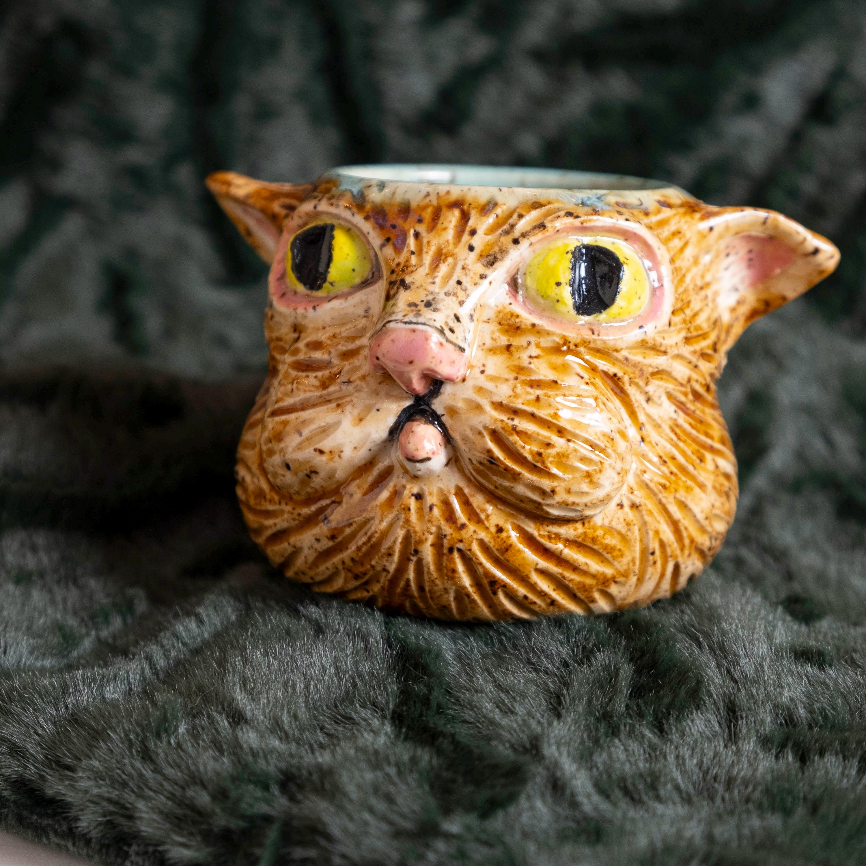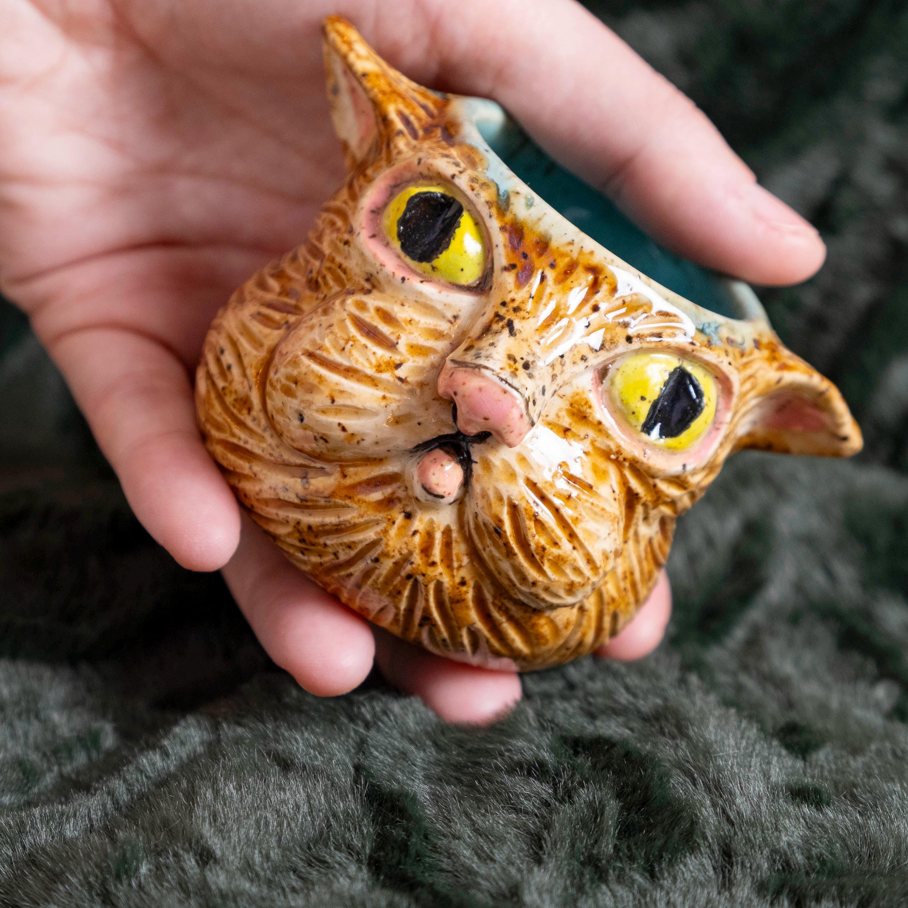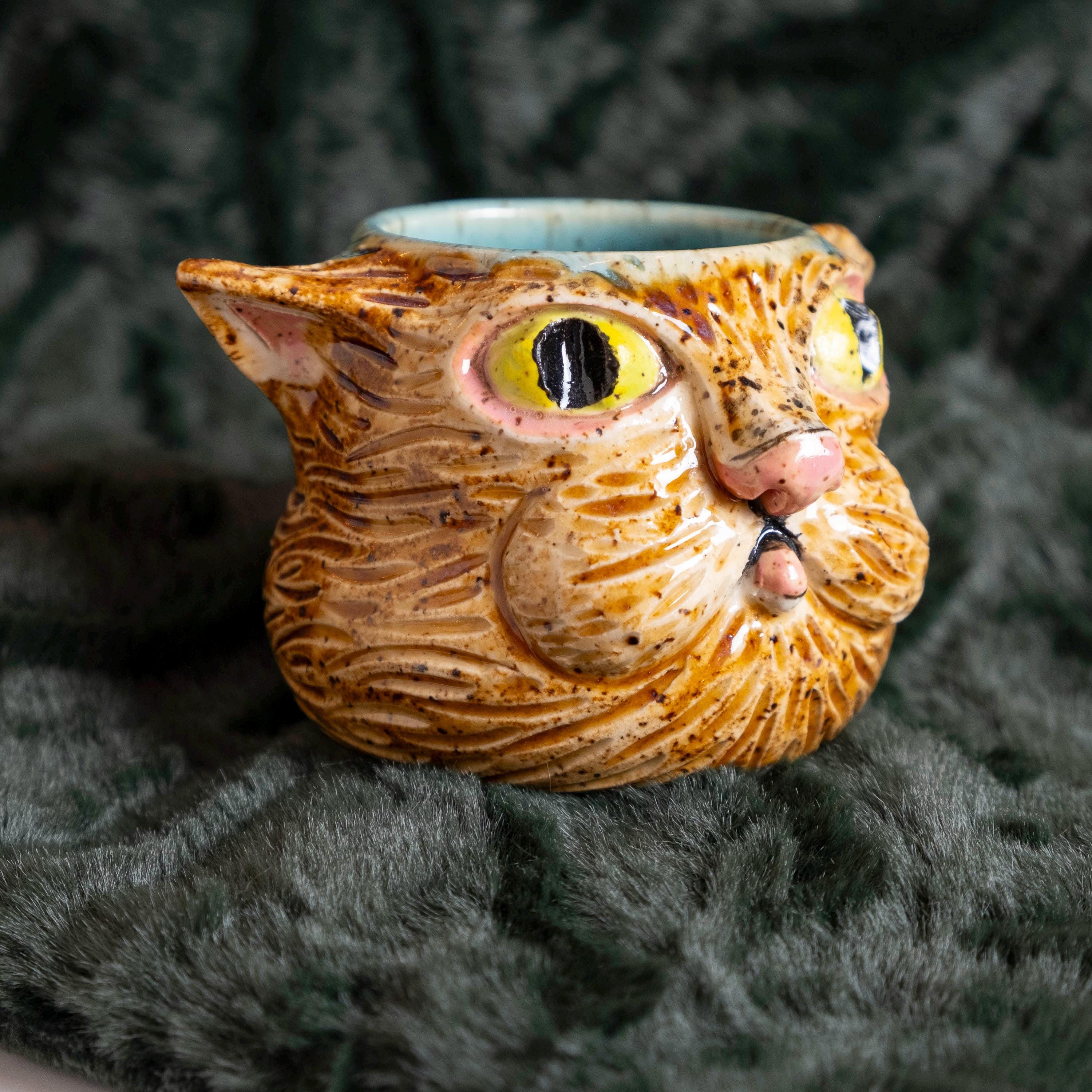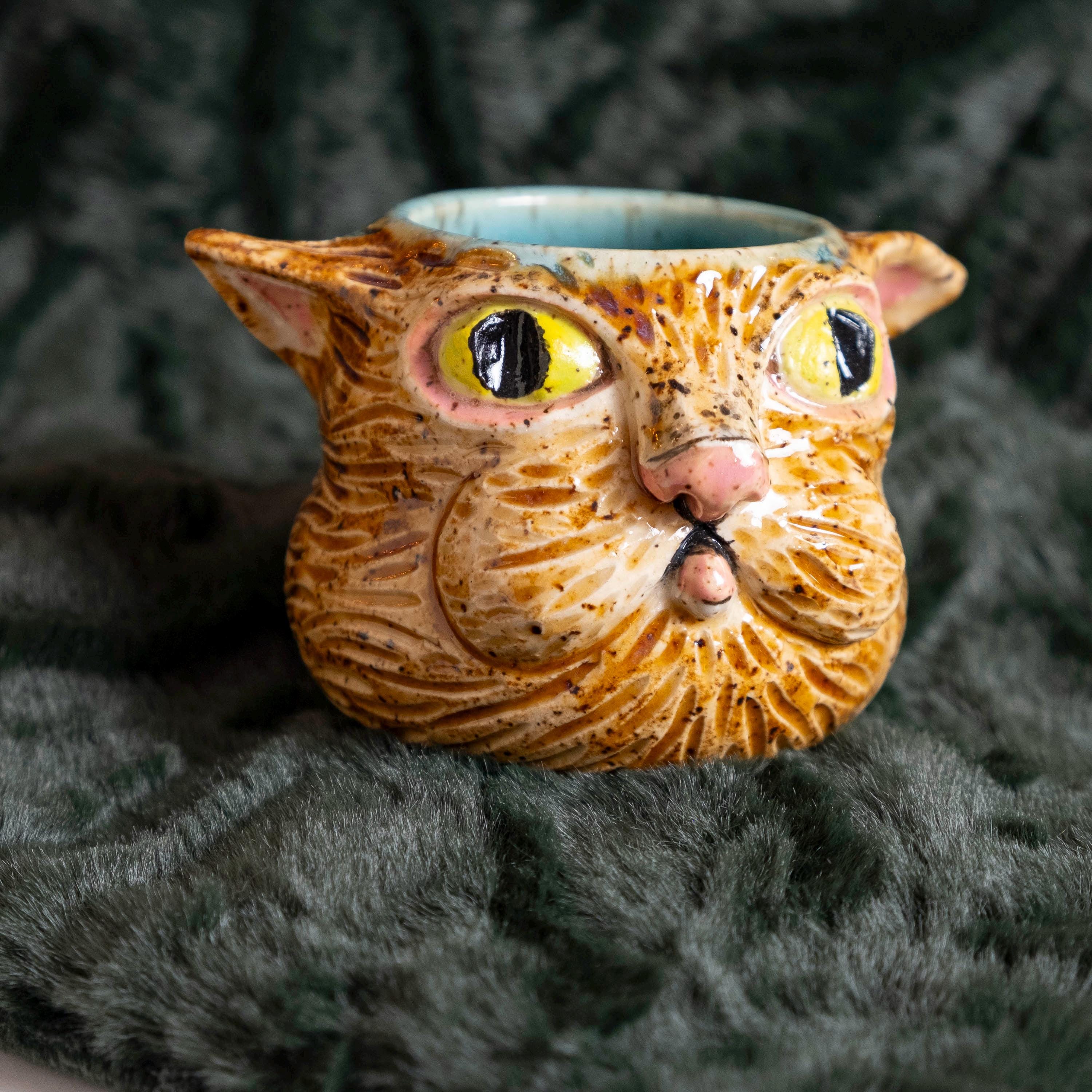 Meow-za! This fluffy little fellow is hand thrown from scratch on the wheel, then sculpted and carved to create an adorable, whimsical shot glass (or trinket dish) with a ton of personality! It features 2 perky & pink ears, yellow/green eyes, a button nose, little cheeks, a tiny mouth, and whispy flowing textured fur. Whether you love cats, kittens, or are just a feline fanatic - this one's for you! It's definitely a little freak - giving 'Gremlin' vibes for sure...