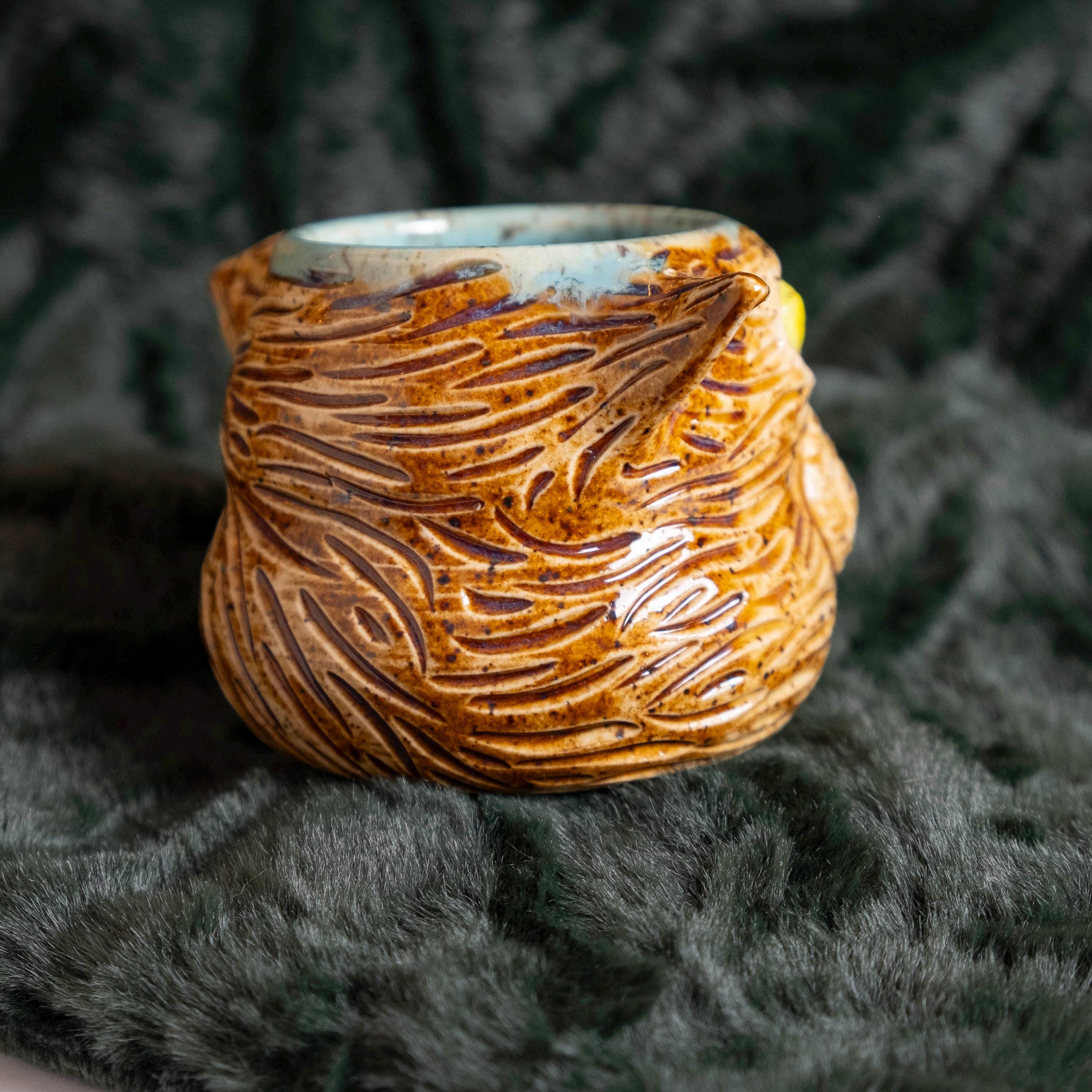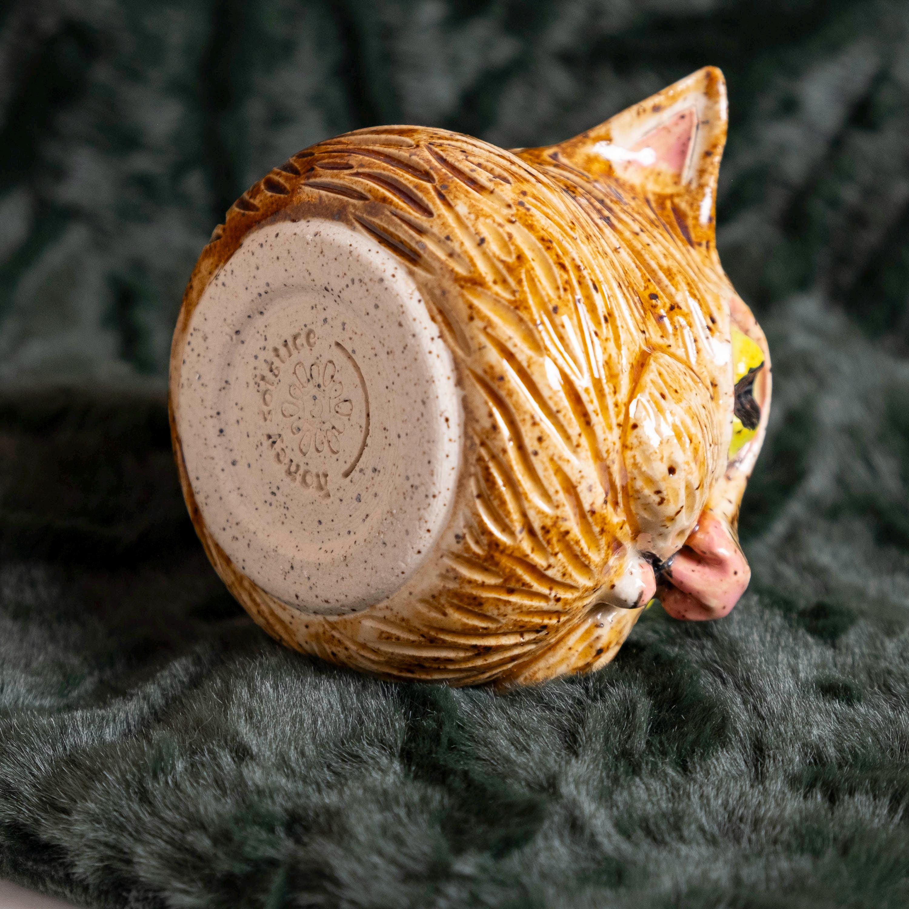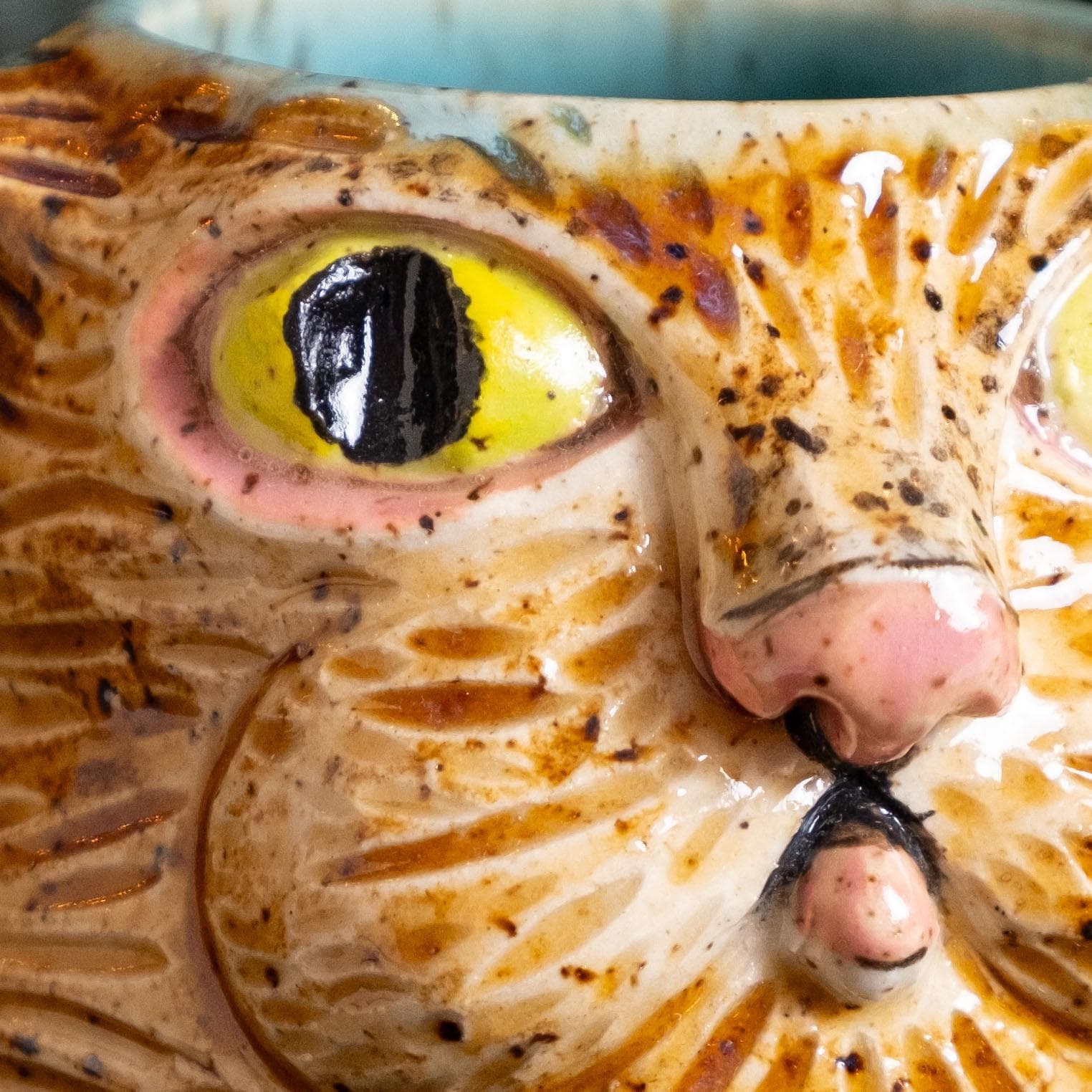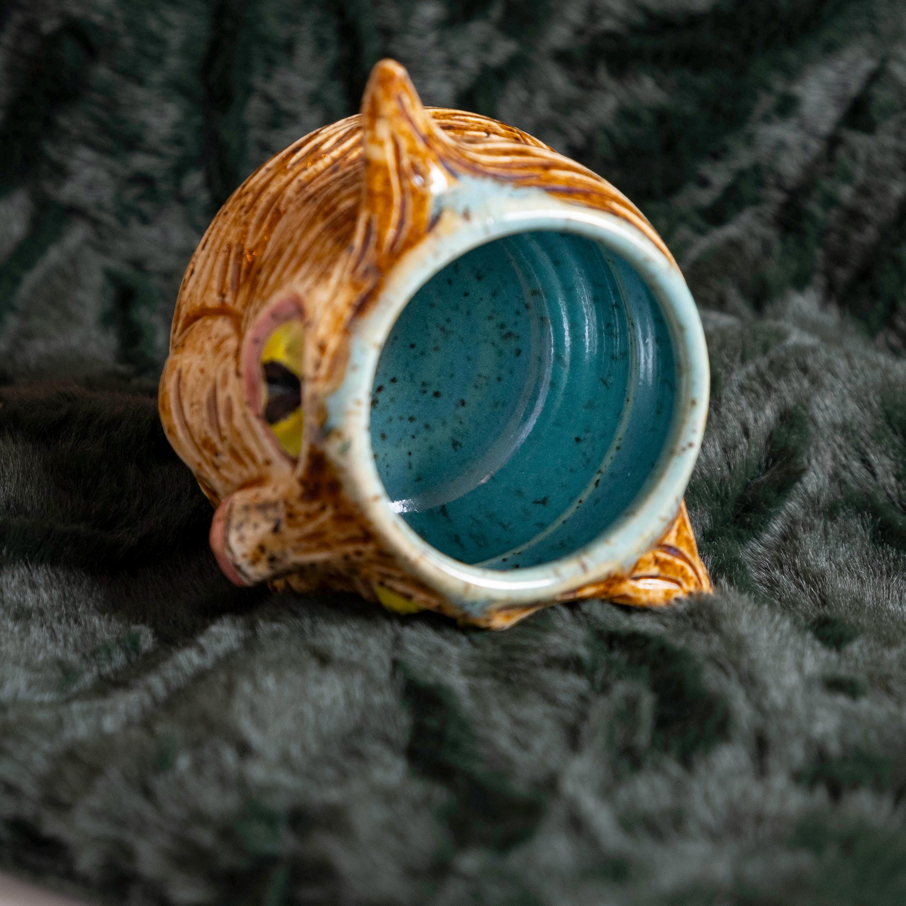 Meow-za! This fluffy little fellow is hand thrown from scratch on the wheel, then sculpted and carved to create an adorable, whimsical shot glass (or trinket dish) with a ton of personality! It features 2 perky & pink ears, yellow/green eyes, a button nose, little cheeks, a tiny mouth, and whispy flowing textured fur. Whether you love cats, kittens, or are just a feline fanatic - this one's for you! It's definitely a little freak - giving 'Gremlin' vibes for sure...