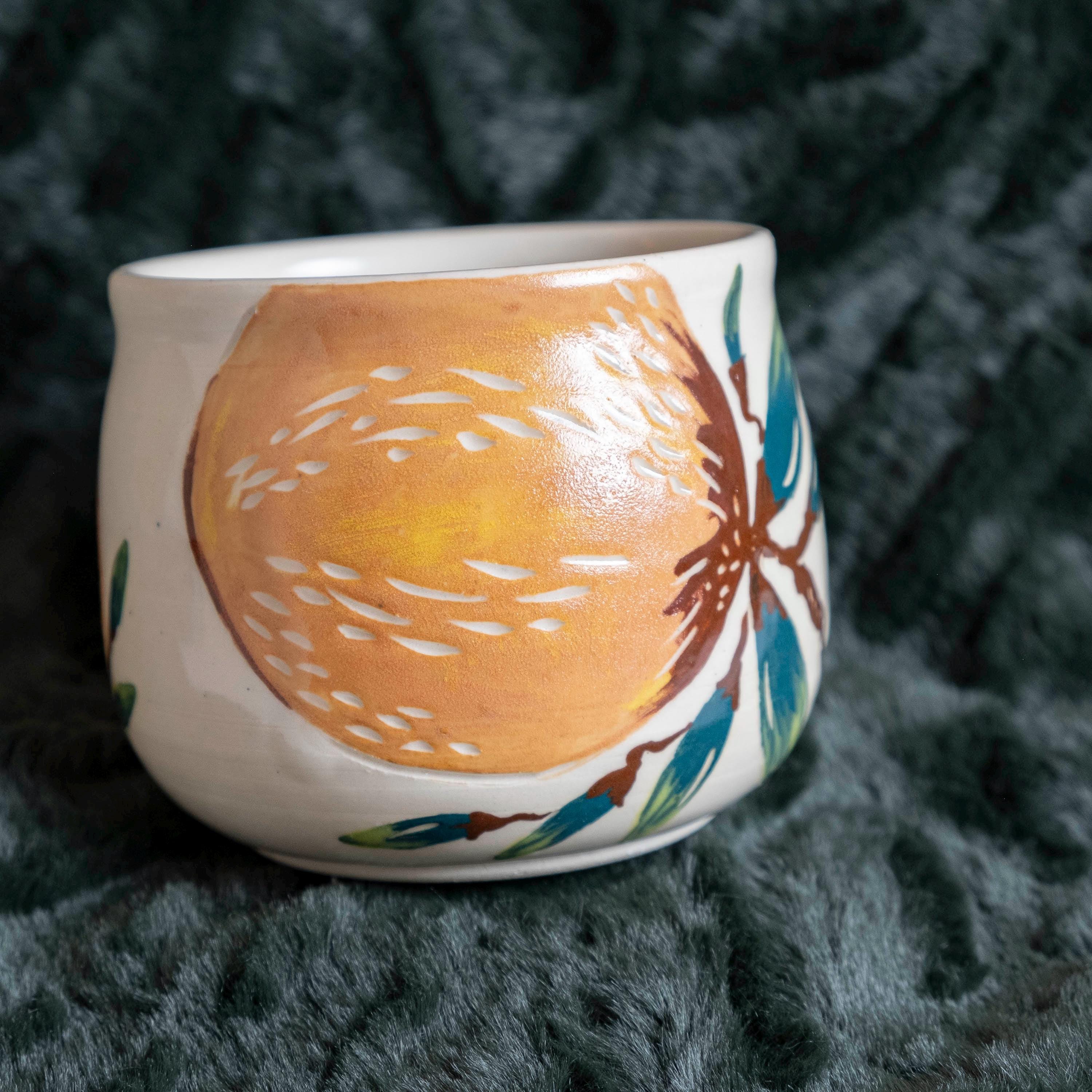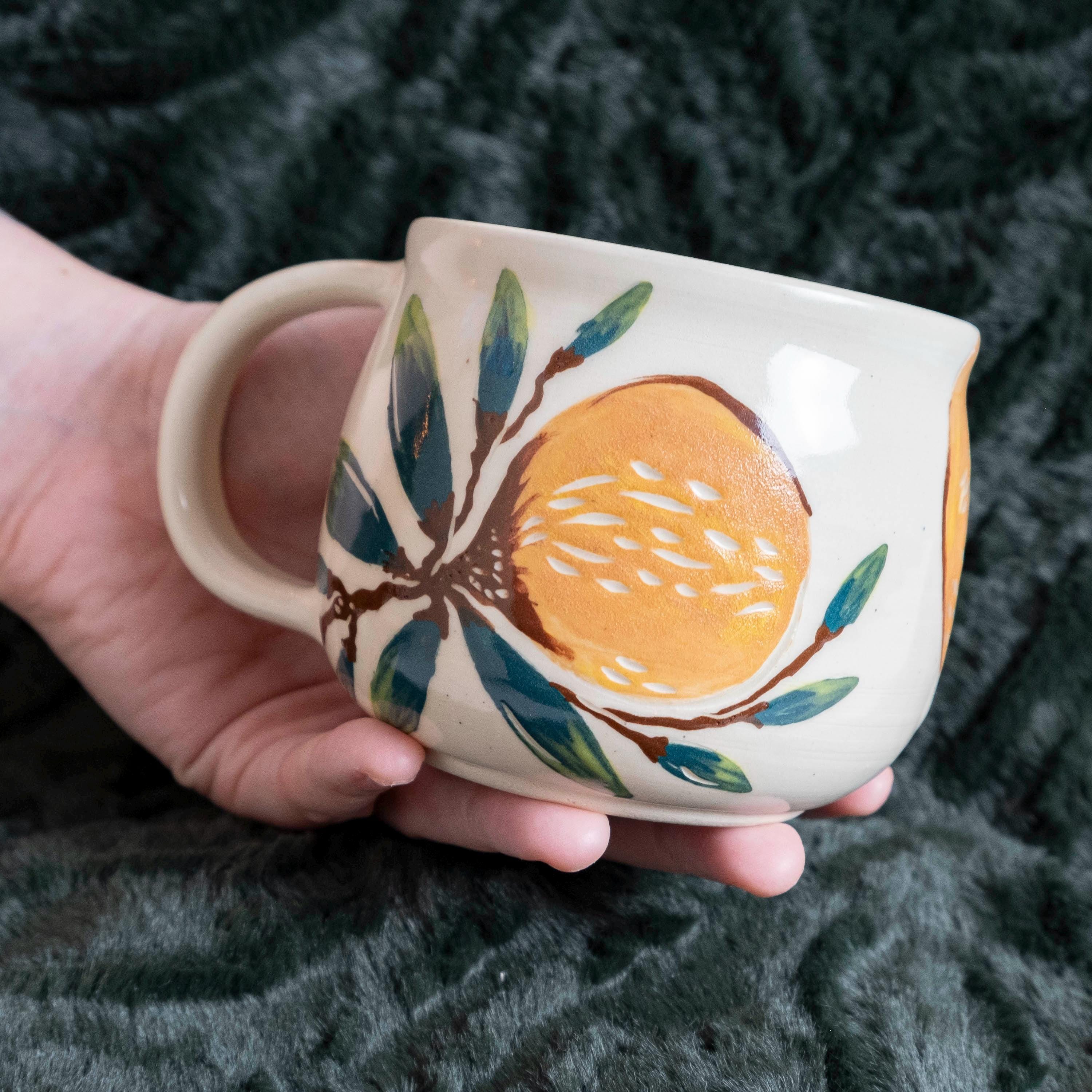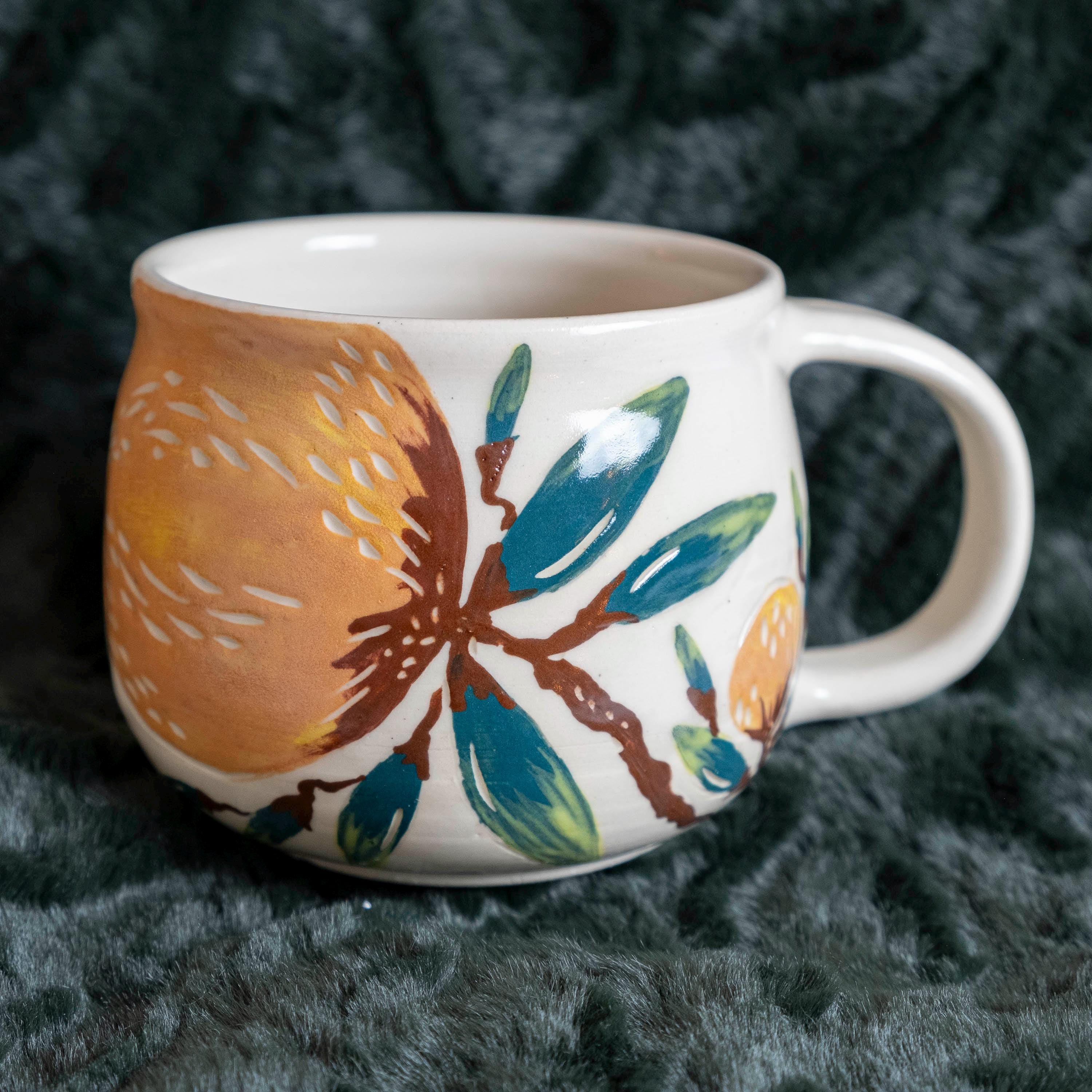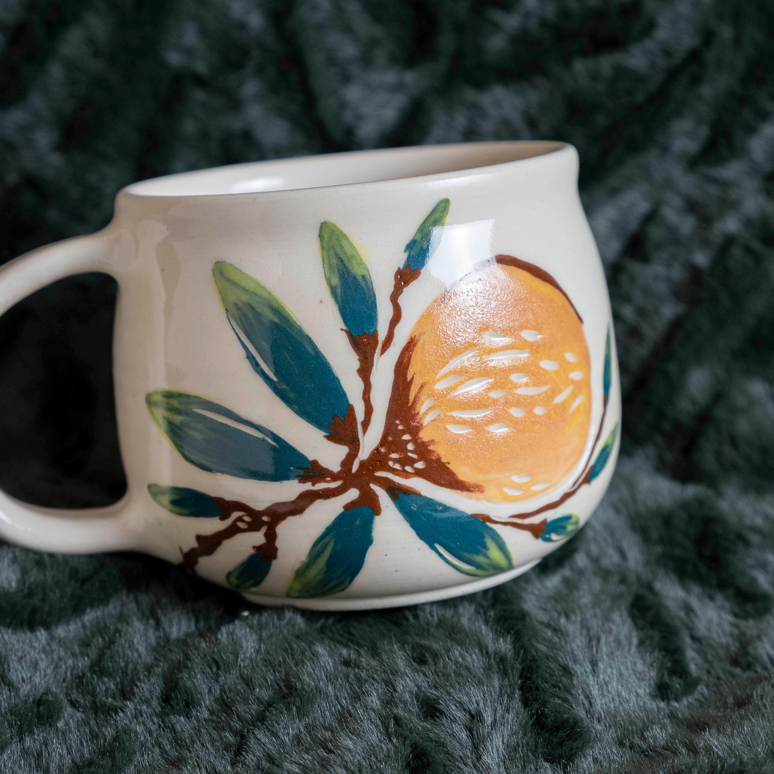This handmade mug is thrown on the wheel and then decorated with an orange fruit motif. The design is hand-painted and illustrated by me, using underglazes. The artwork features clementines hanging on the vine, adorned with little leaves. The overall look is abstract illustrative, with some subtle carved textured added into the design, which wraps around the entire mug. This is a great gift for someone that wants a touch of sunshine added to their day!