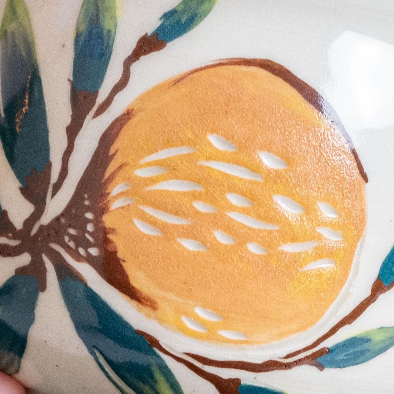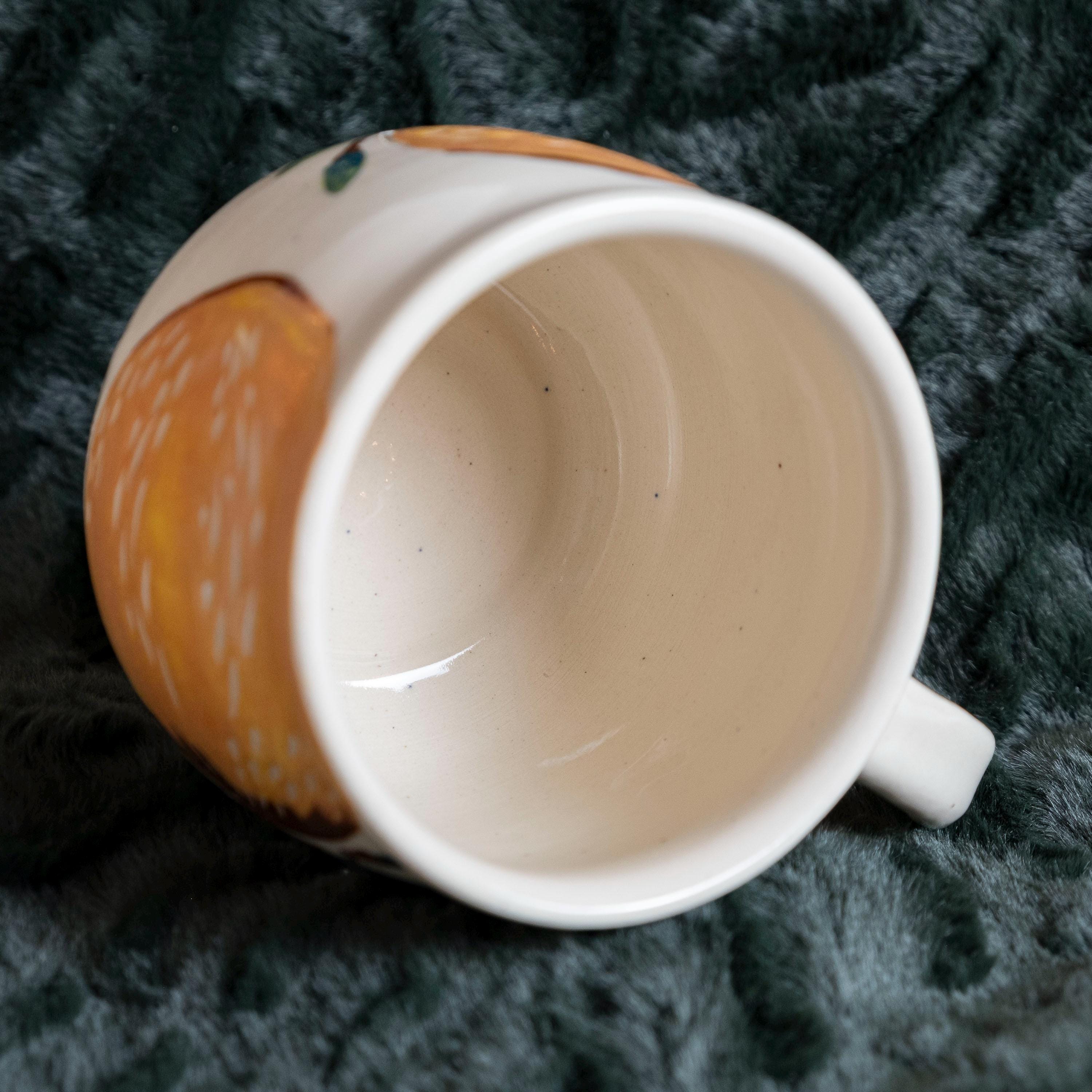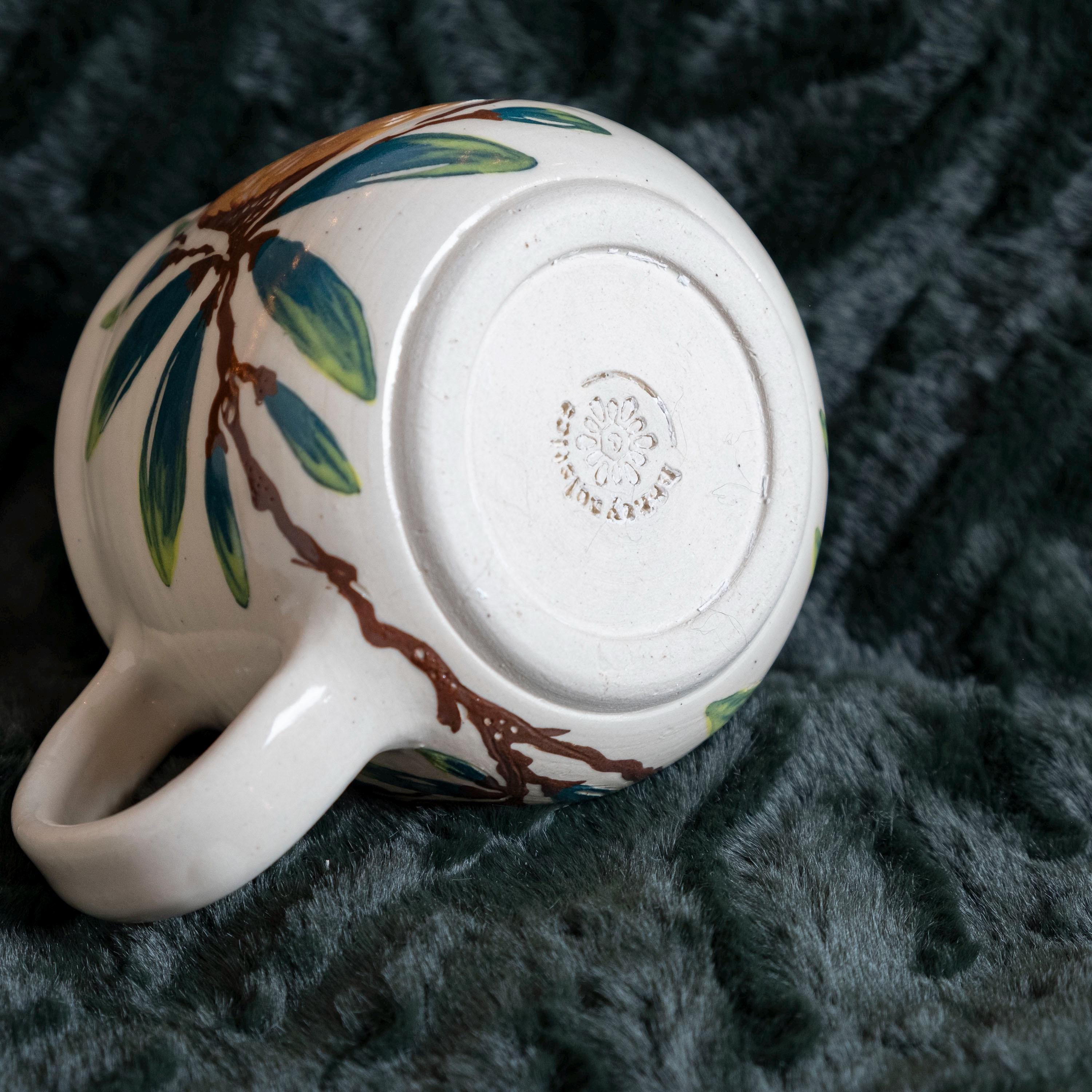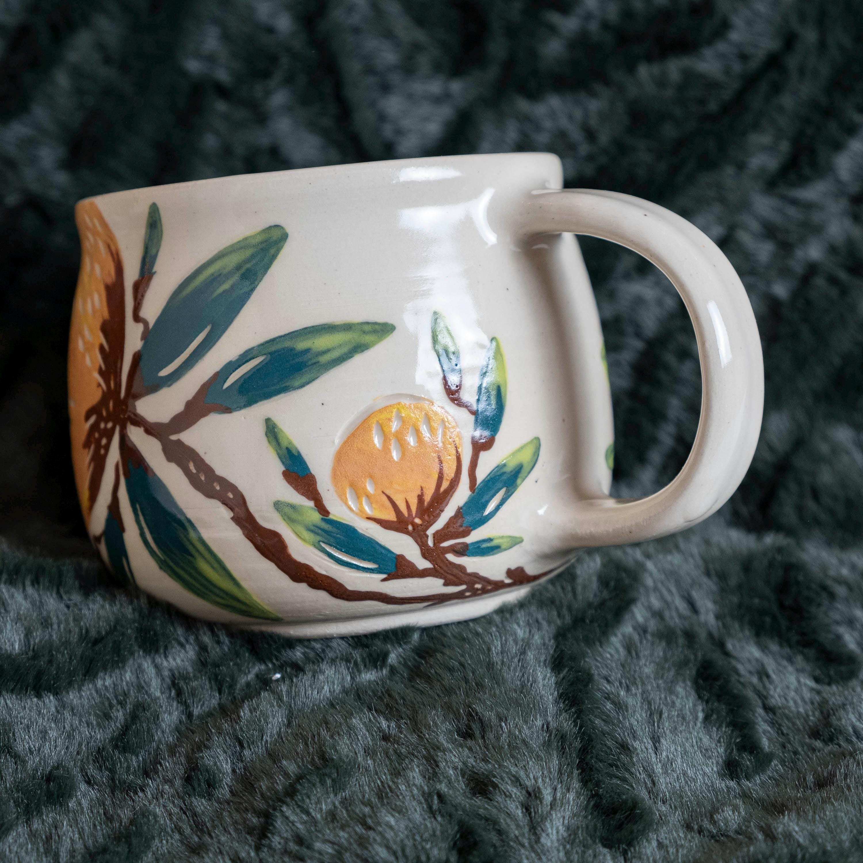 This handmade mug is thrown on the wheel and then decorated with an orange fruit motif. The design is hand-painted and illustrated by me, using underglazes. The artwork features clementines hanging on the vine, adorned with little leaves. The overall look is abstract illustrative, with some subtle carved textured added into the design, which wraps around the entire mug. This is a great gift for someone that wants a touch of sunshine added to their day!