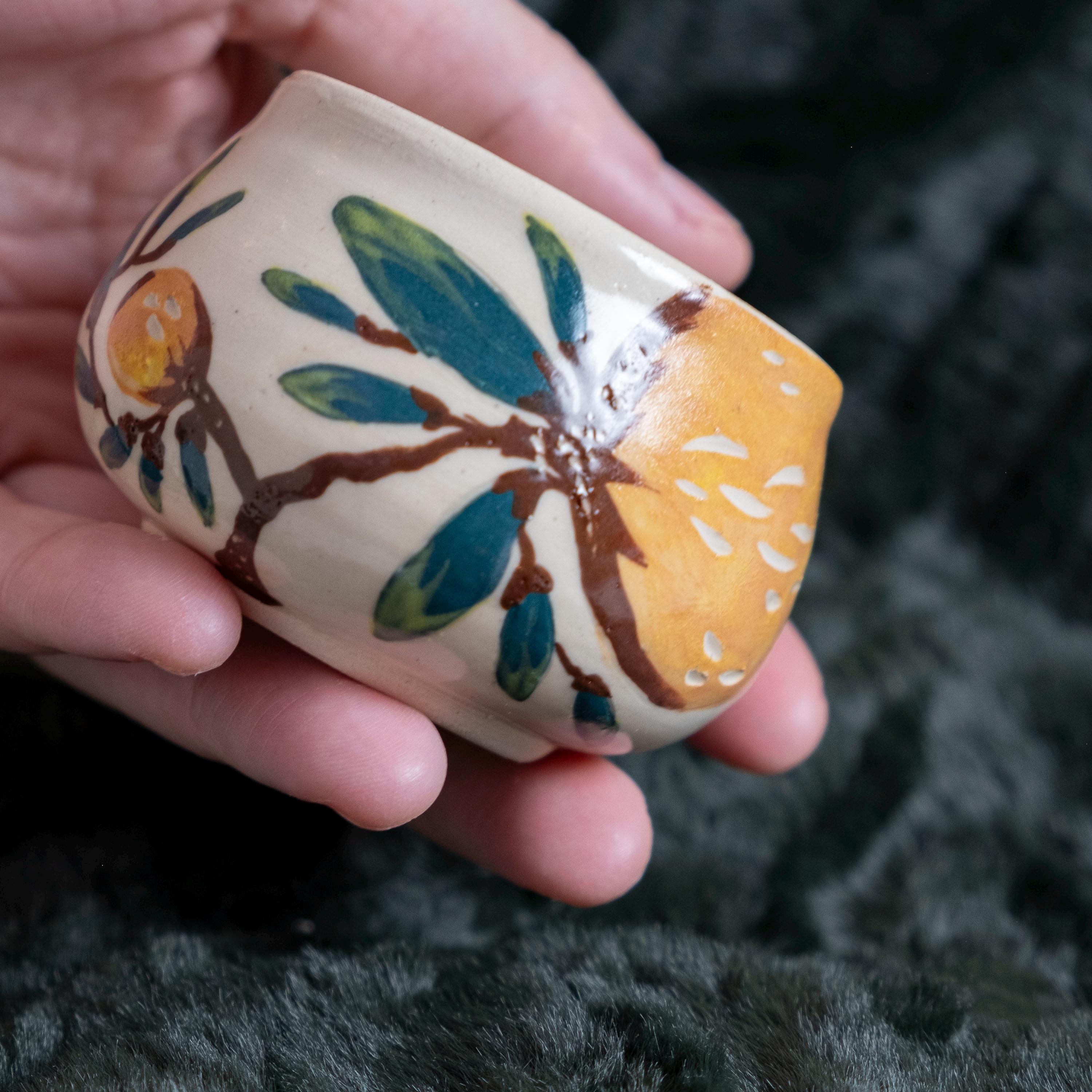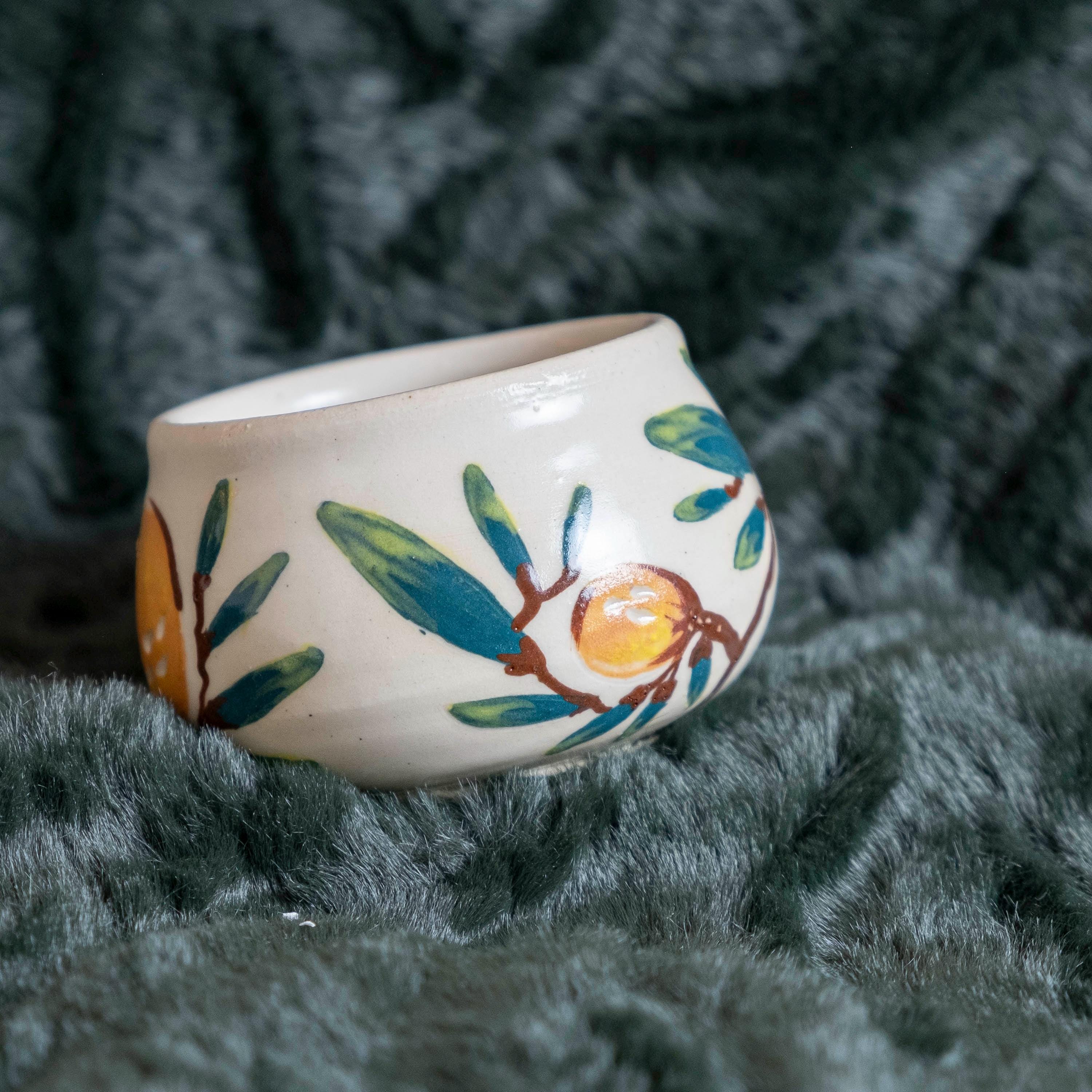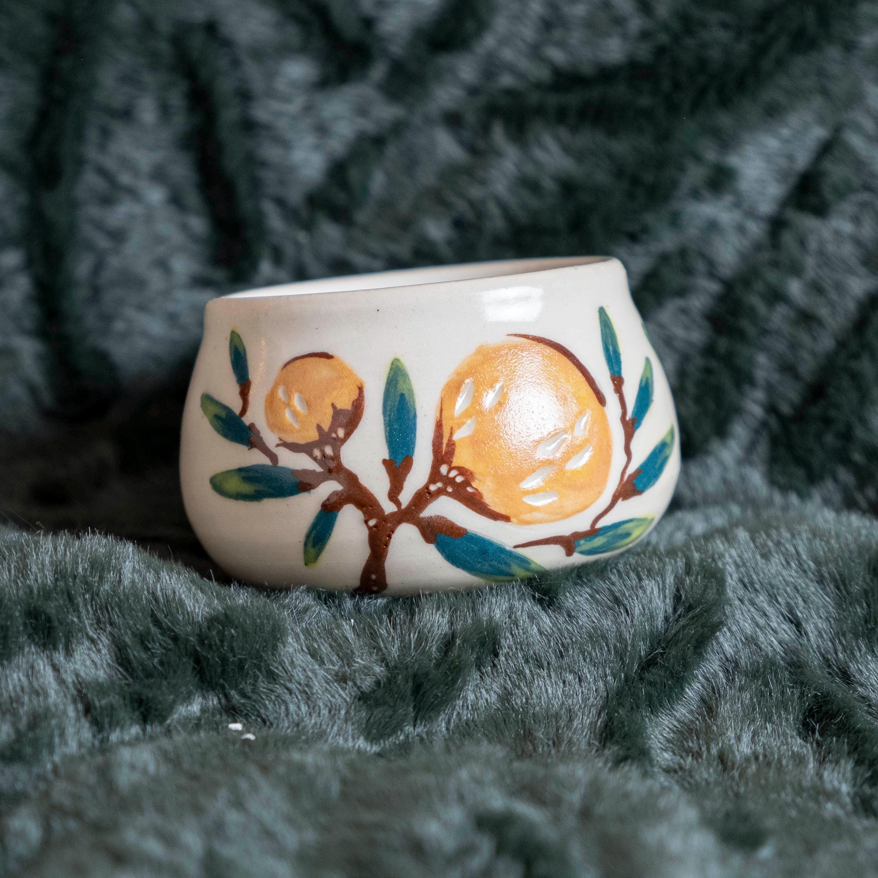 This handmade ceramic shot glass is thrown on the wheel and then decorated with an orange fruit motif. The design is hand-painted and illustrated by me, using underglazes. The artwork features clementines hanging on the vine, adorned with little leaves. The overall look is abstract illustrative, with some subtle carved textured added into the design, which wraps around the entire piece. This is a great gift for someone that wants a touch of sunshine added to their day!