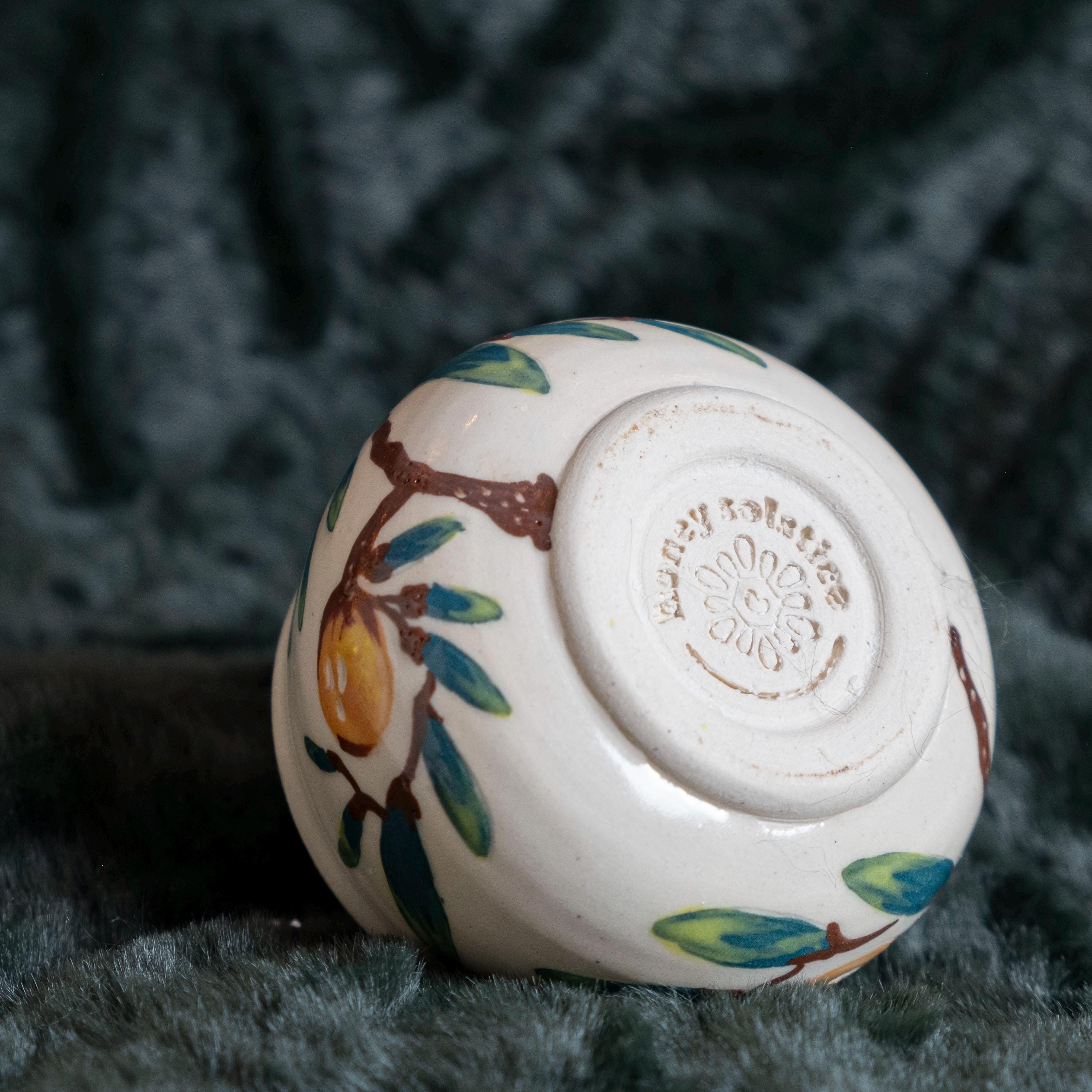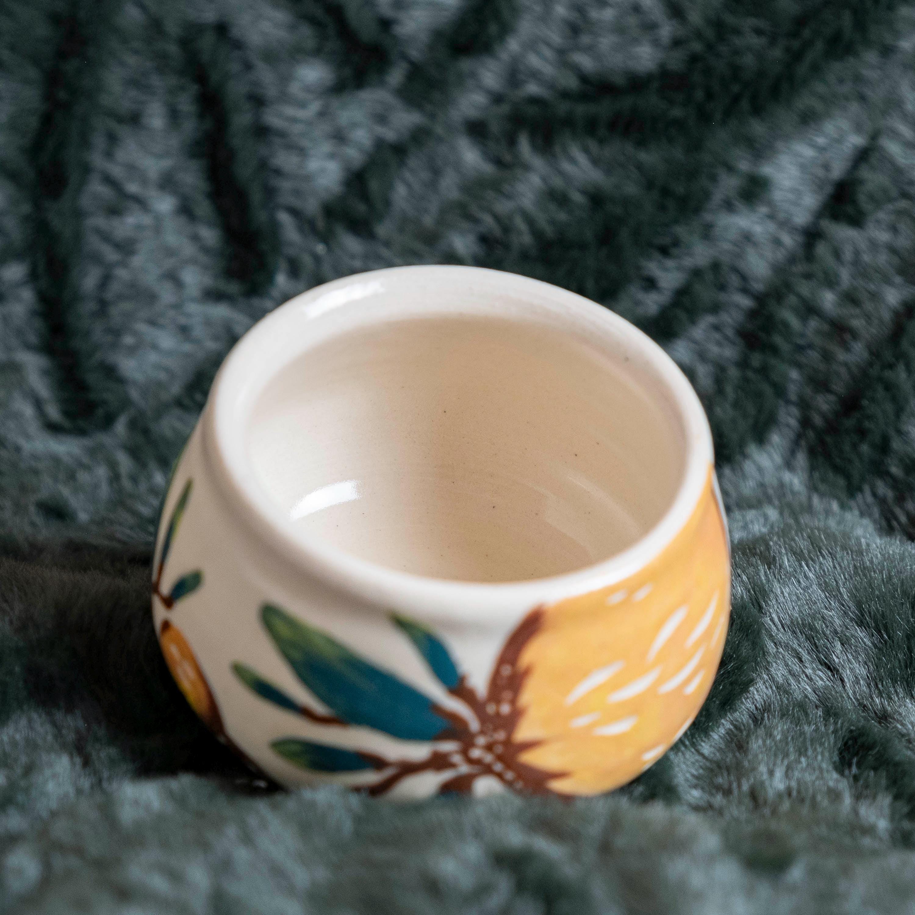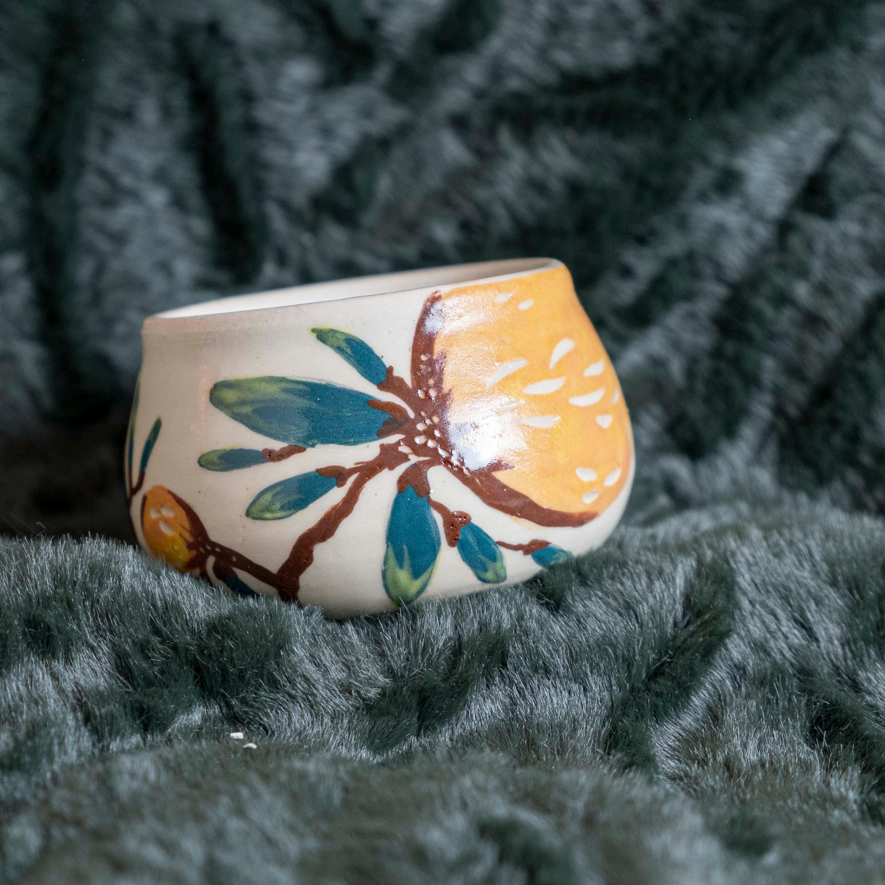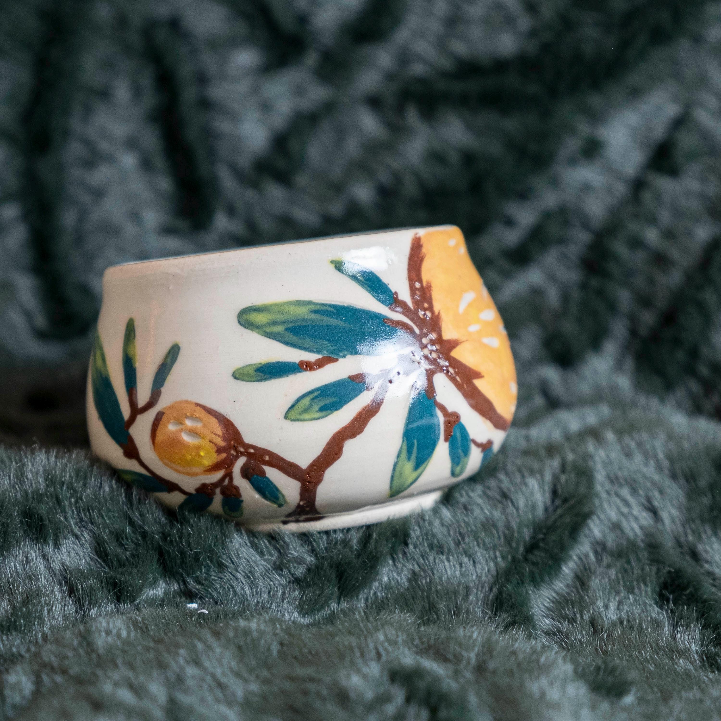 This handmade ceramic shot glass is thrown on the wheel and then decorated with an orange fruit motif. The design is hand-painted and illustrated by me, using underglazes. The artwork features clementines hanging on the vine, adorned with little leaves. The overall look is abstract illustrative, with some subtle carved textured added into the design, which wraps around the entire piece. This is a great gift for someone that wants a touch of sunshine added to their day!