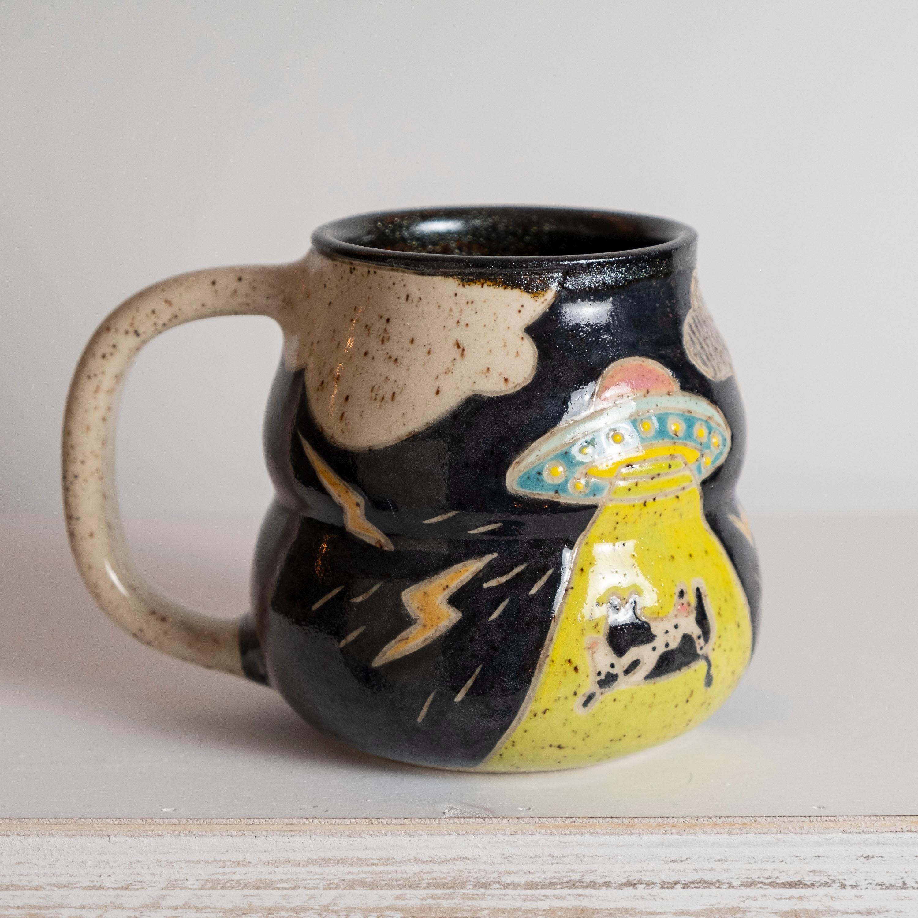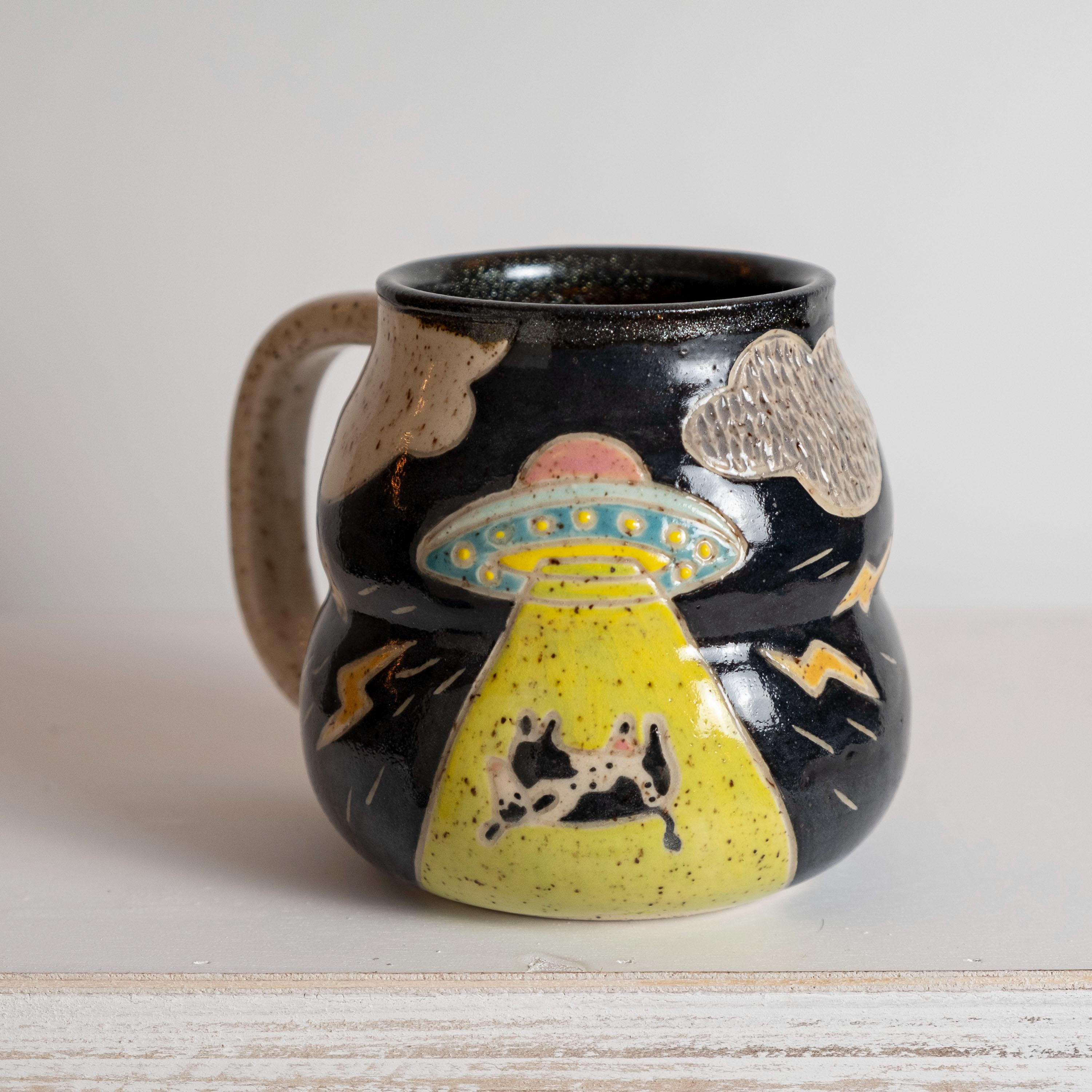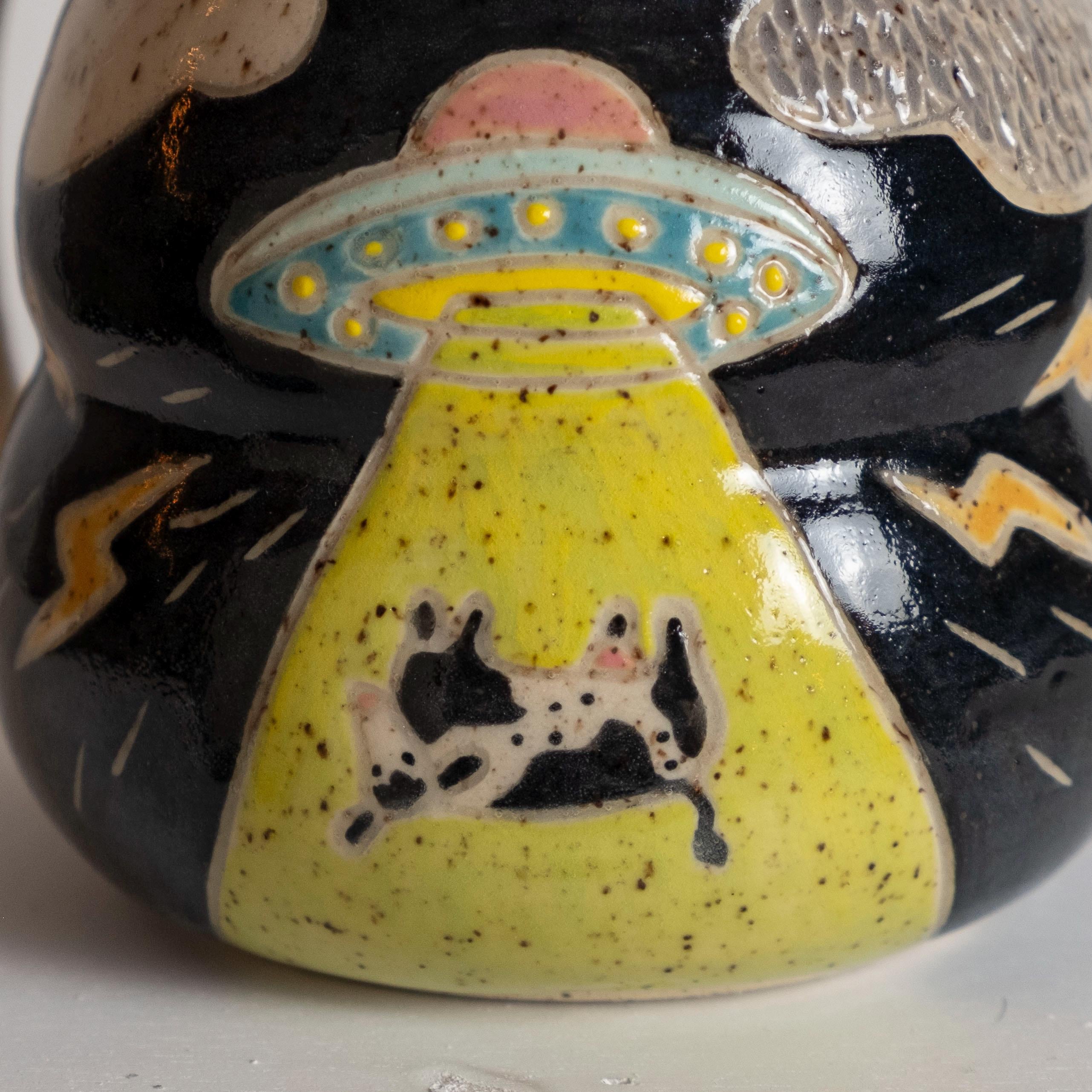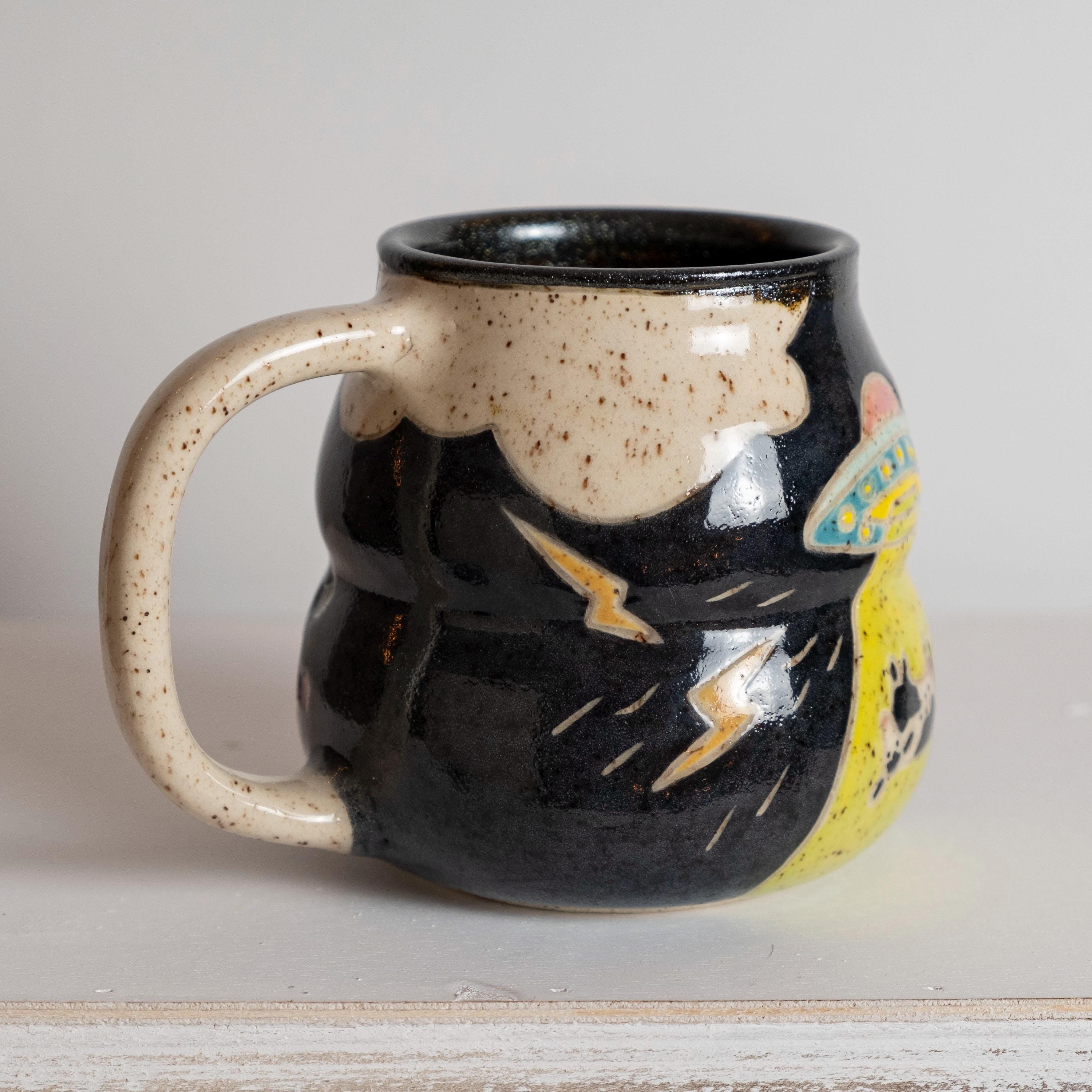 This ceramic bubble mug was thrown on the wheel and then decorated with a spooky, freaky design. One side of the mug featured an illustrated space ship abducting a down in a beam of light, surrounded by clouds and lightening bolts. The other side of the mug features a floating black alien, surrounded by lava lamp blobs of goo. The liner glaze for this mug is black glitter that really sparkles! Beam me up! (Probing costs extra...)