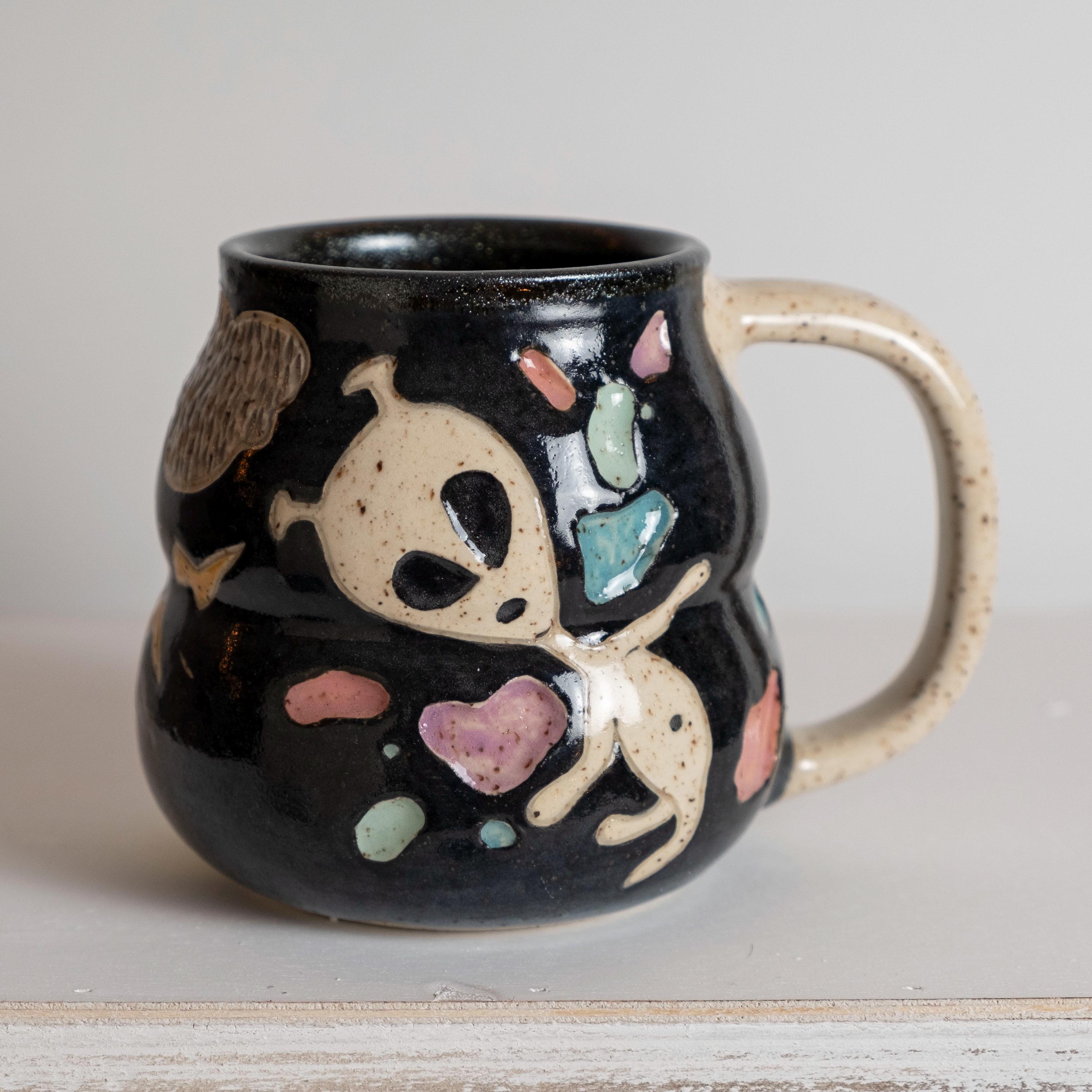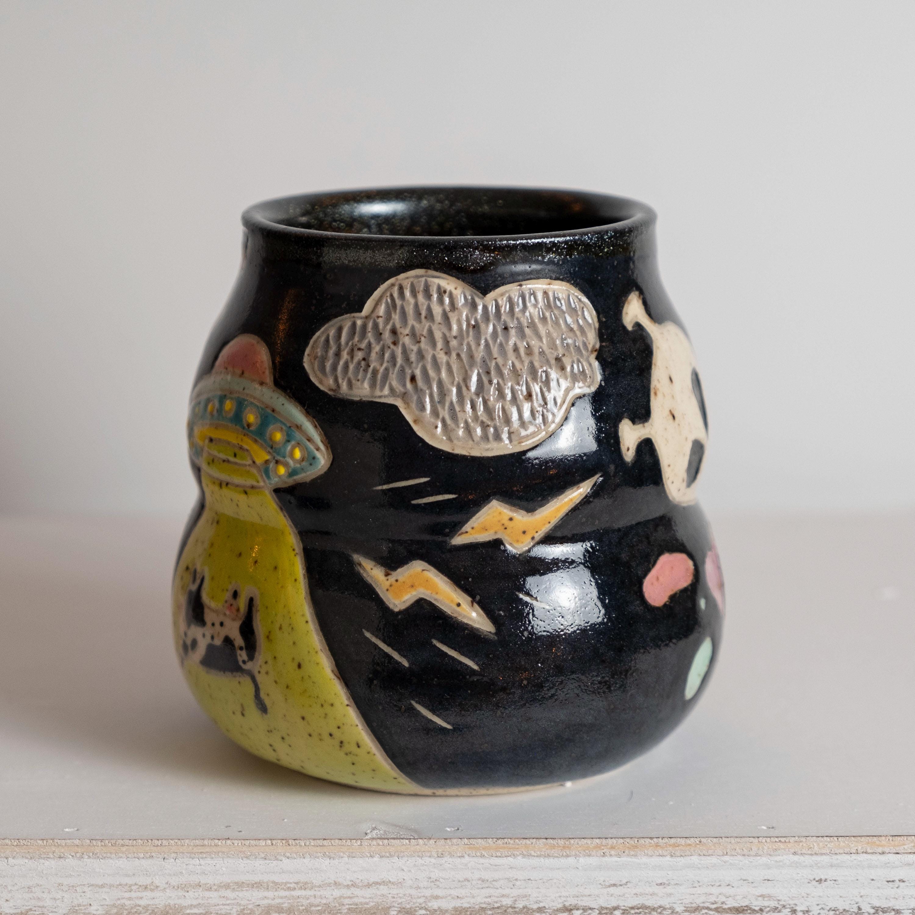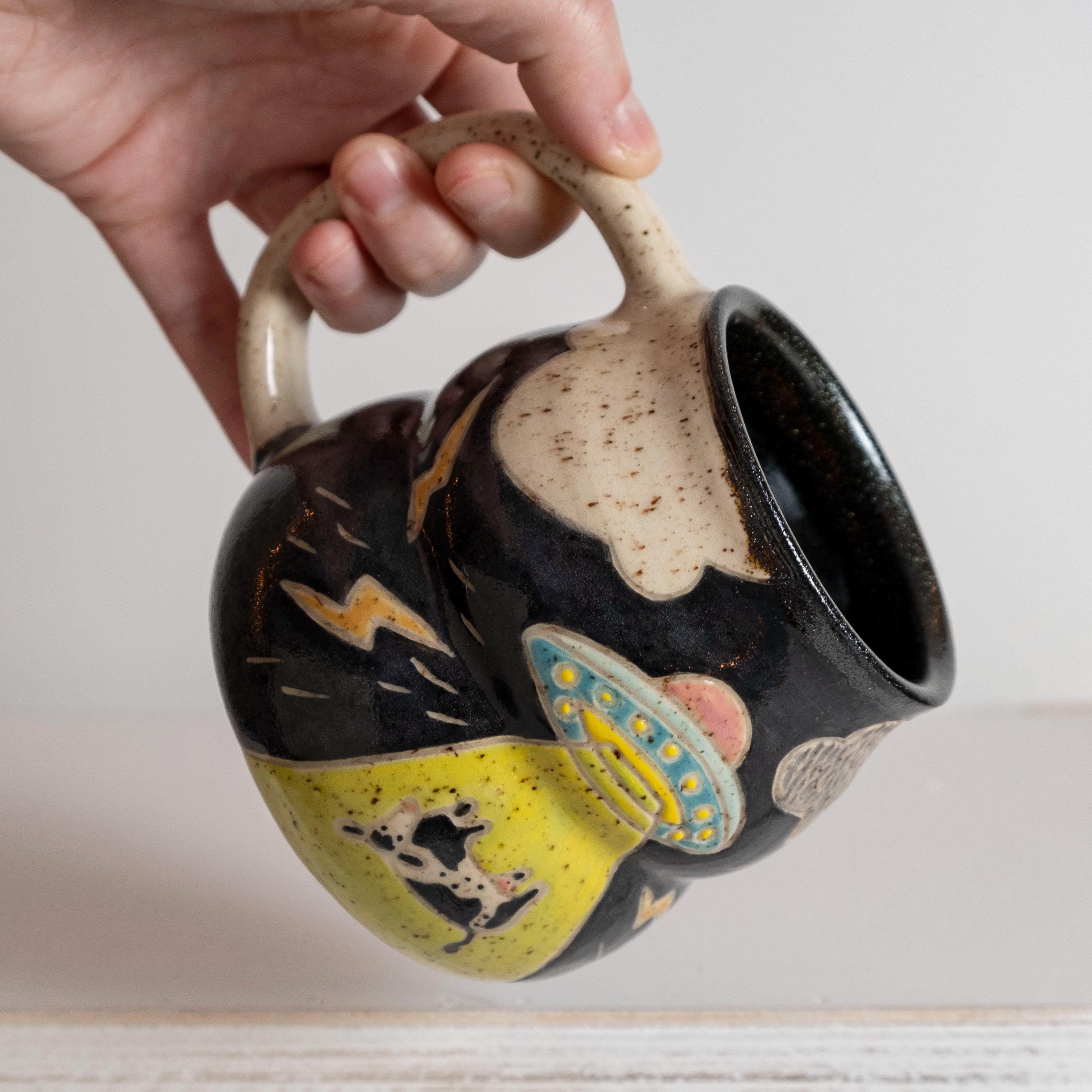 This ceramic bubble mug was thrown on the wheel and then decorated with a spooky, freaky design. One side of the mug featured an illustrated space ship abducting a down in a beam of light, surrounded by clouds and lightening bolts. The other side of the mug features a floating black alien, surrounded by lava lamp blobs of goo. The liner glaze for this mug is black glitter that really sparkles! Beam me up! (Probing costs extra...)