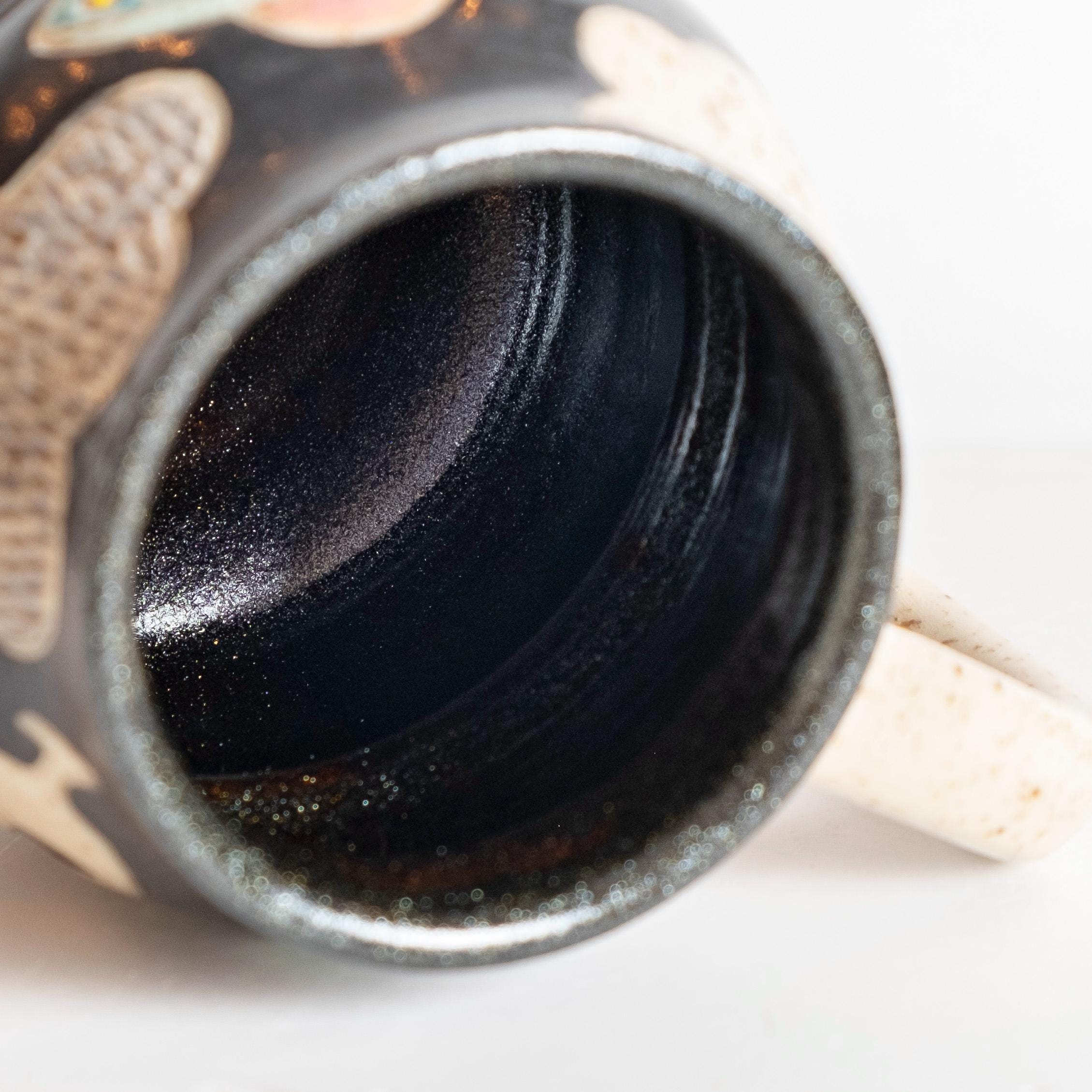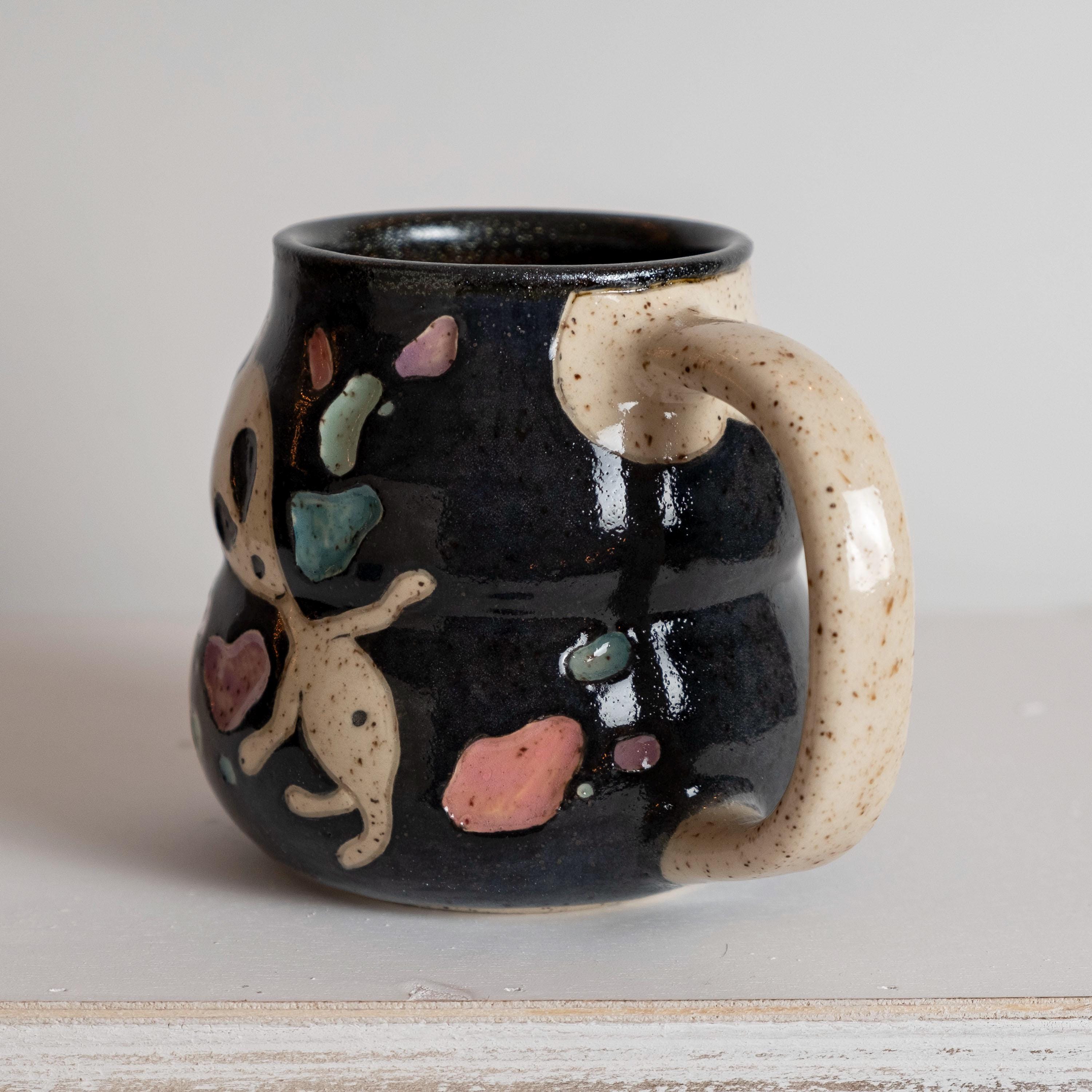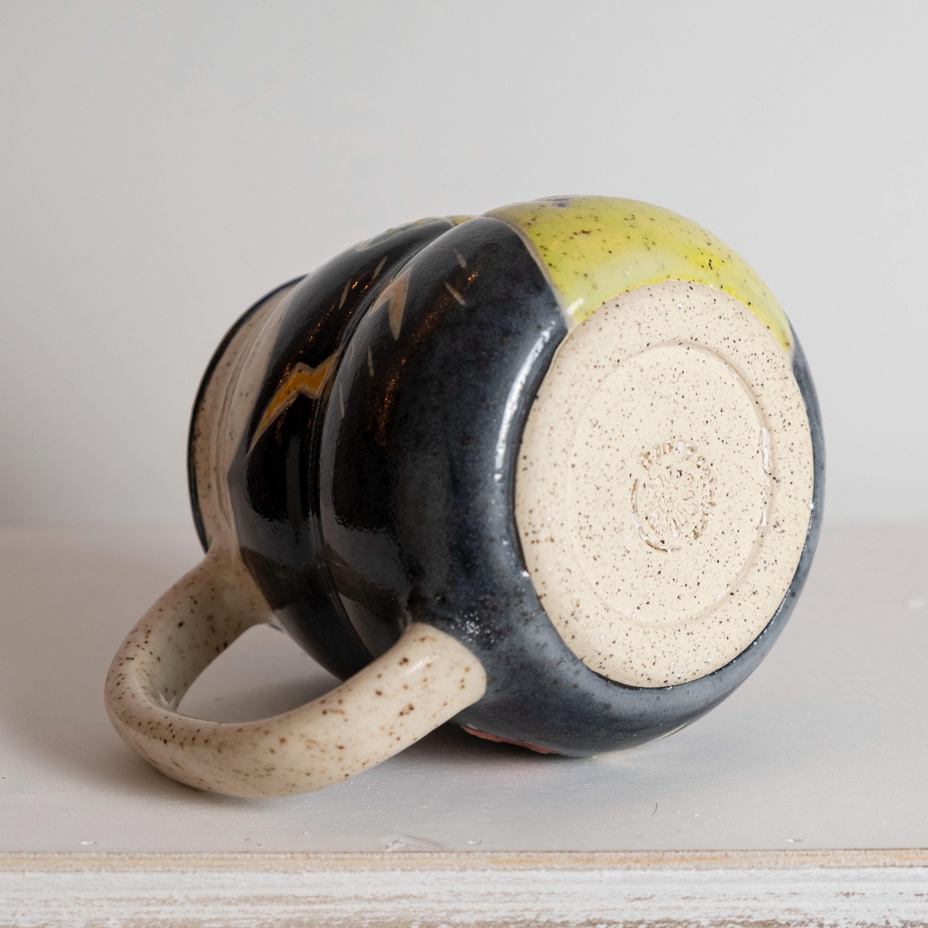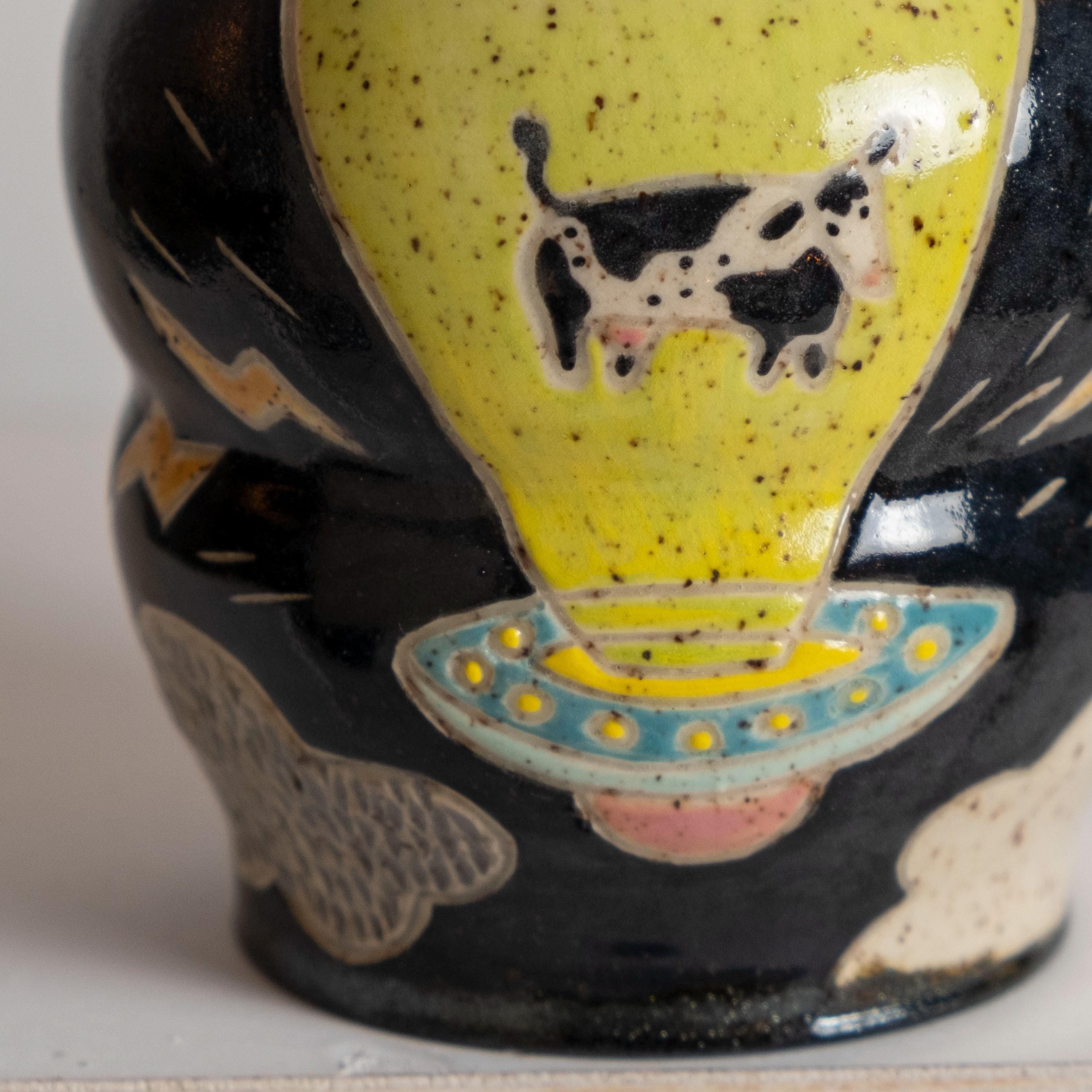 This ceramic bubble mug was thrown on the wheel and then decorated with a spooky, freaky design. One side of the mug featured an illustrated space ship abducting a down in a beam of light, surrounded by clouds and lightening bolts. The other side of the mug features a floating black alien, surrounded by lava lamp blobs of goo. The liner glaze for this mug is black glitter that really sparkles! Beam me up! (Probing costs extra...)