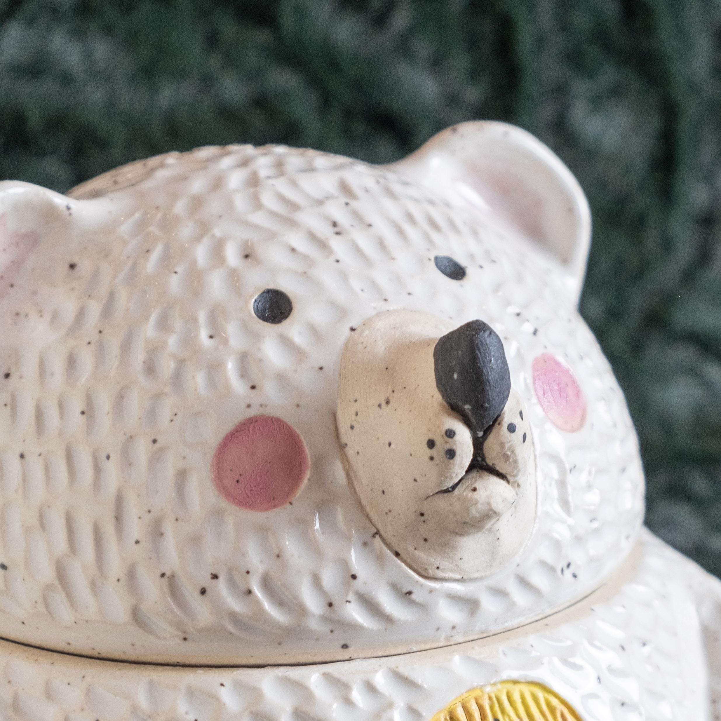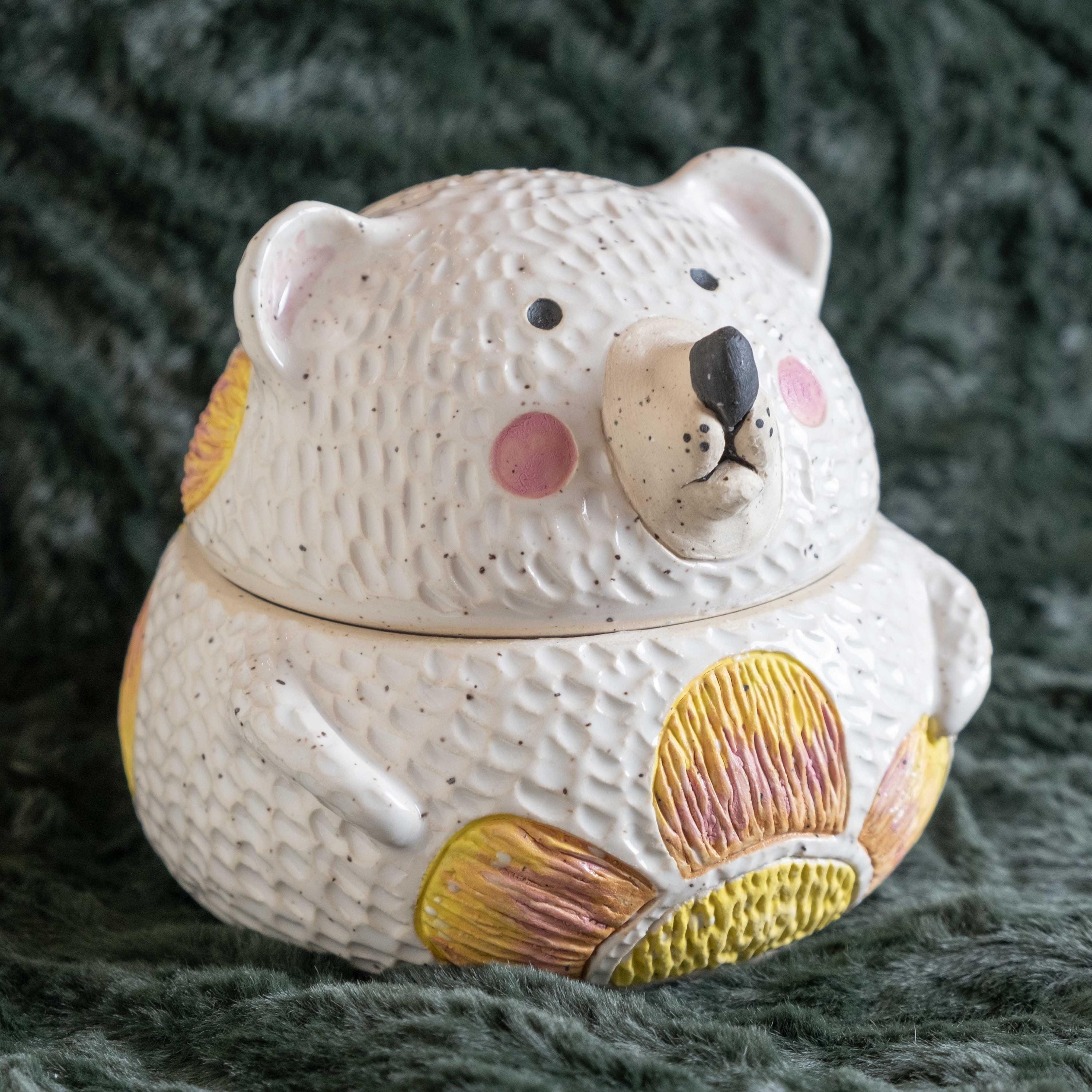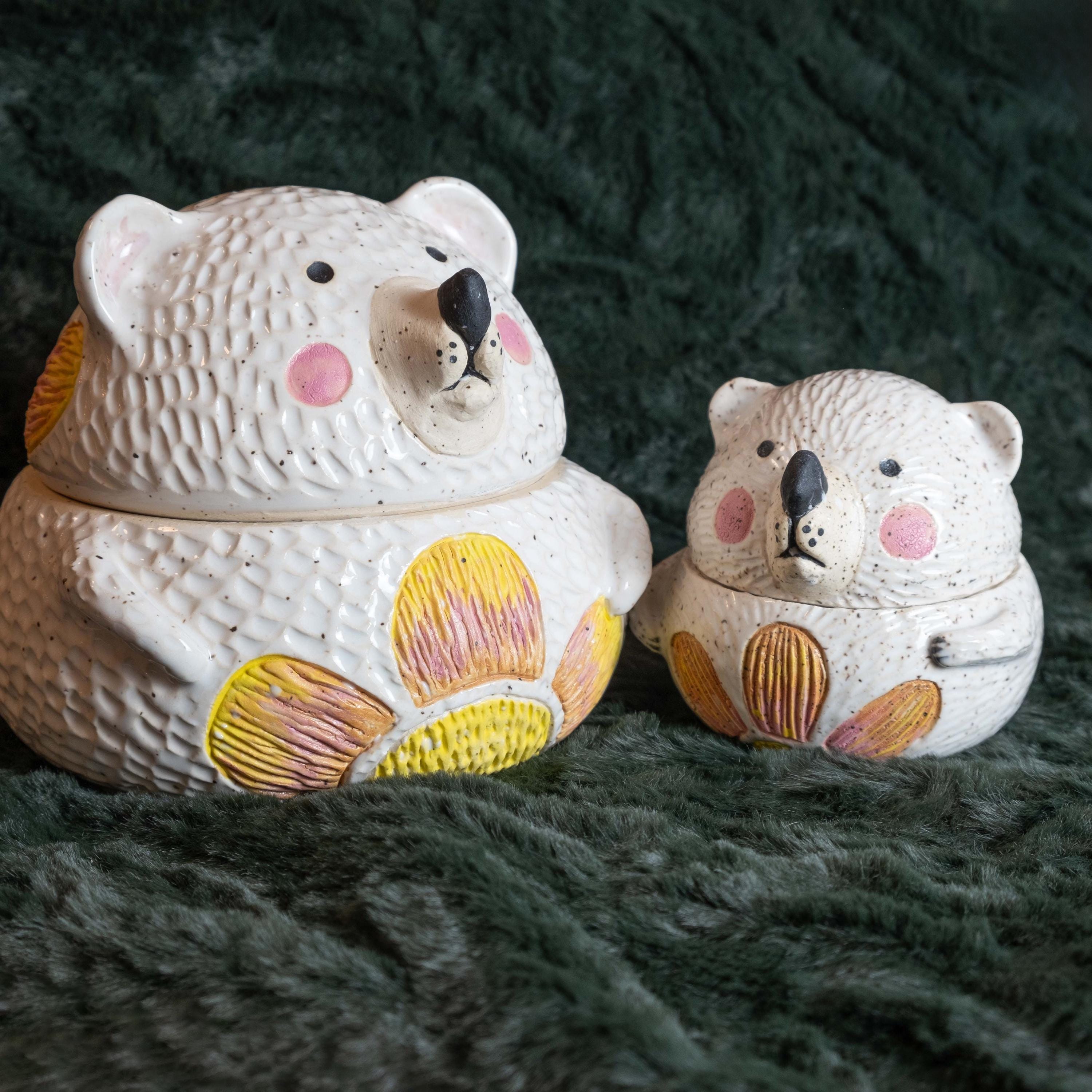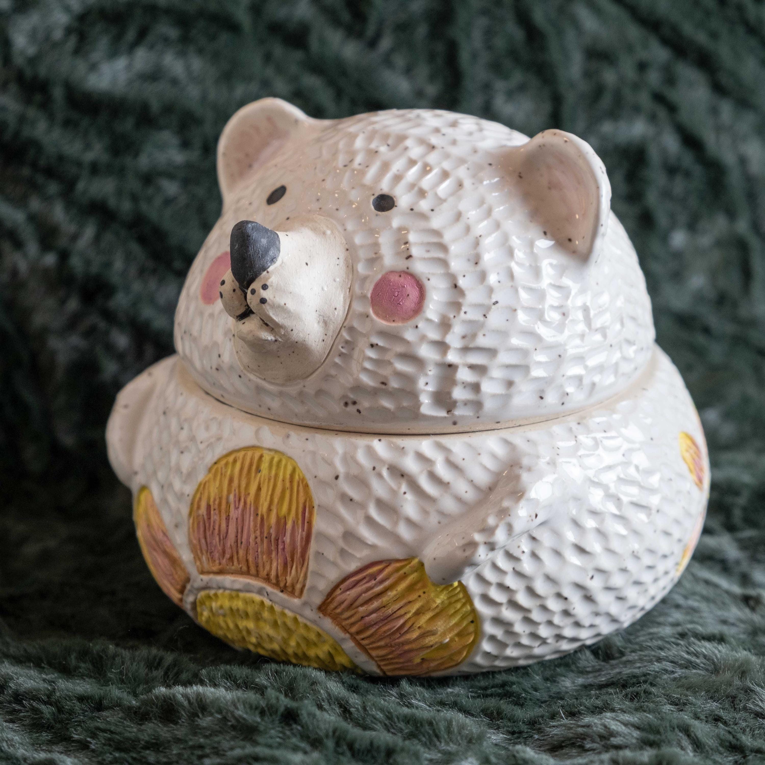 This chonky guy is hand-thrown from scratch on the wheel, then sculpted and carved to create the cutest, cheeky bear cookie jar! The carved faux fur texture is chilly and whimsical. This piece will brighten your space and is the perfect spot to store wrapped candies, cookies, jewelry, or other nicknacks. The seal is close to air tight, a good fit. 🤍✨