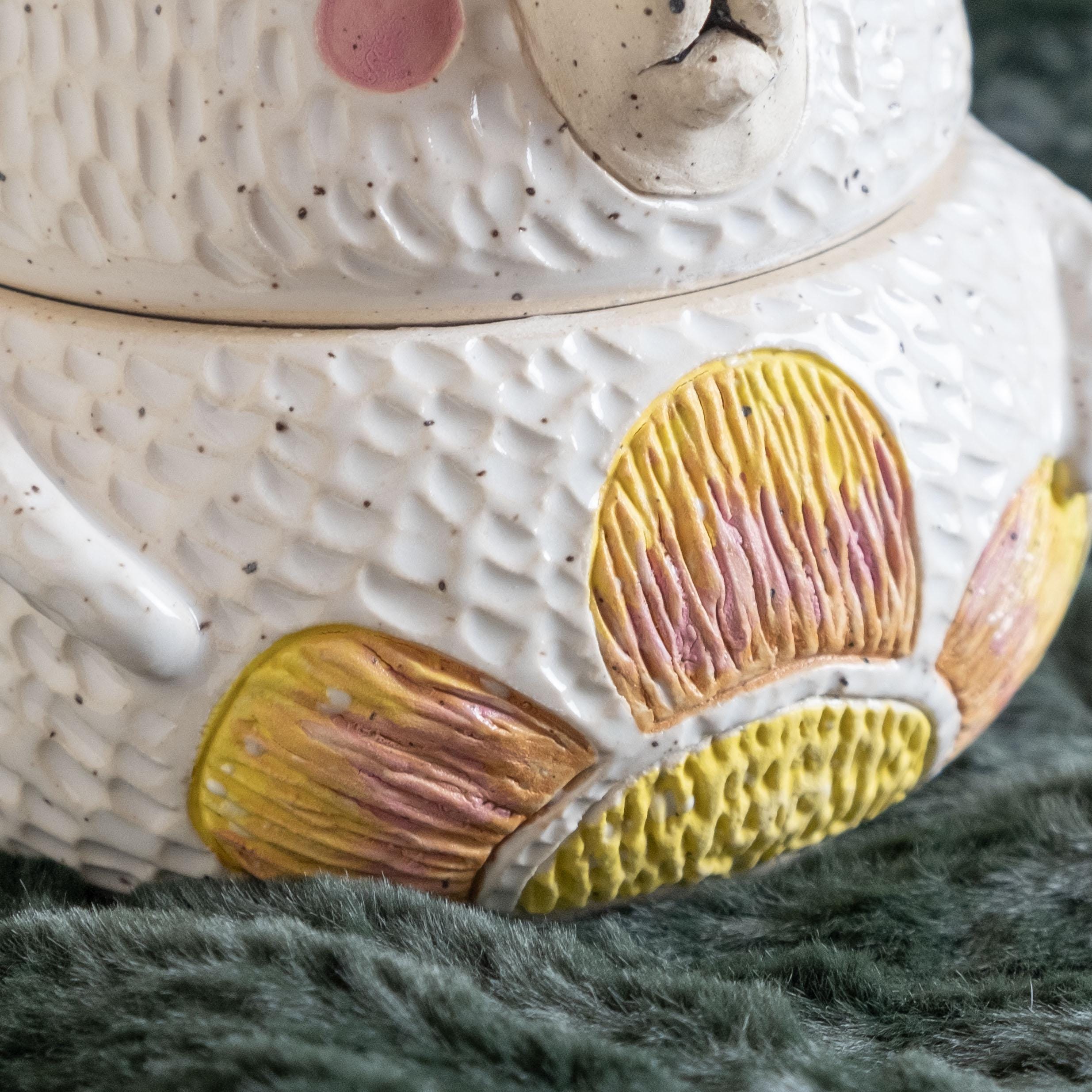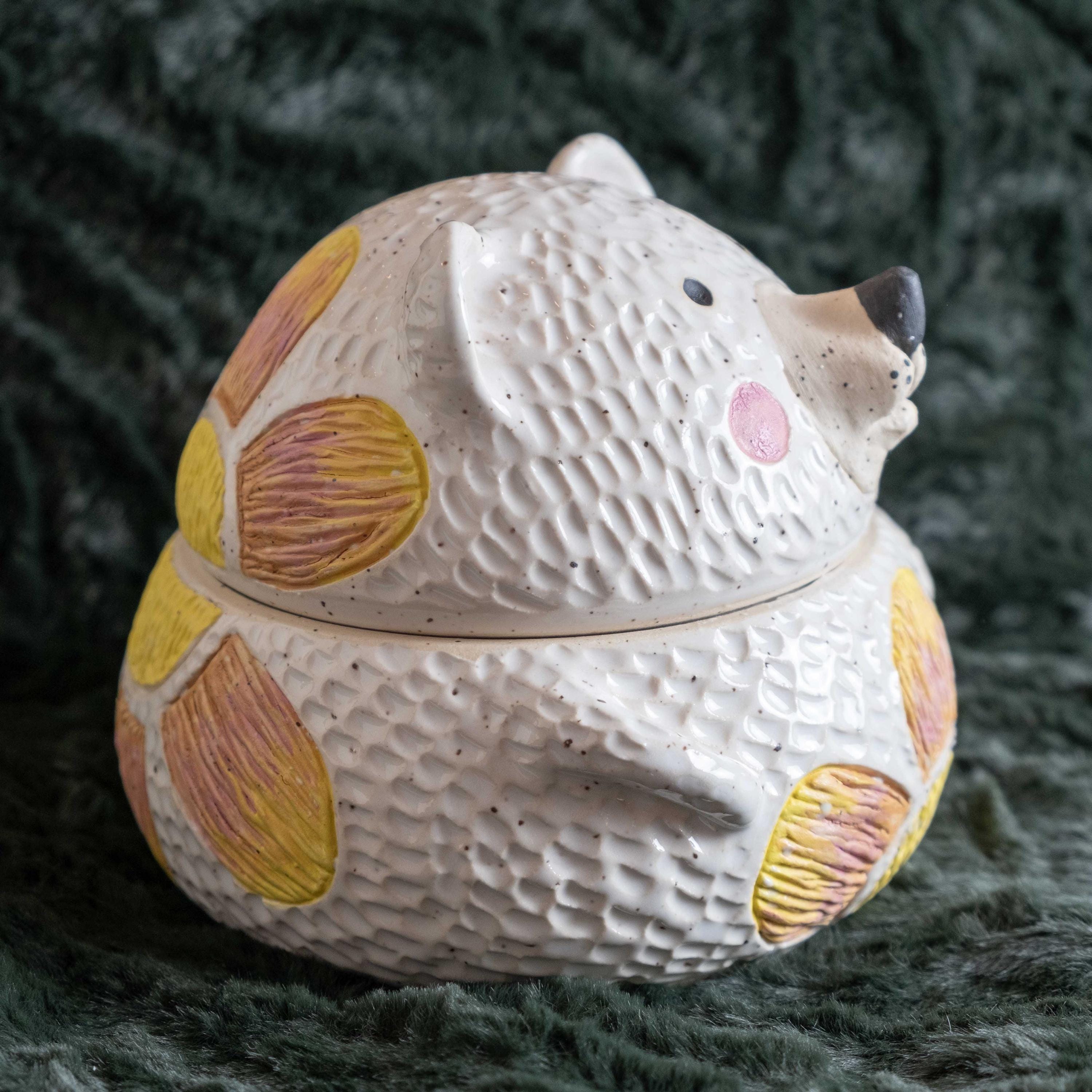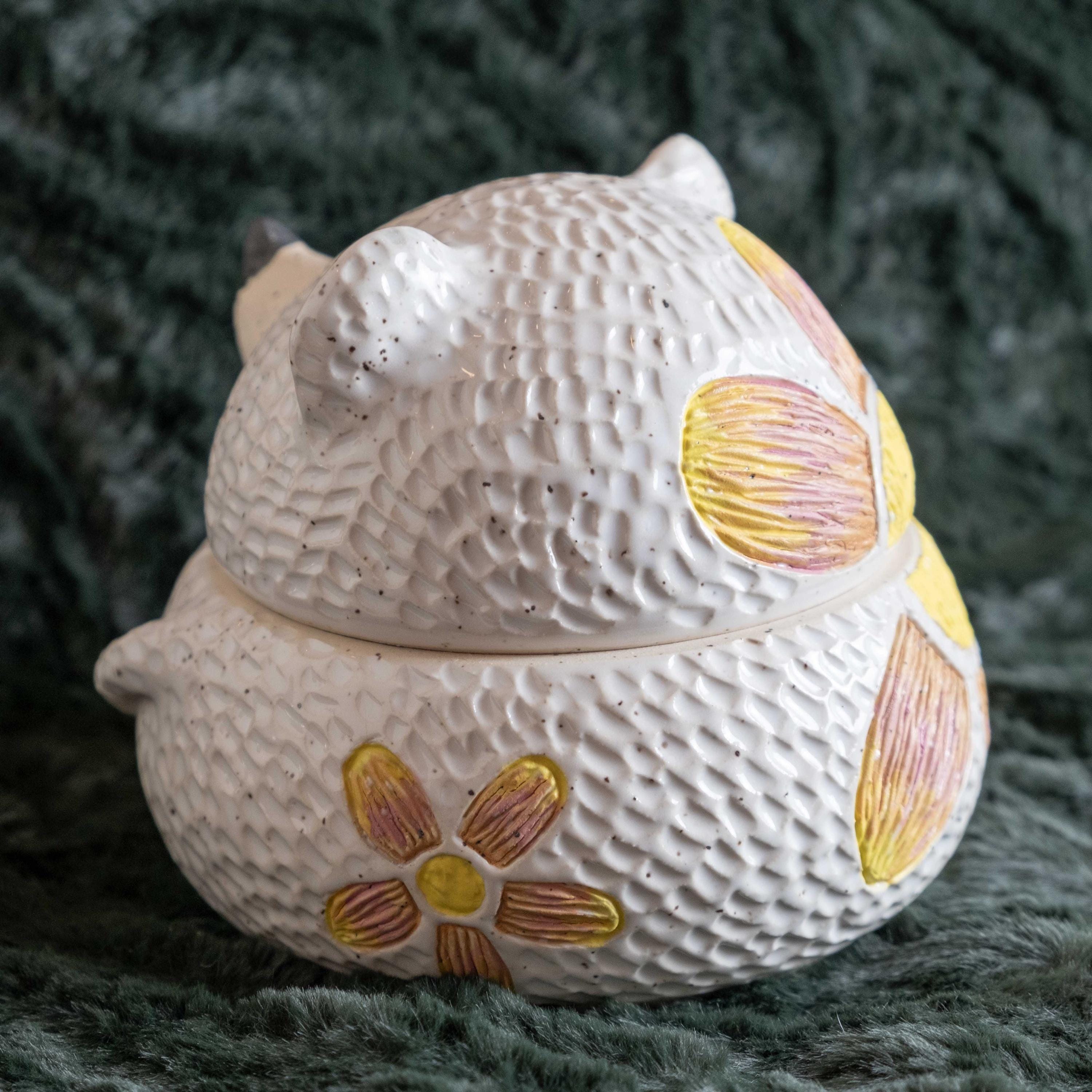 This chonky guy is hand-thrown from scratch on the wheel, then sculpted and carved to create the cutest, cheeky bear cookie jar! The carved faux fur texture is chilly and whimsical. This piece will brighten your space and is the perfect spot to store wrapped candies, cookies, jewelry, or other nicknacks. The seal is close to air tight, a good fit. 🤍✨