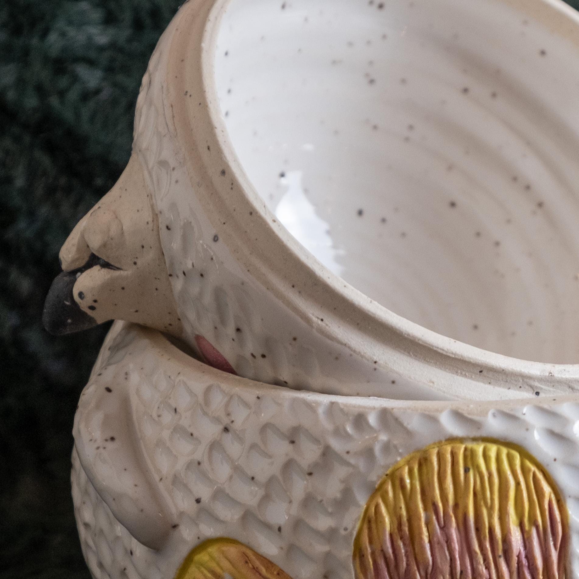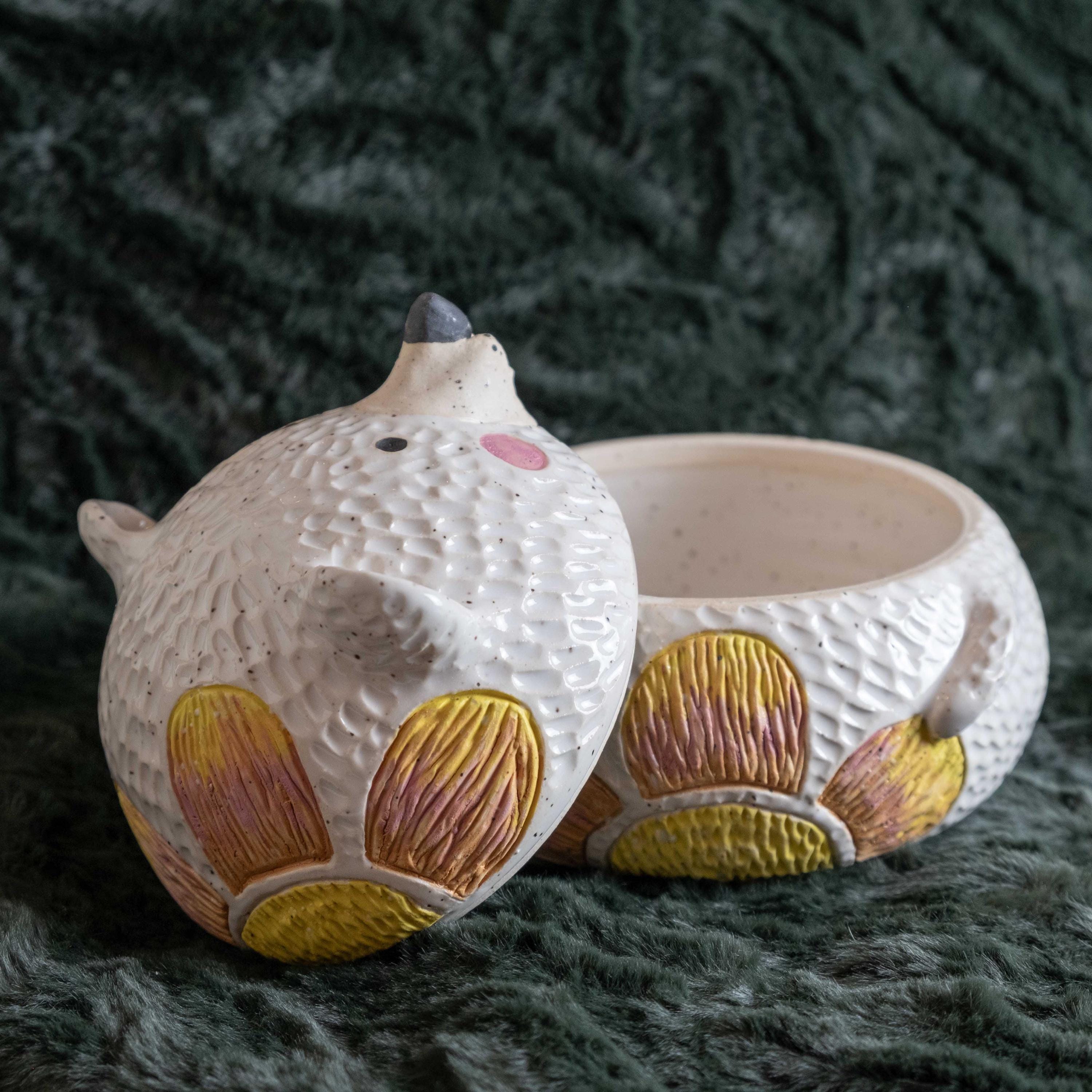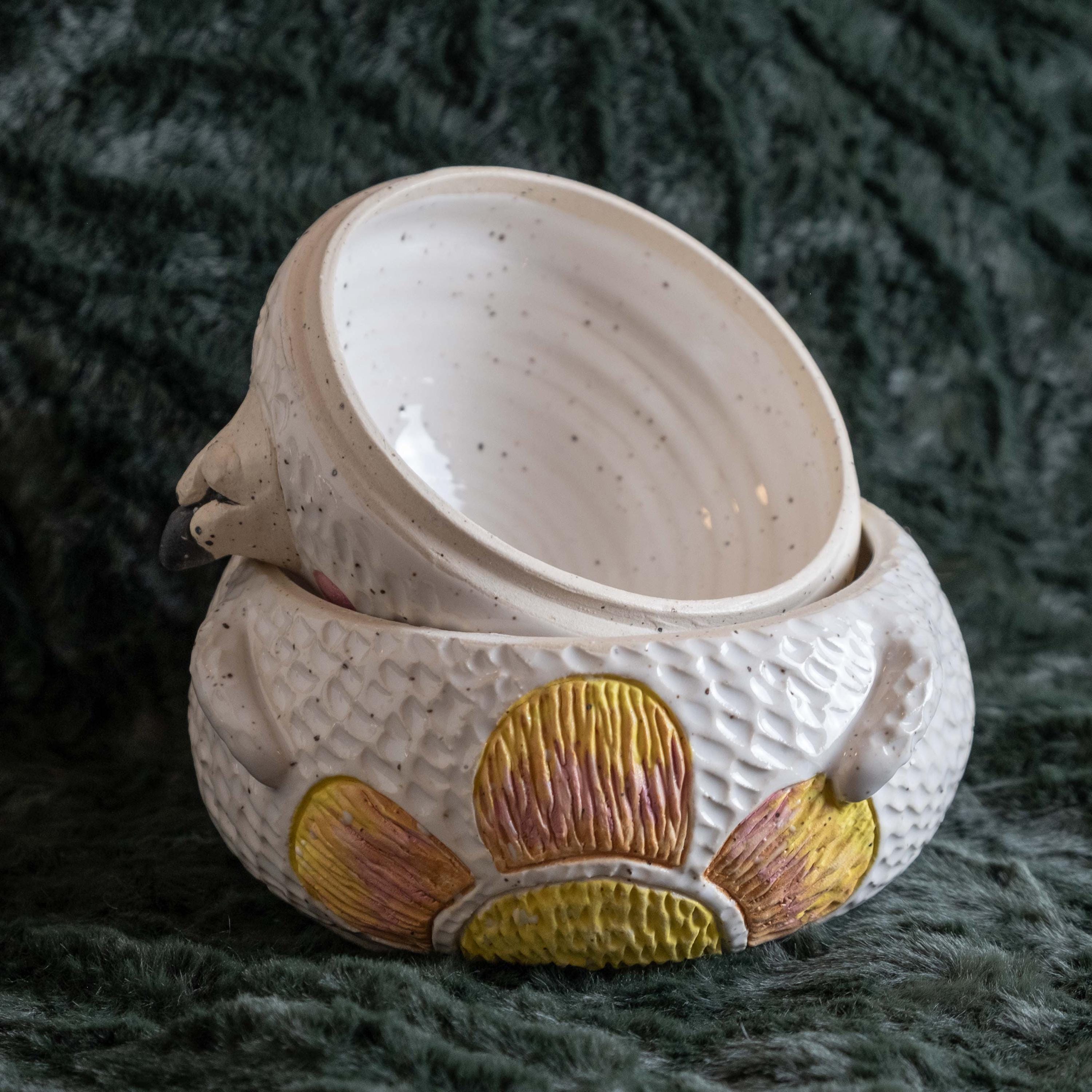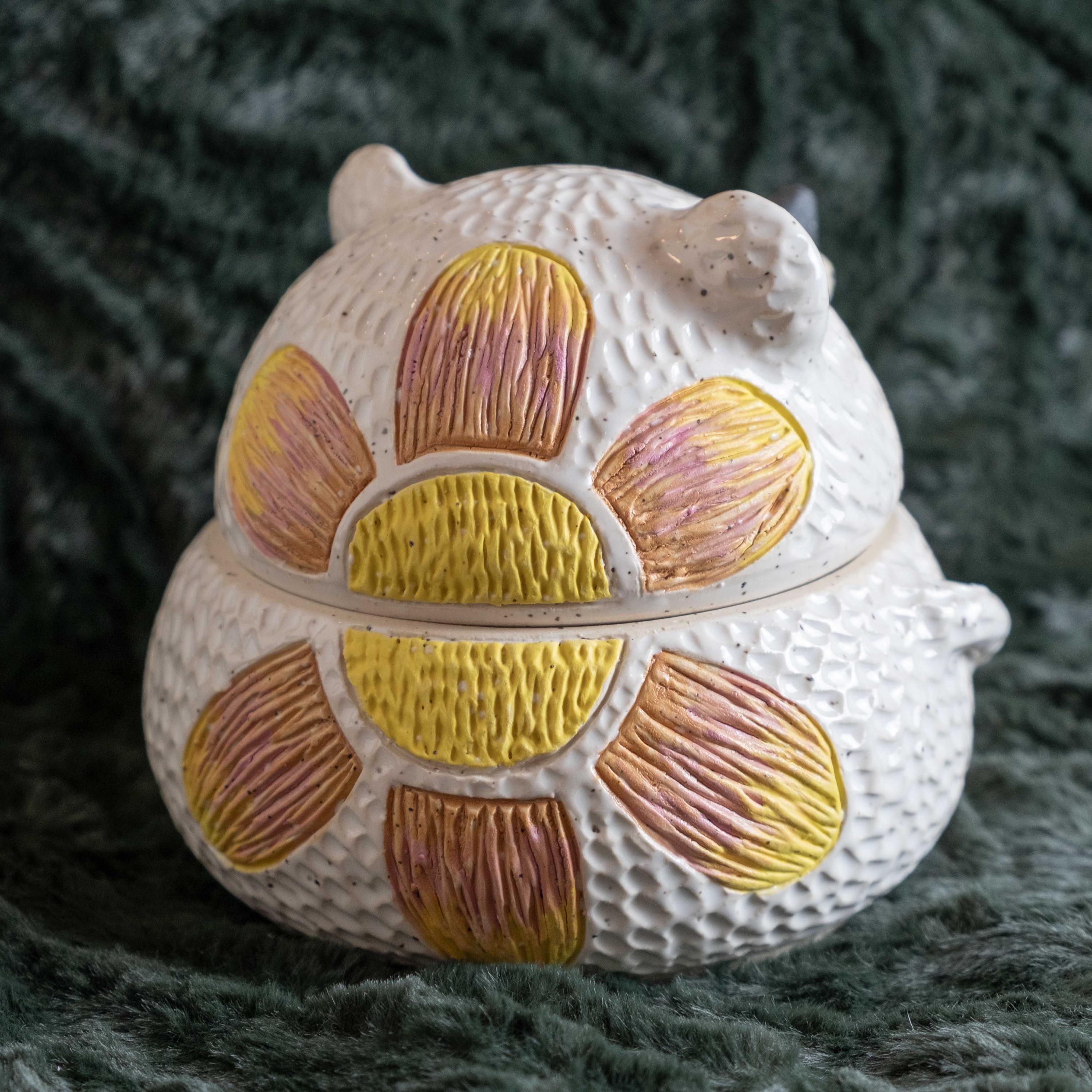 This chonky guy is hand-thrown from scratch on the wheel, then sculpted and carved to create the cutest, cheeky bear cookie jar! The carved faux fur texture is chilly and whimsical. This piece will brighten your space and is the perfect spot to store wrapped candies, cookies, jewelry, or other nicknacks. The seal is close to air tight, a good fit. 🤍✨